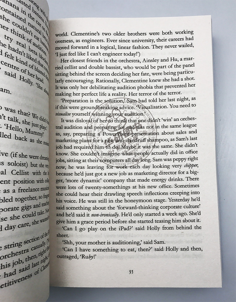 Well, not exactly an ordinary backyard, thought Erika. She crossed her legs, tucked one foot behind her ankle, and sniffed. Nobody would callVid’s backyard ordinary. Erika sat in the middle of the back row of the audience in the event room that adjoined this smartly renovated local library in a suburb forty-five minutes out of the city, not thirty minutes, thank you very much, as suggested by the person at the cab company, who you would think would have some sort of expertise in the matter. There were maybe twenty people in the audience, although there were foldout chairs available for twicethat many. Most of the audience were elderly people, with lively, expectant faces. These were intelligent, informed senior citizens who had come along on this rainy yet again, would it ever end morning to collect new and fascinating information at their local CommunityMatters Meeting. “I saw the most interesting woman speak today,” they wanted to tell their children and grandchildren. Before she came, Erika had looked up the library’s website to see how it described Clementine’s talk.The blurb was short, and not very informative: Hear Sydney mother and well-known cellist Clementine Hart share her story: “One Ordinary Day.” Was Clementine really a “well-known” cellist? That seemed a stretch. The five-dollar fee for today’s event included two guest speakers, a delicious homemade morning tea and the chance to win a luck door prize. The speaker after Clementine was going to talk about Council’s controversial redevelopment plan for the local pool. Erika could hear the distant gentle clatter of cups and saucers being set up for the morning tea now. She held her flimsy raffle ticket for the lucky door prize safe on her lap. She couldn’t be bothered putting it in her bag and then having to find it when they drew the raffle. Blue, E 24. It didn’t have the look of a winning ticket.