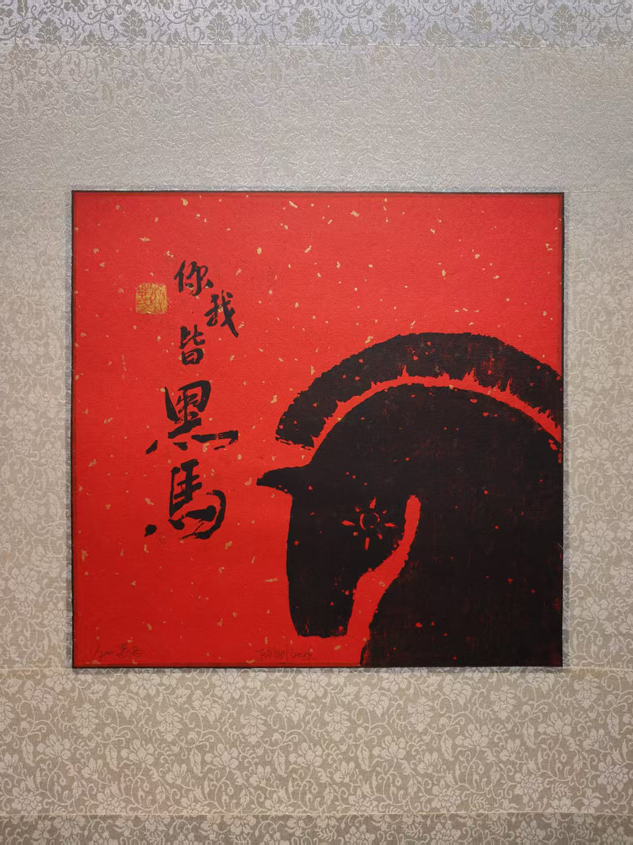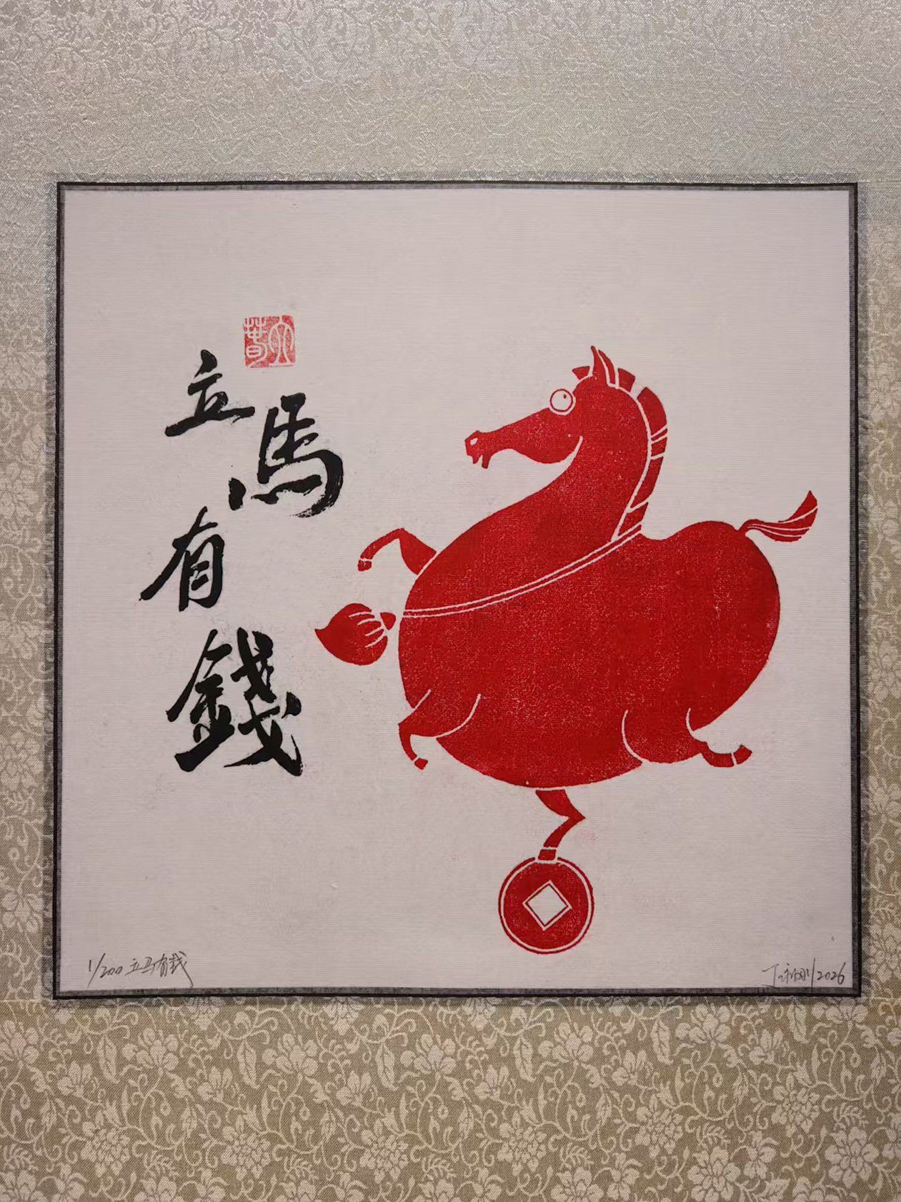 这幅作品以传统年画般的诙谐与直白,送上最直接的祝福。丰腴健硕的马匹,象征力量、丰饶与稳健前行;蹄下所踏的古铜钱,外圆内方,既是财富的象征,也暗合“世事洞明、内心方正”的处世智慧。题为“立马有钱”,是即刻生效的吉祥宣告,寓意财富与好运速速抵达,稳当掌握,为新的一年注入饱满的底气与盼头。