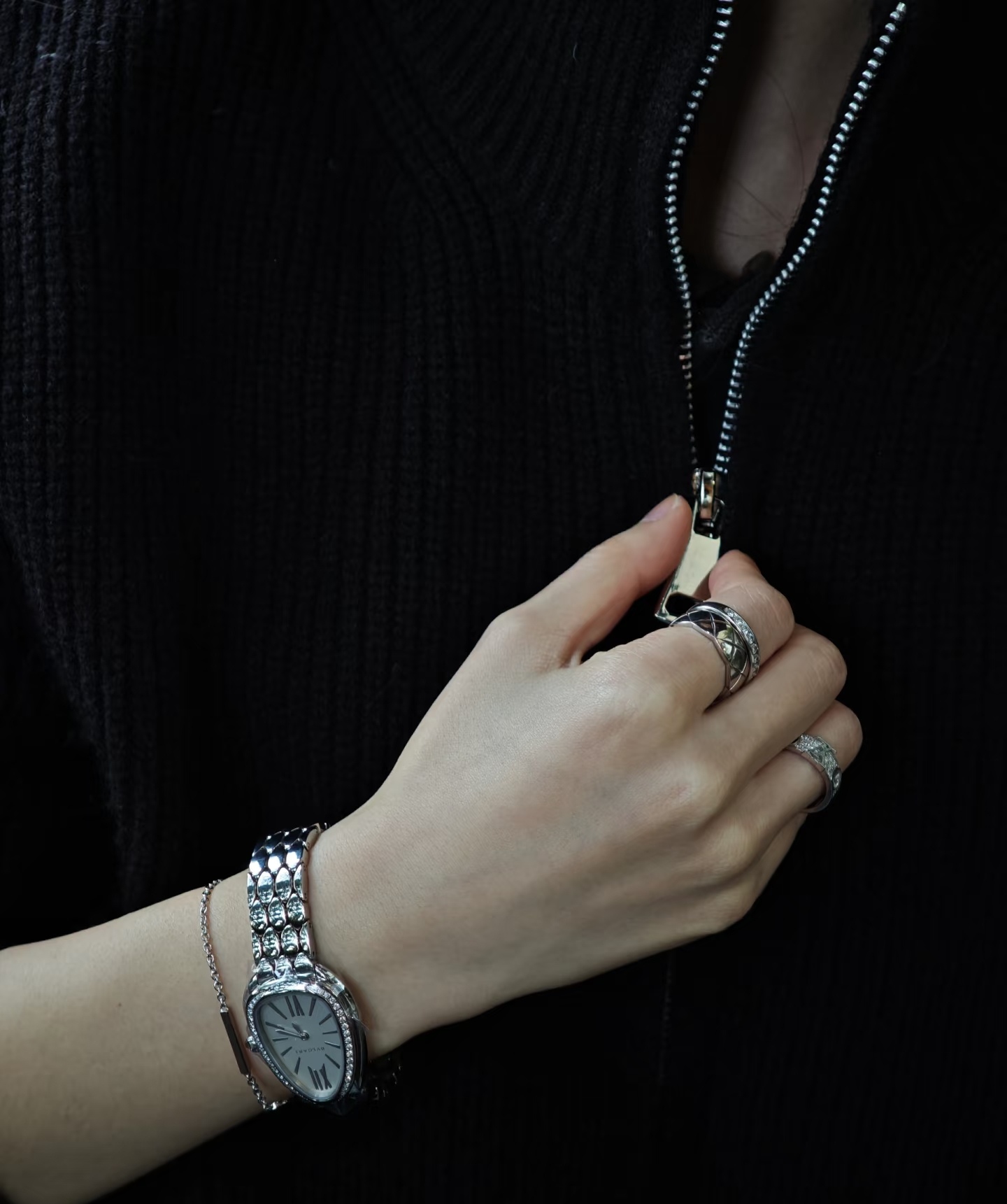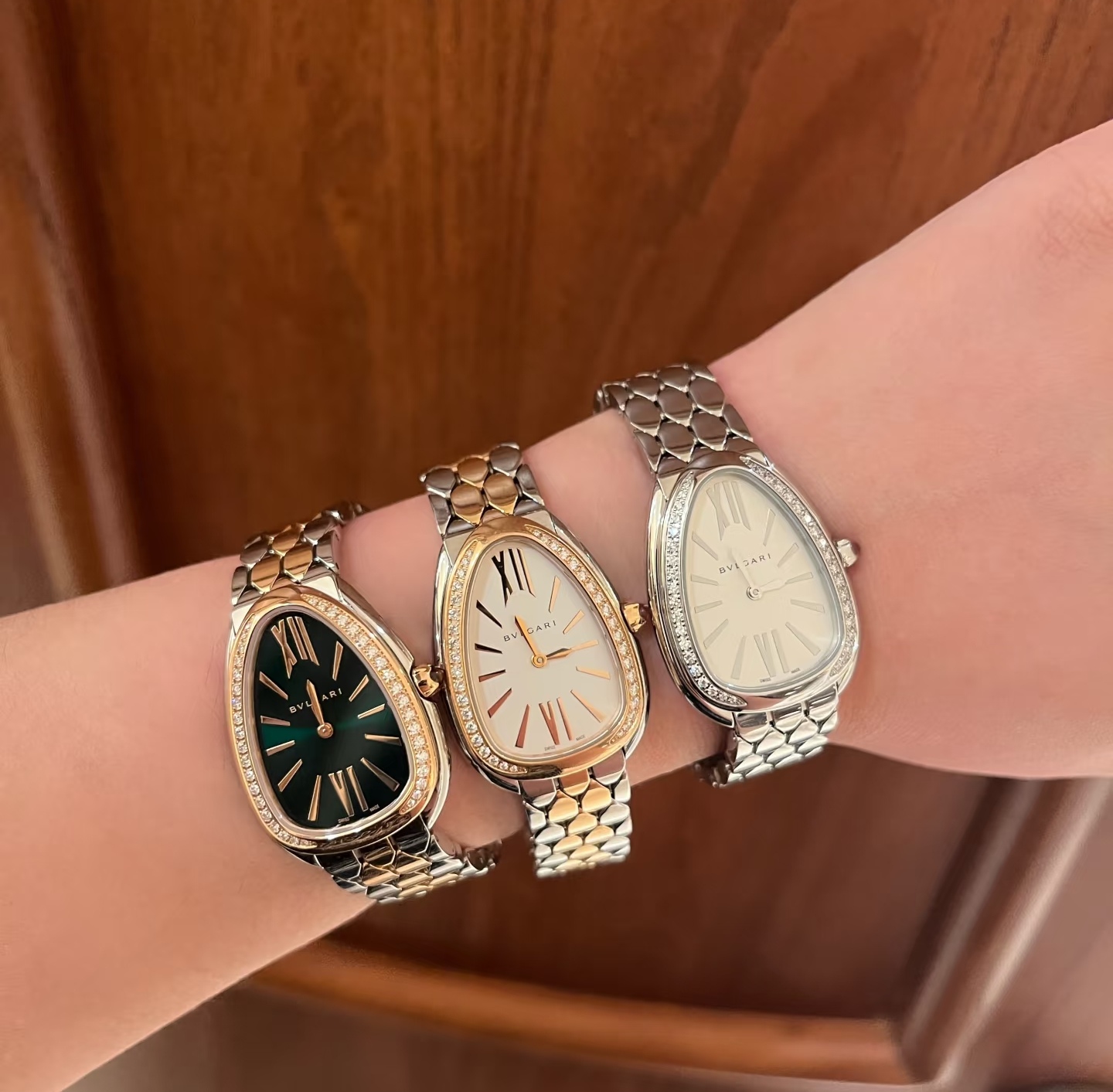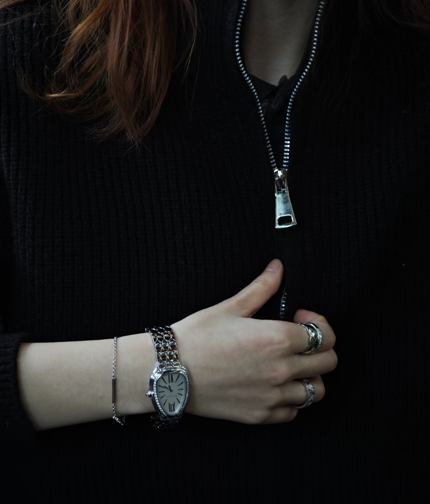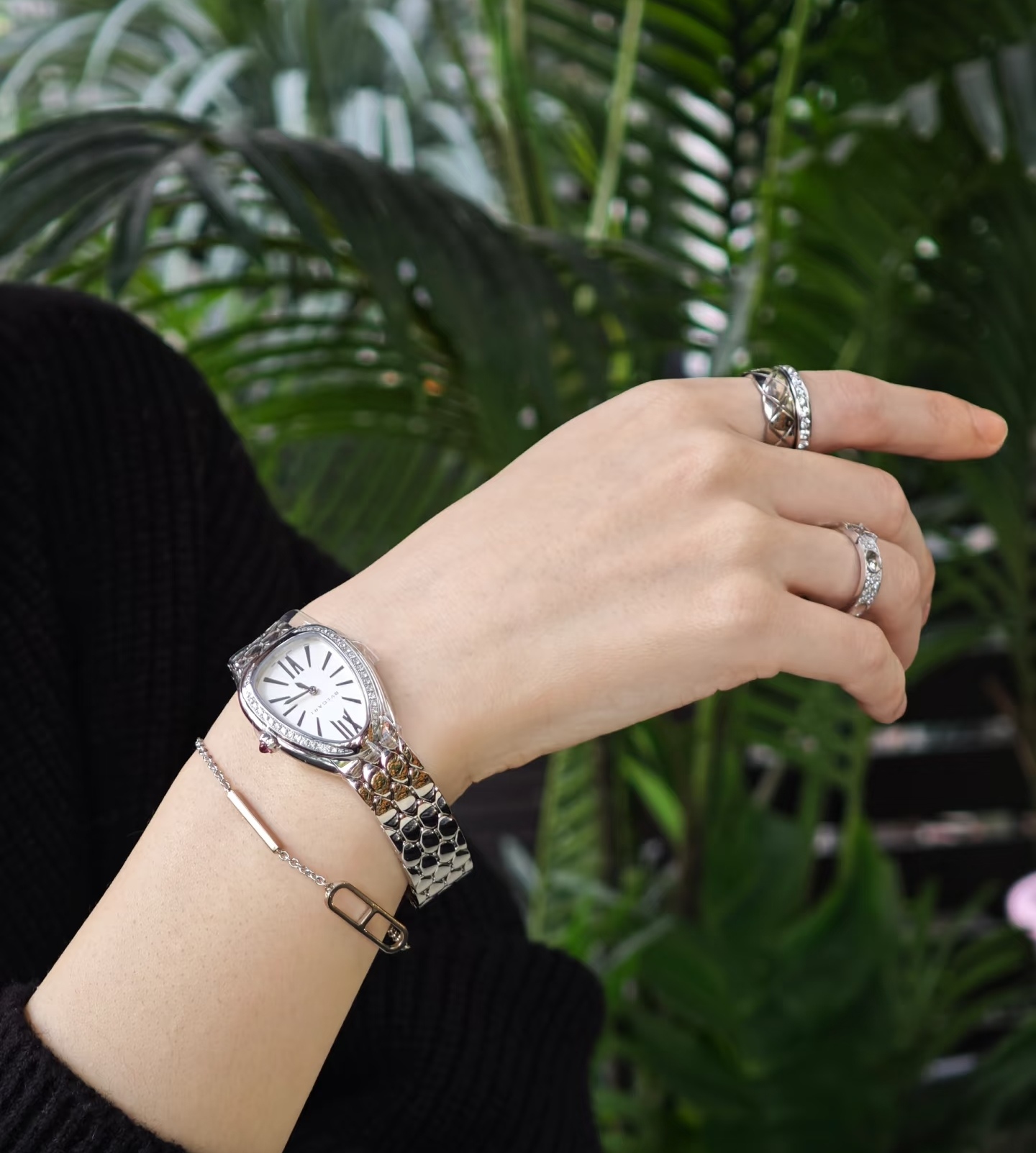 鎏光蛇影好似灵蛇腕间缠绕缱绻,舒适而柔顺的佩戴感觉,腕表采用冷银白色蛇头logo造型,