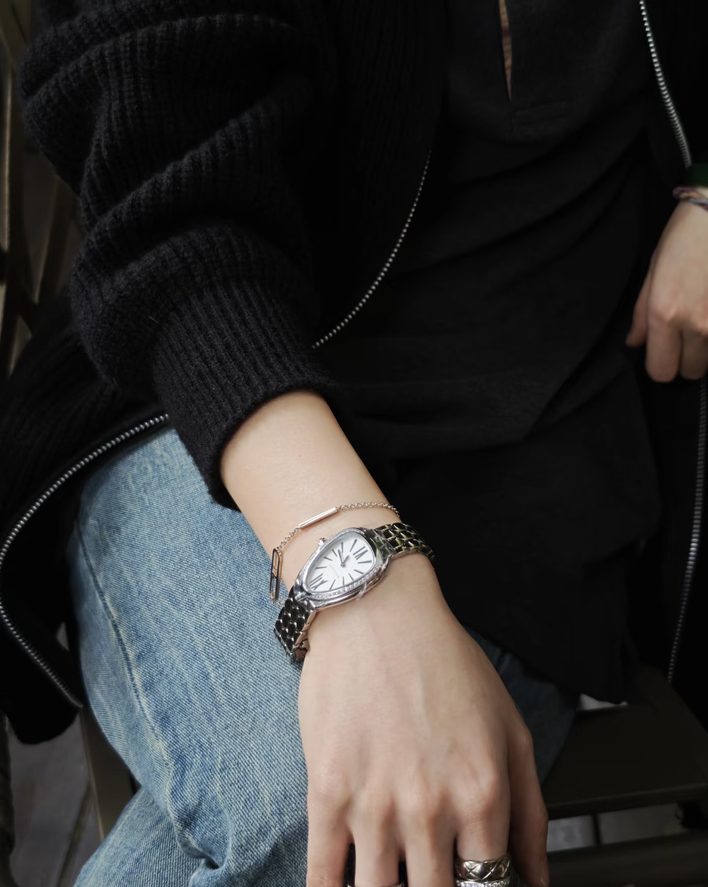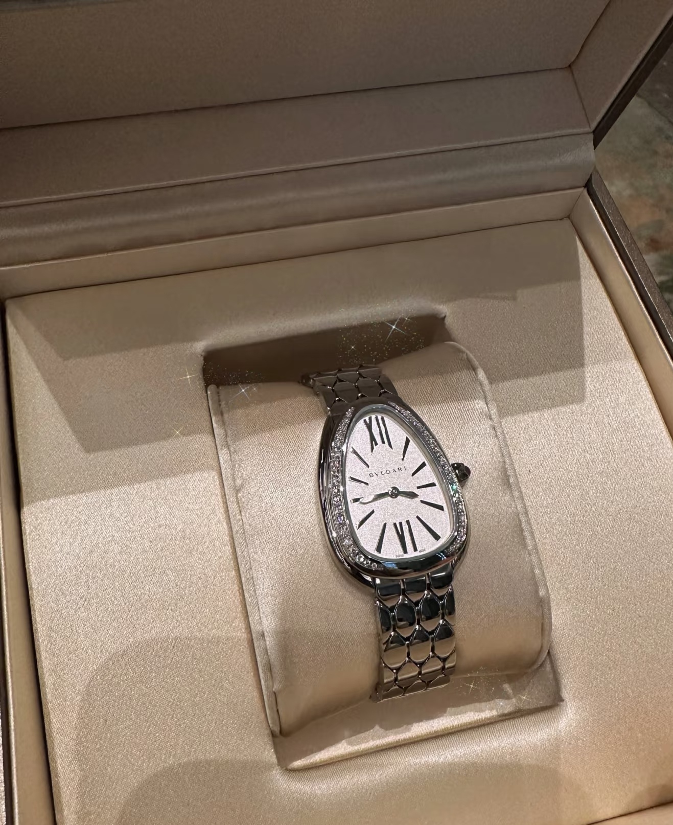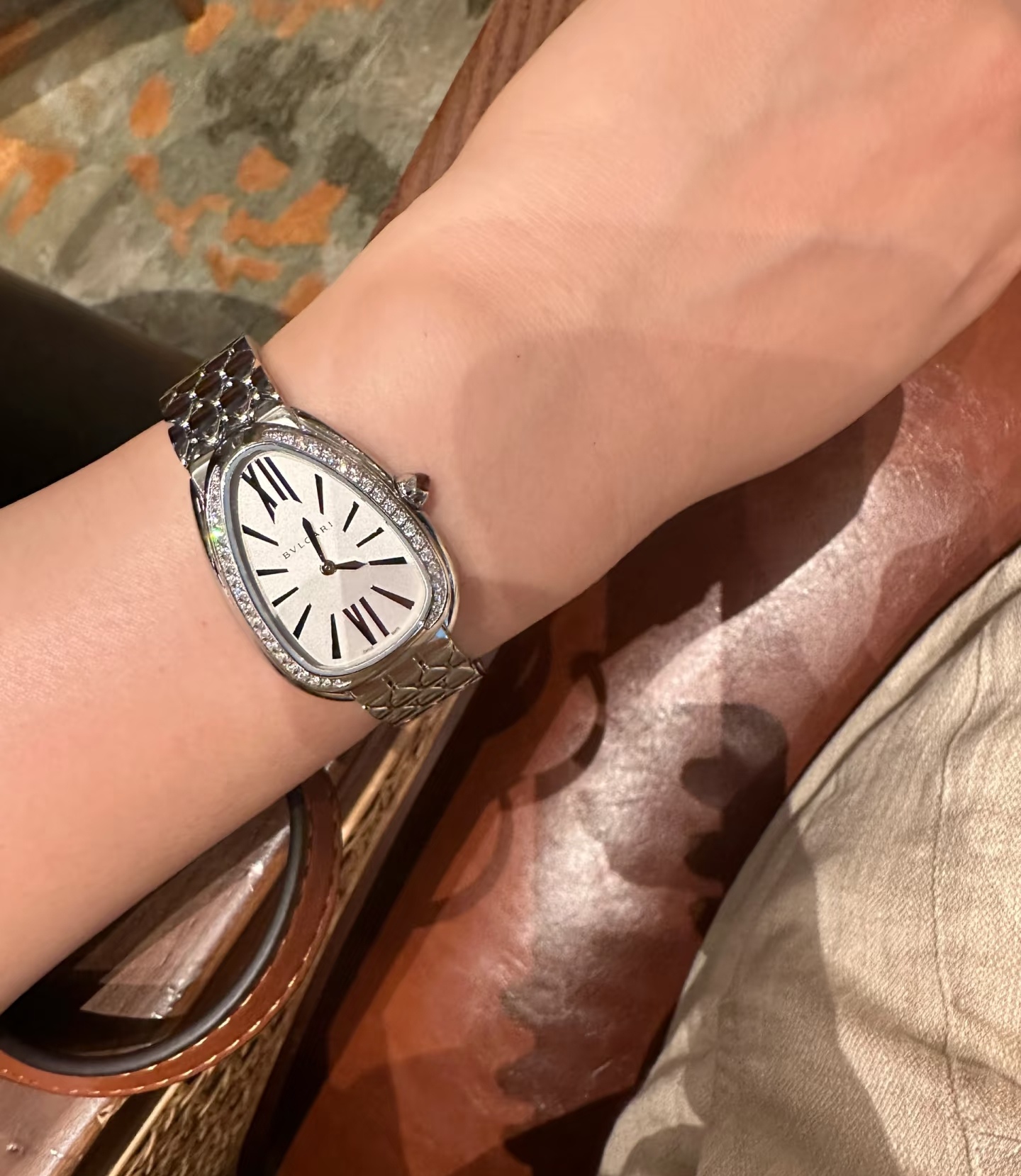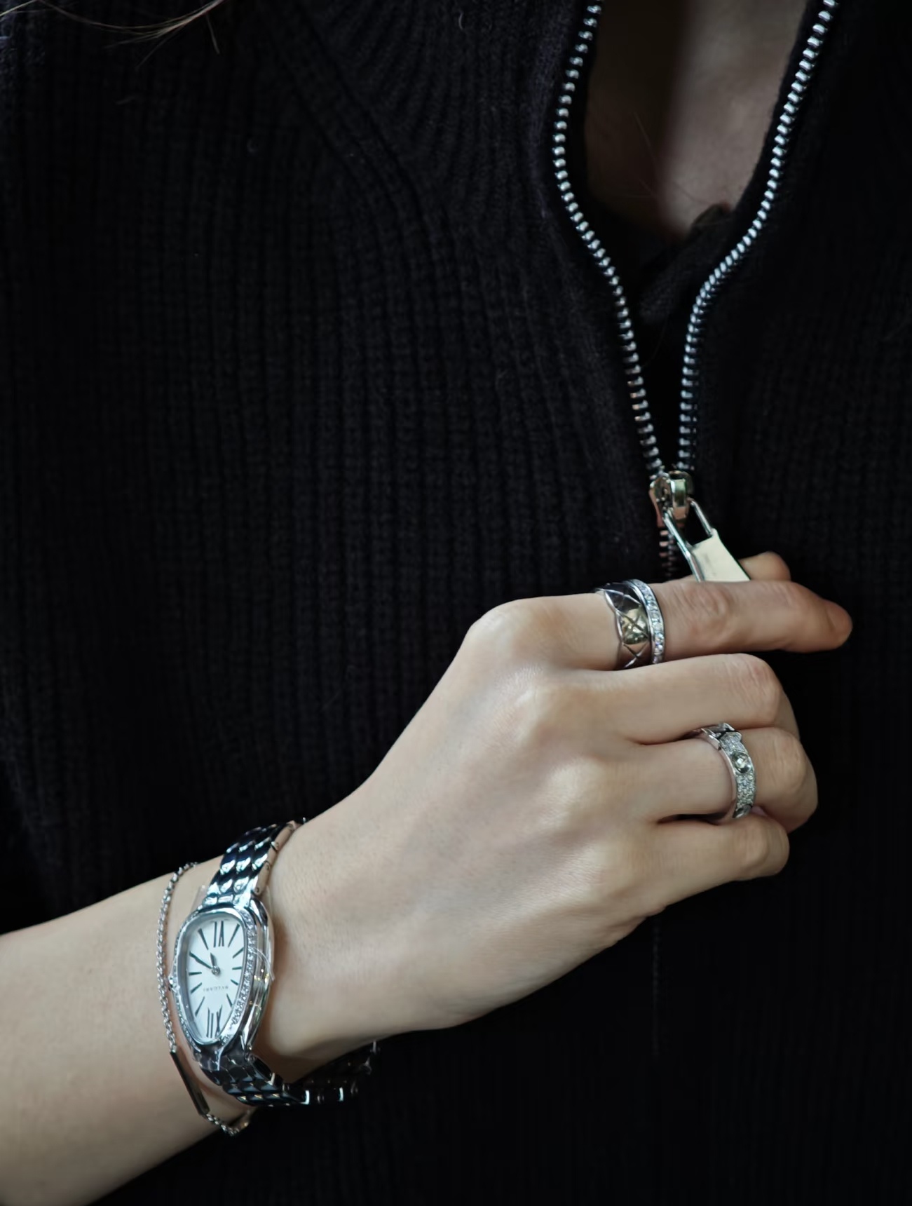 鎏光蛇影好似灵蛇腕间缠绕缱绻,舒适而柔顺的佩戴感觉,腕表采用冷银白色蛇头logo造型,
