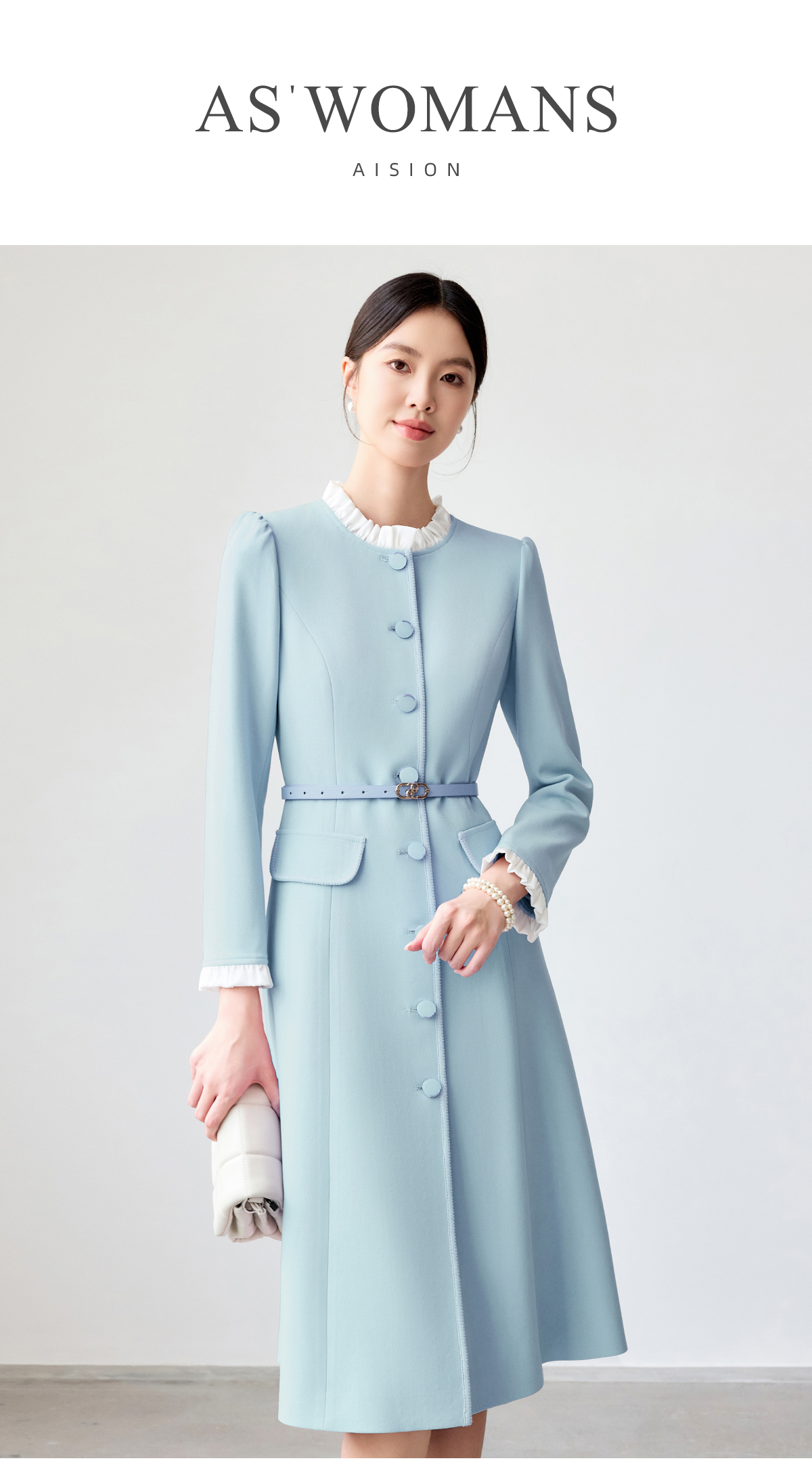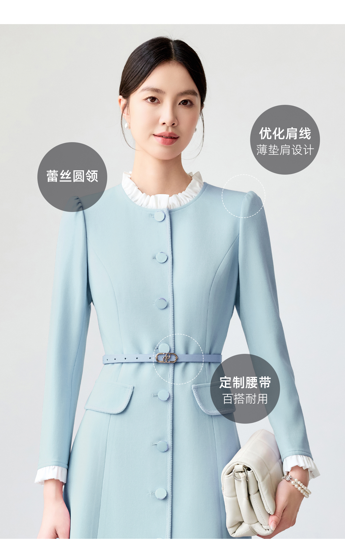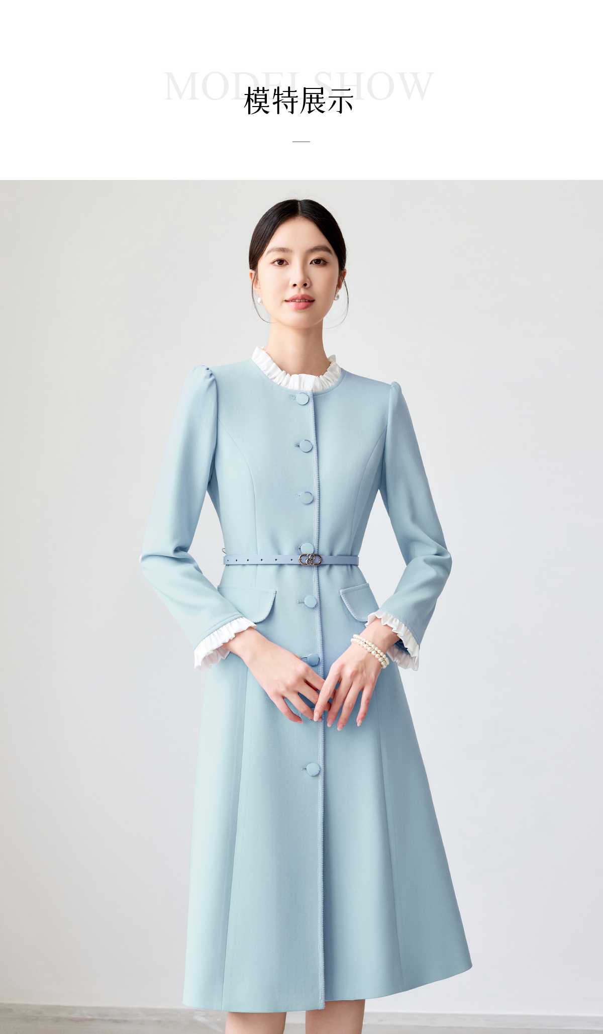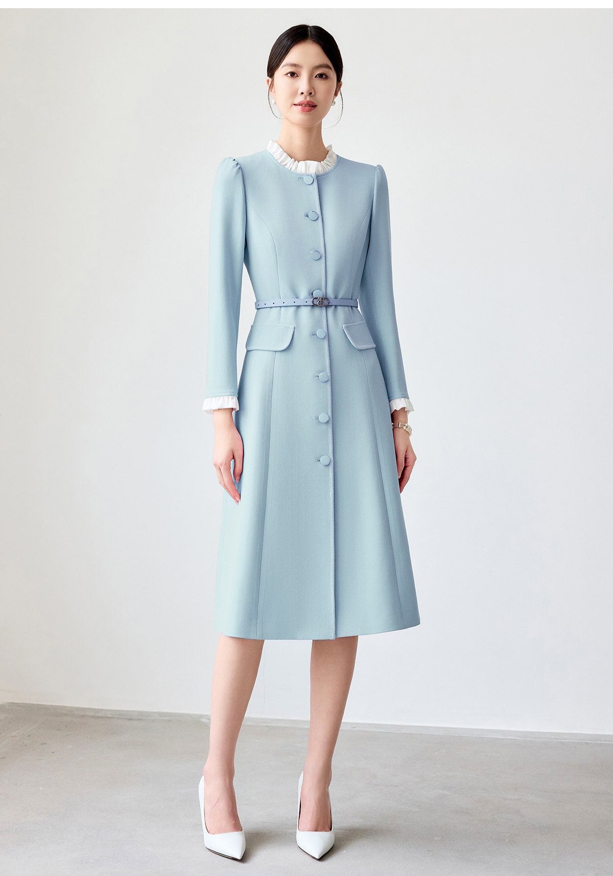 艾尚臣蓝色连衣裙女2025春新款木耳边拼色简约纯色长袖裙子工作服