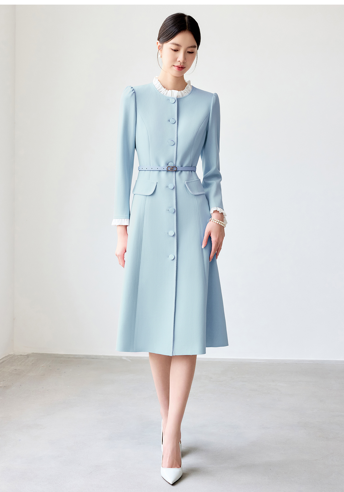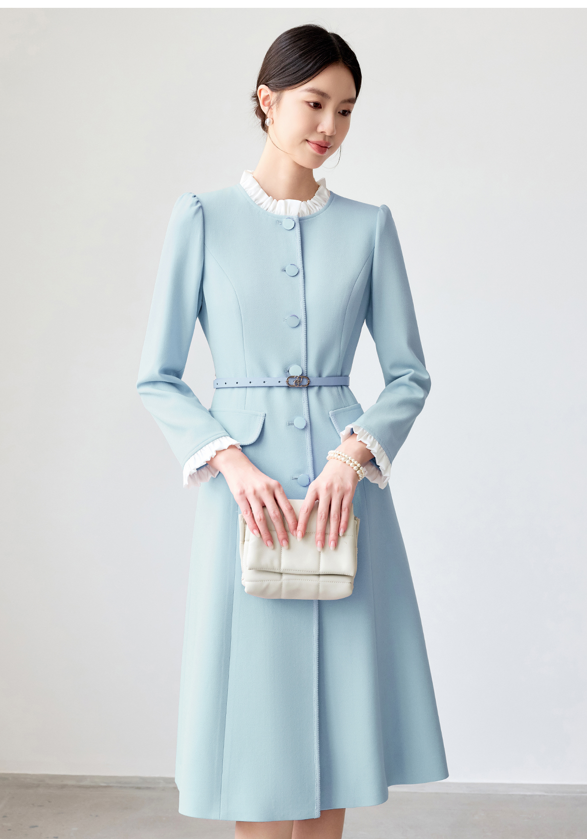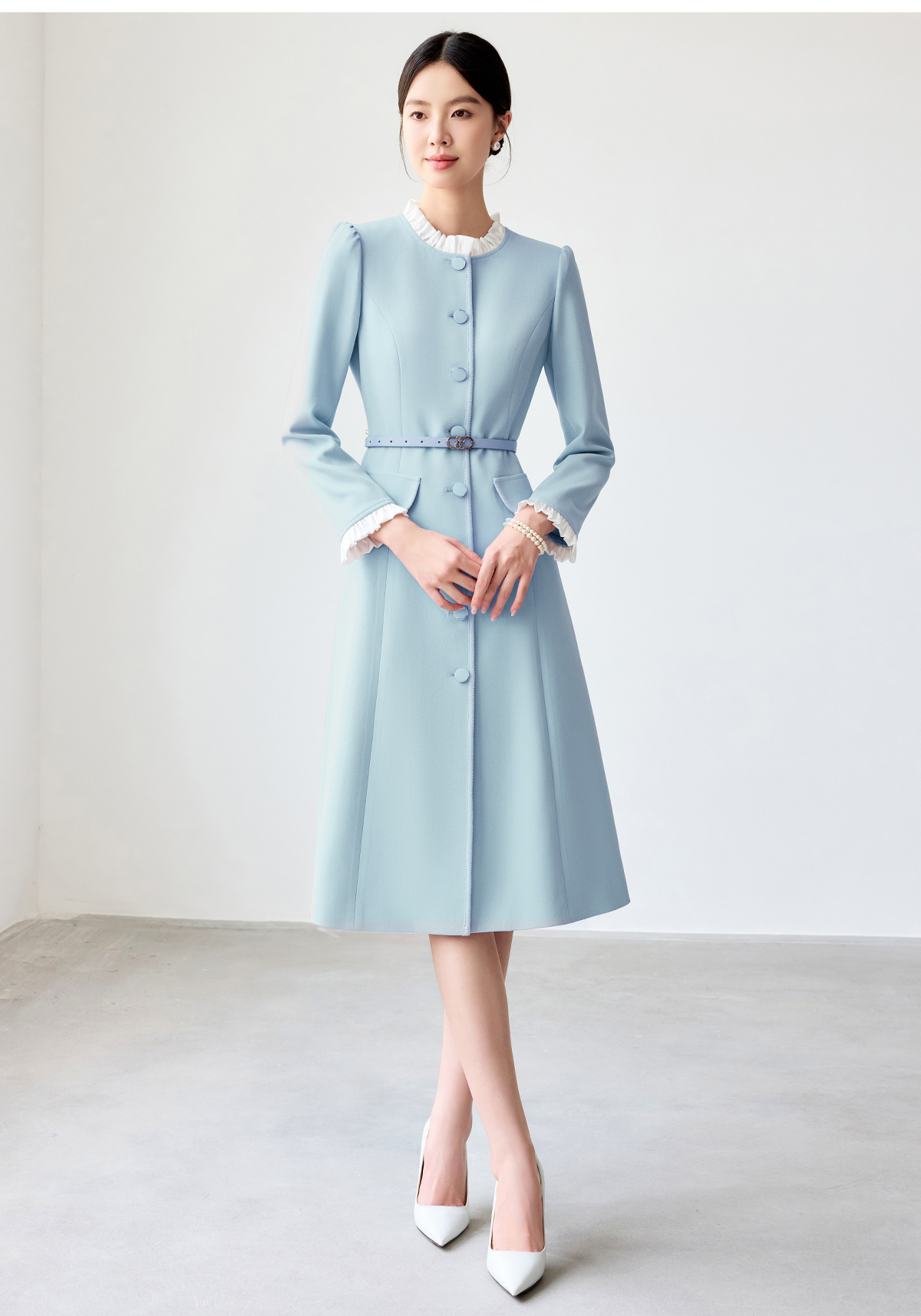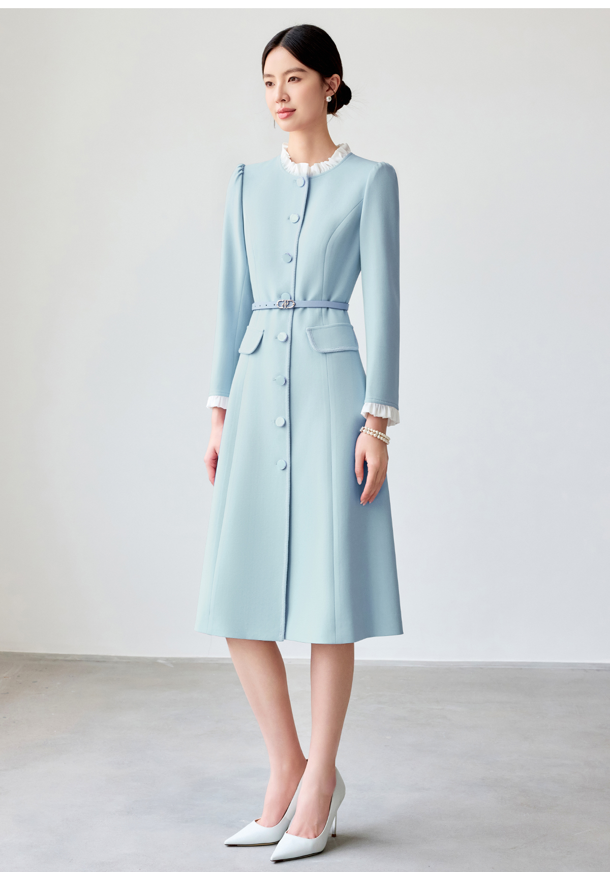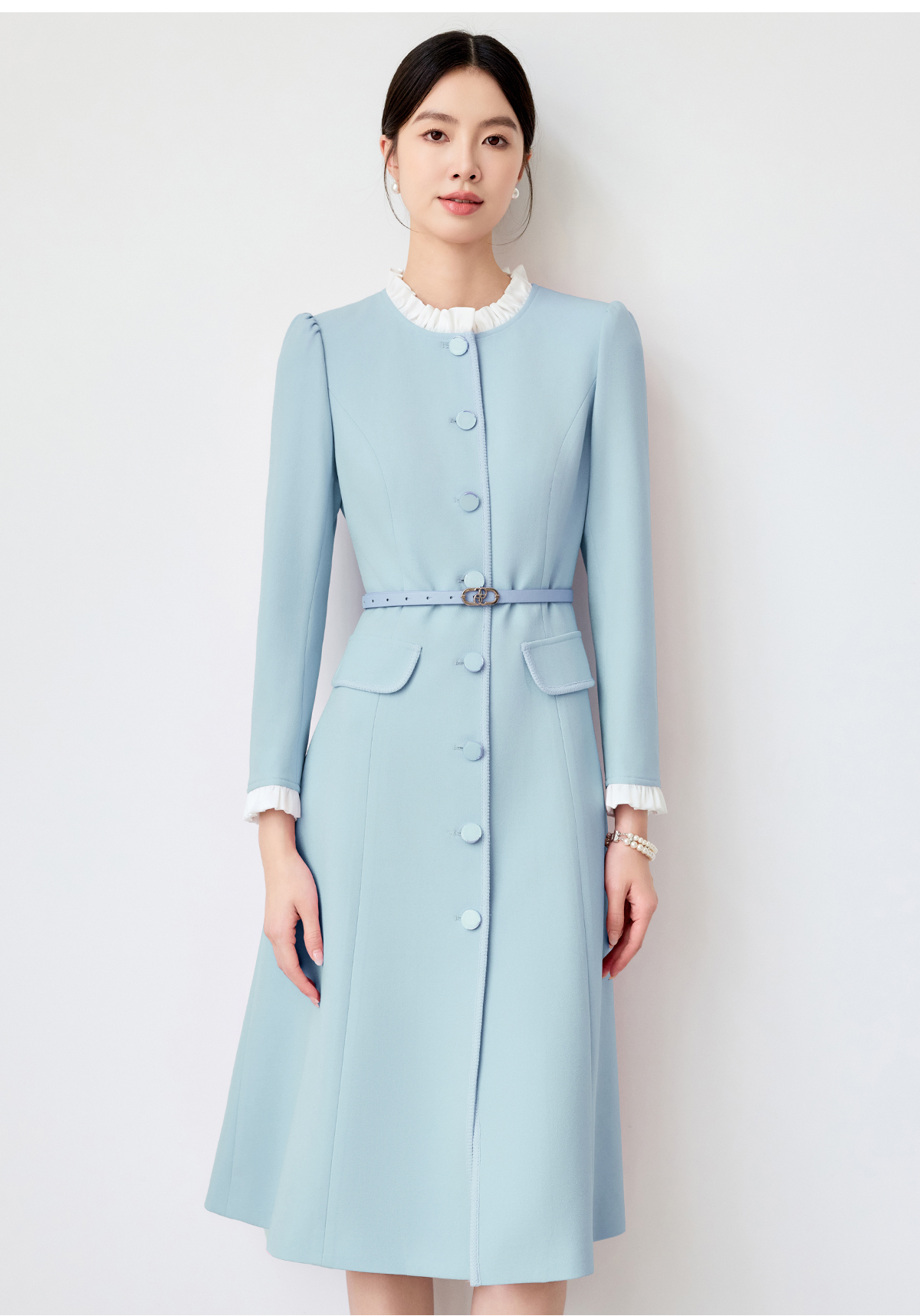 艾尚臣蓝色连衣裙女2025春新款木耳边拼色简约纯色长袖裙子工作服