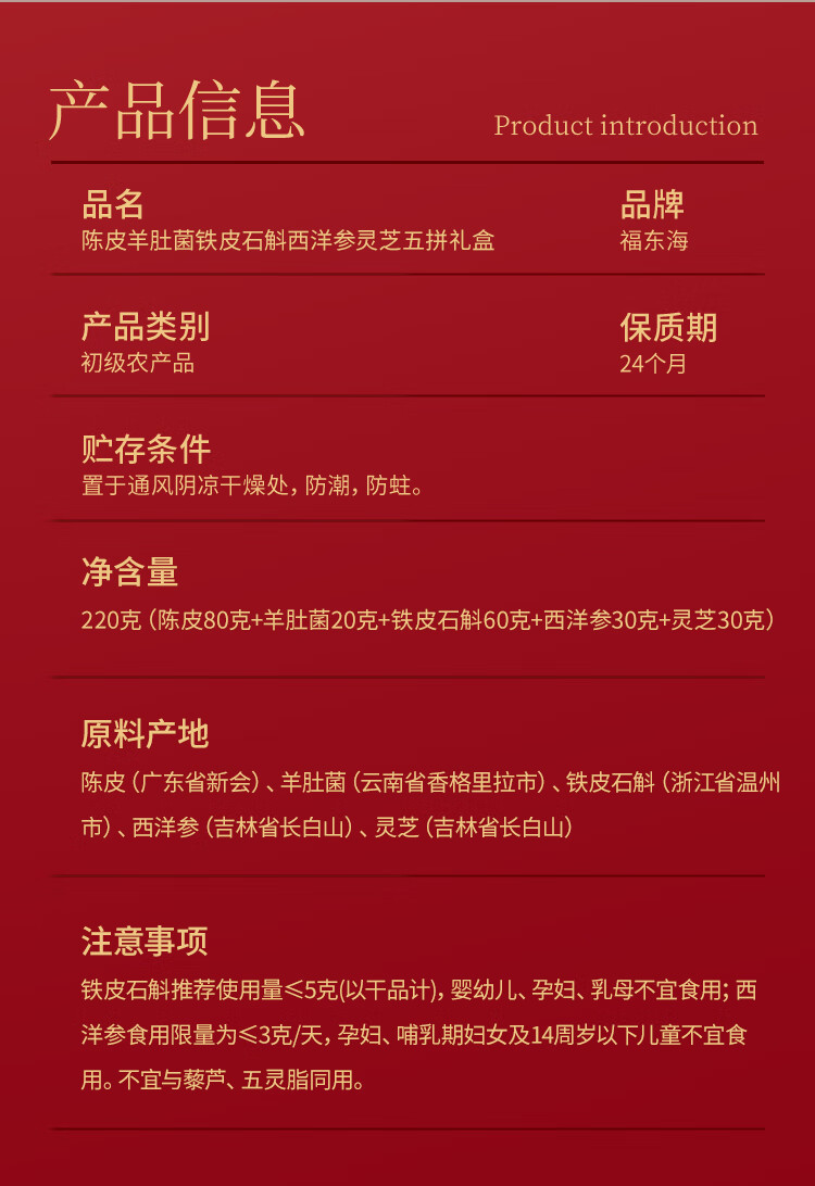 福东海 陈皮羊肚菌铁皮石斛西洋参灵芝五拼礼品礼盒 送父母长辈礼物