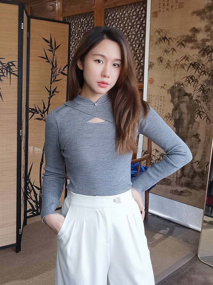 1、旗袍领,中间做了一个扇形,设计感扇形镂空,半活夹片,增加一些露肤度,时尚感十足,搭配项链吊坠刚好可以露出来。明月和模特都是穿过很多次,高度刚刚好,大家不用担心走光~~