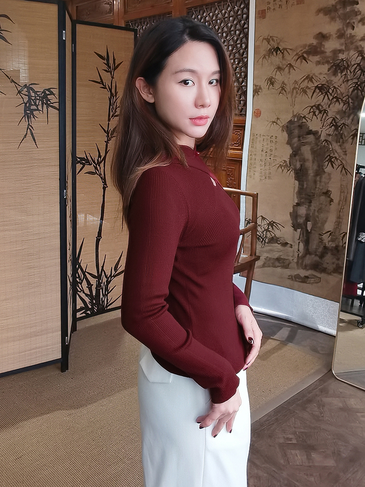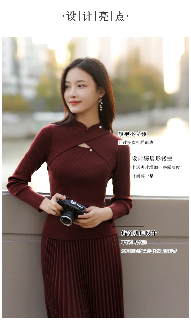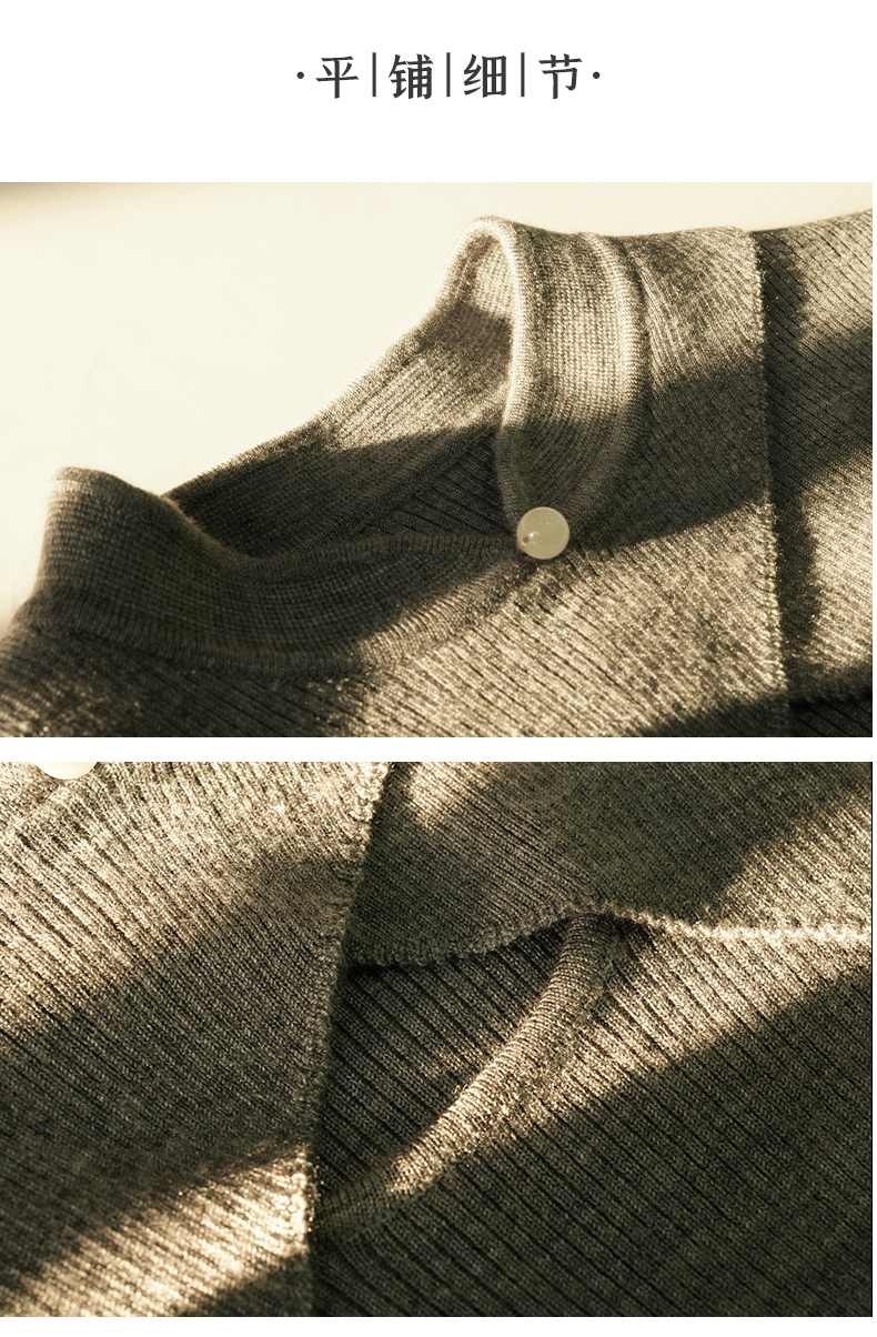 4、旗袍领经过多次打样而成,将毛衣做出这样立挺的效果对工艺的考验很大,工价不是普通毛衣可以比拟的。