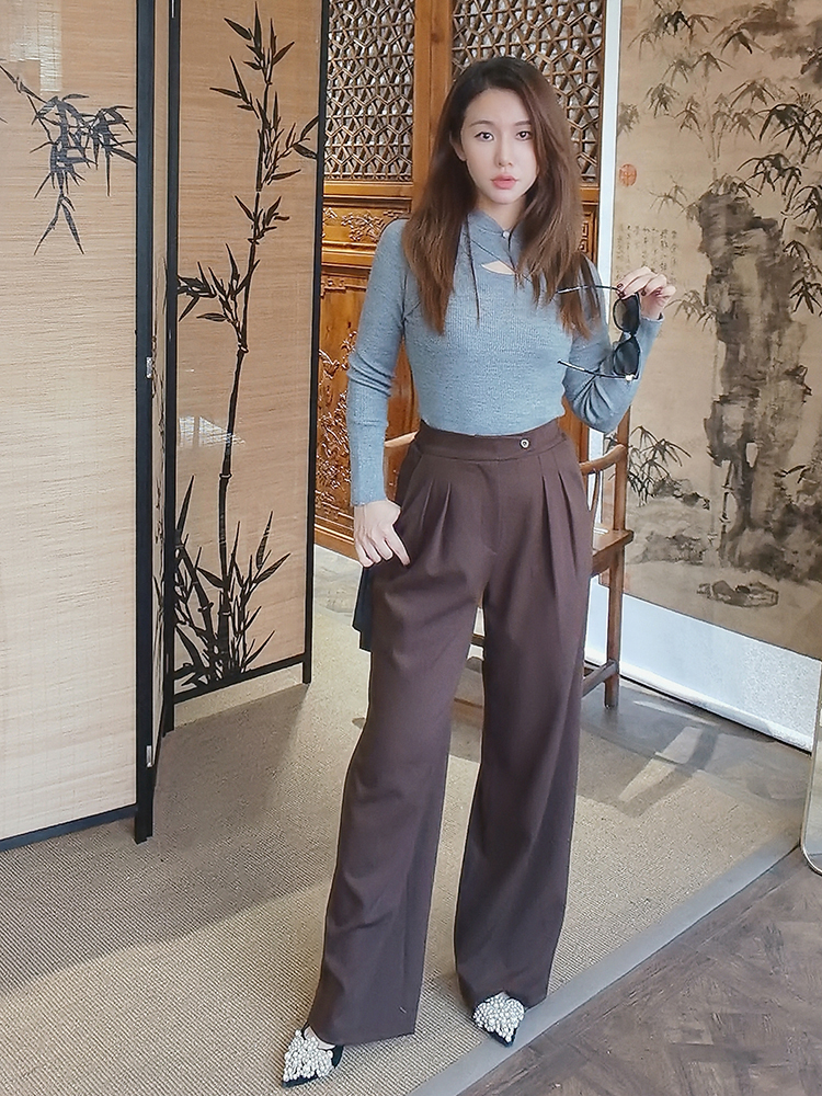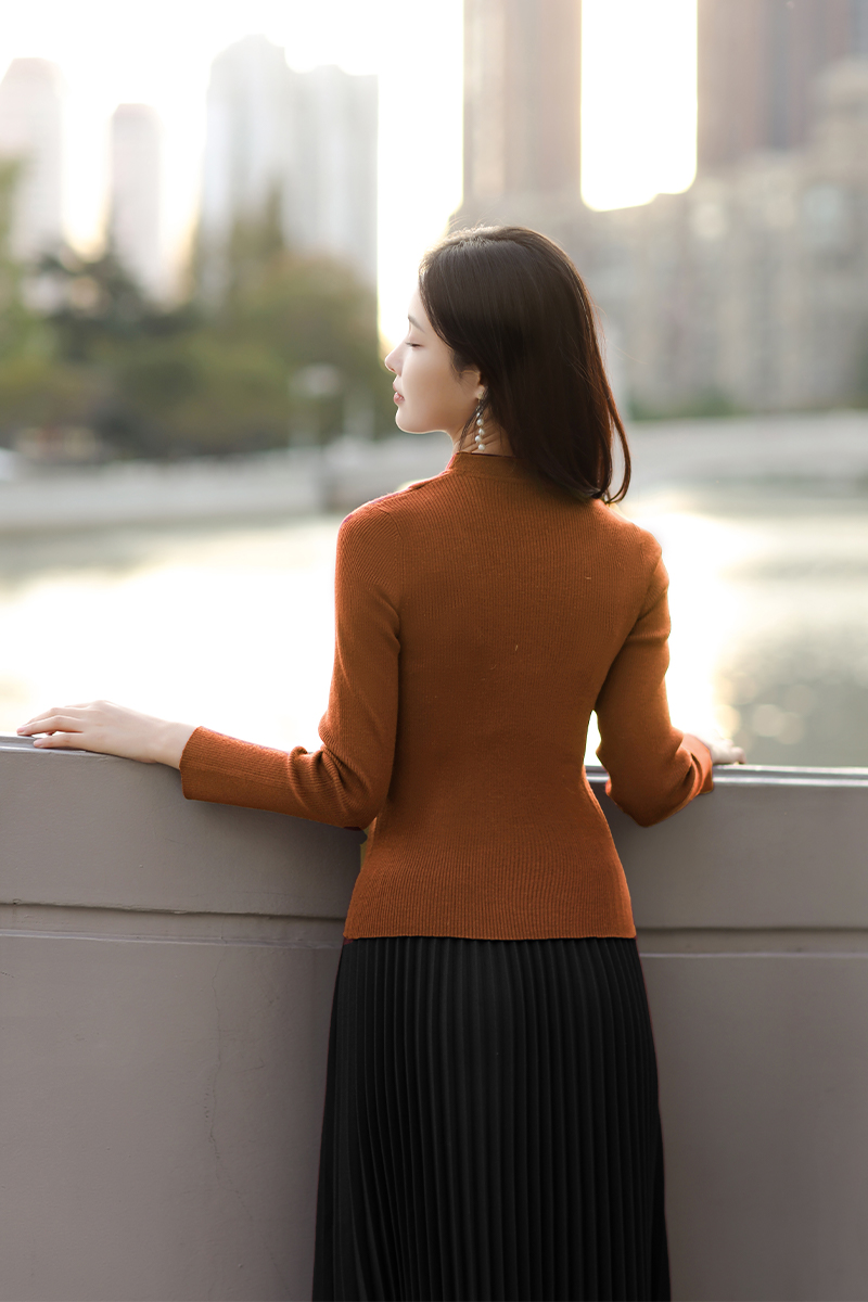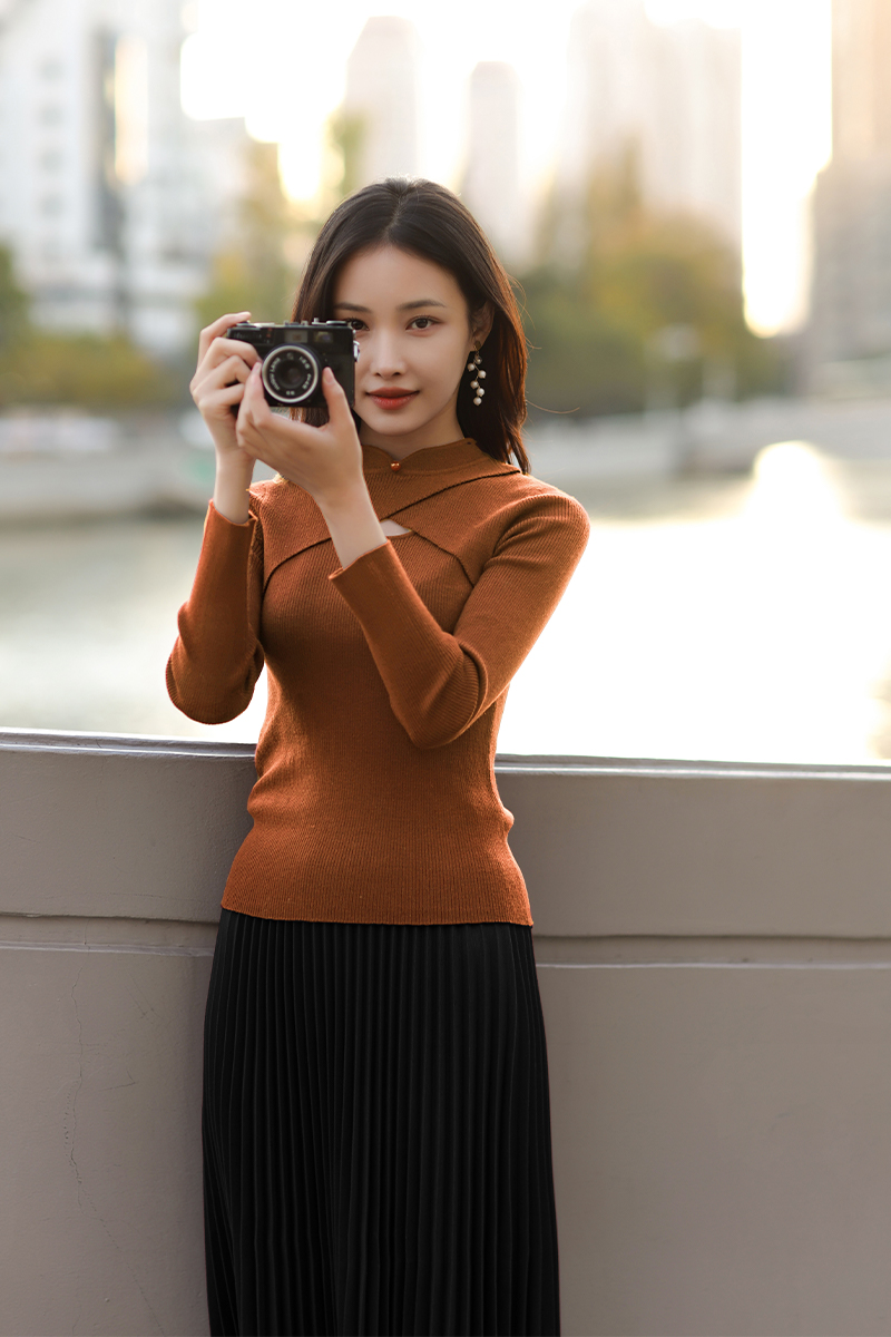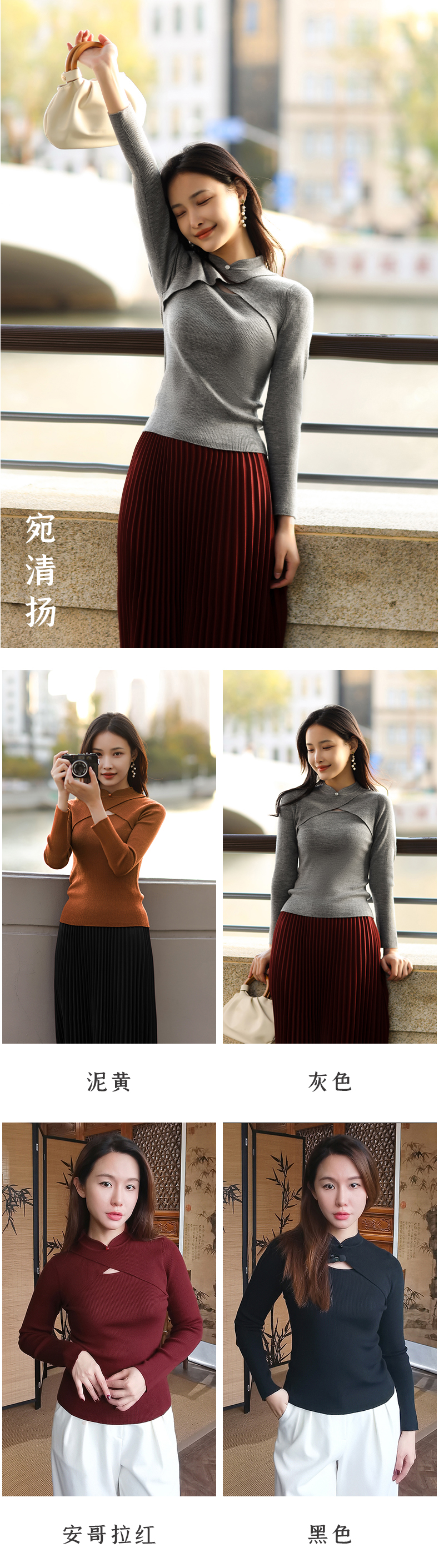 4、旗袍领经过多次打样而成,将毛衣做出这样立挺的效果对工艺的考验很大,工价不是普通毛衣可以比拟的。