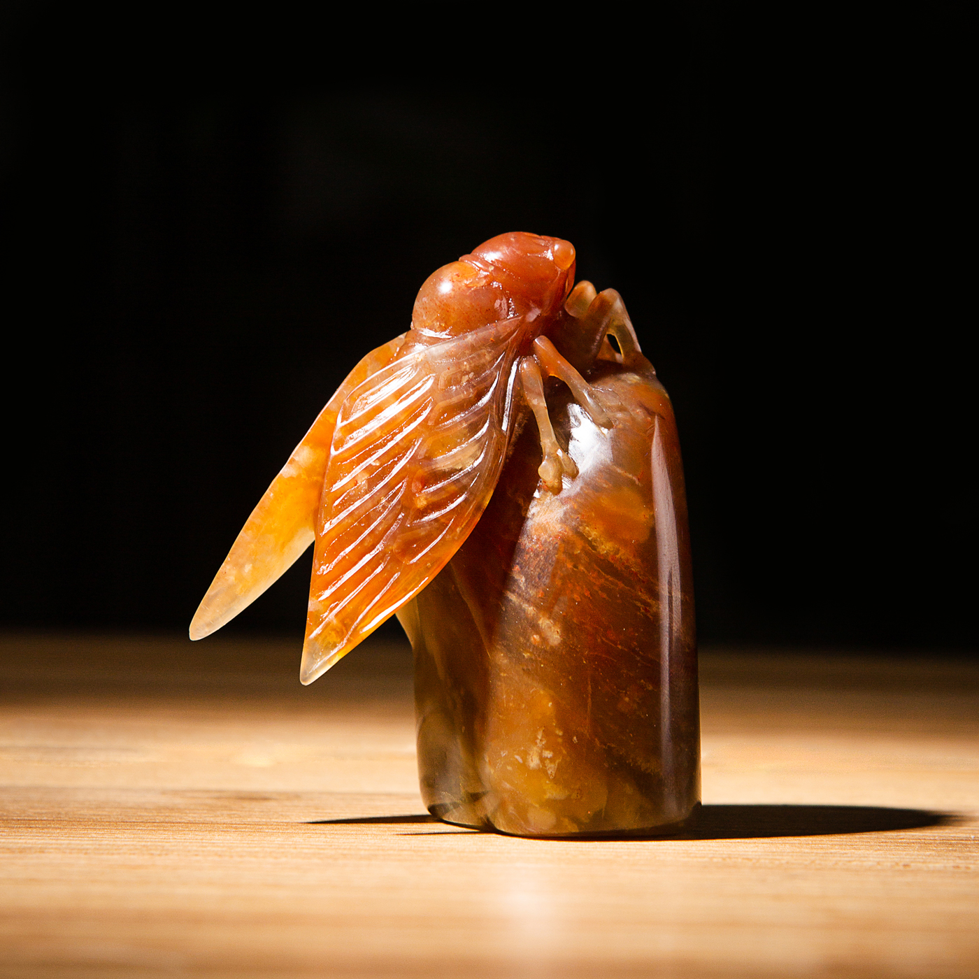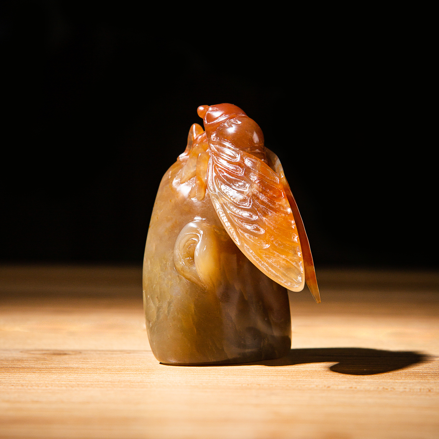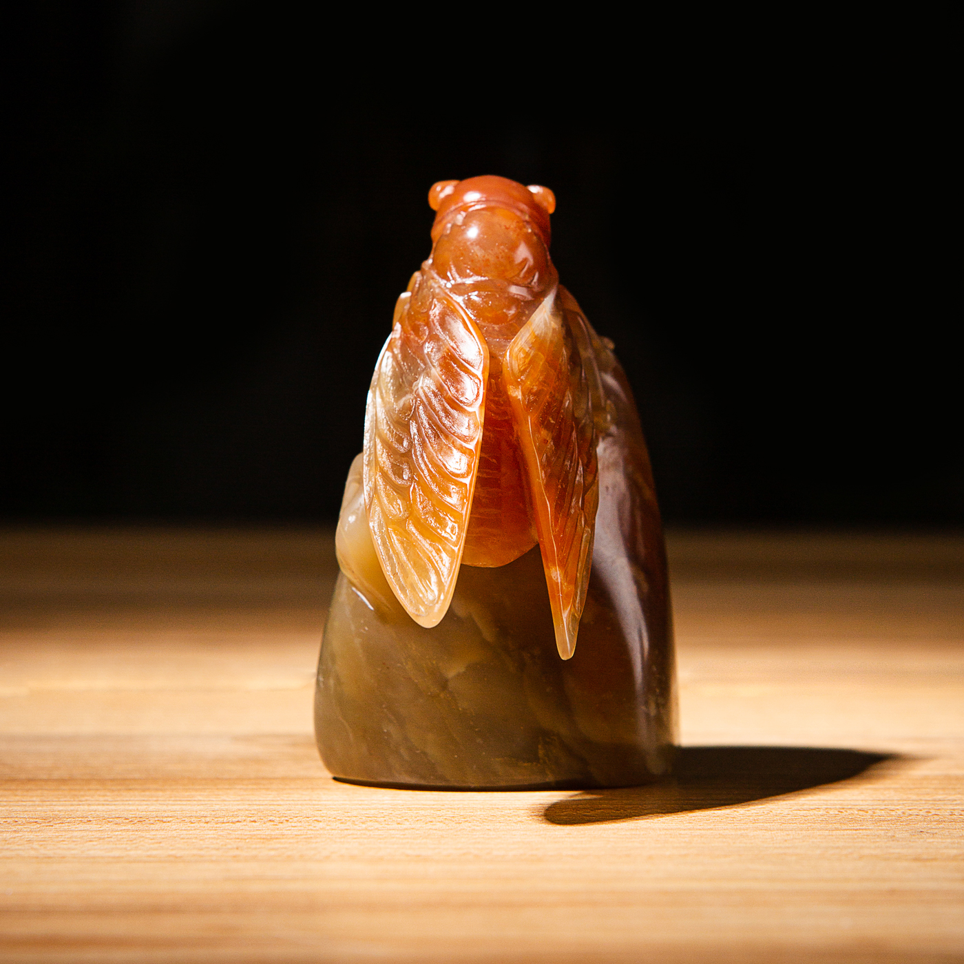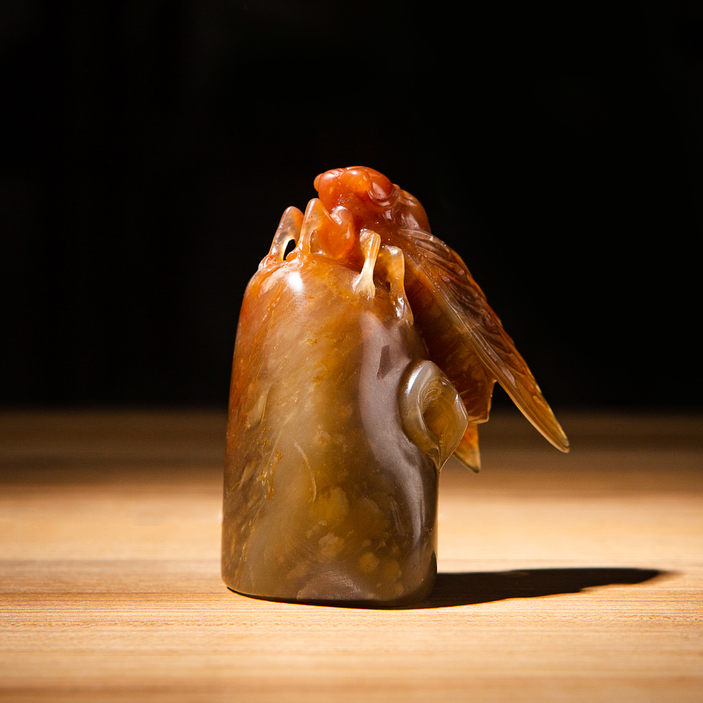 寿山石老料手雕“金蝉”闲章,选料为存放几十年之老料,料质极佳。其雕工精细,题材刻画生动,极具艺术效果和实用性。