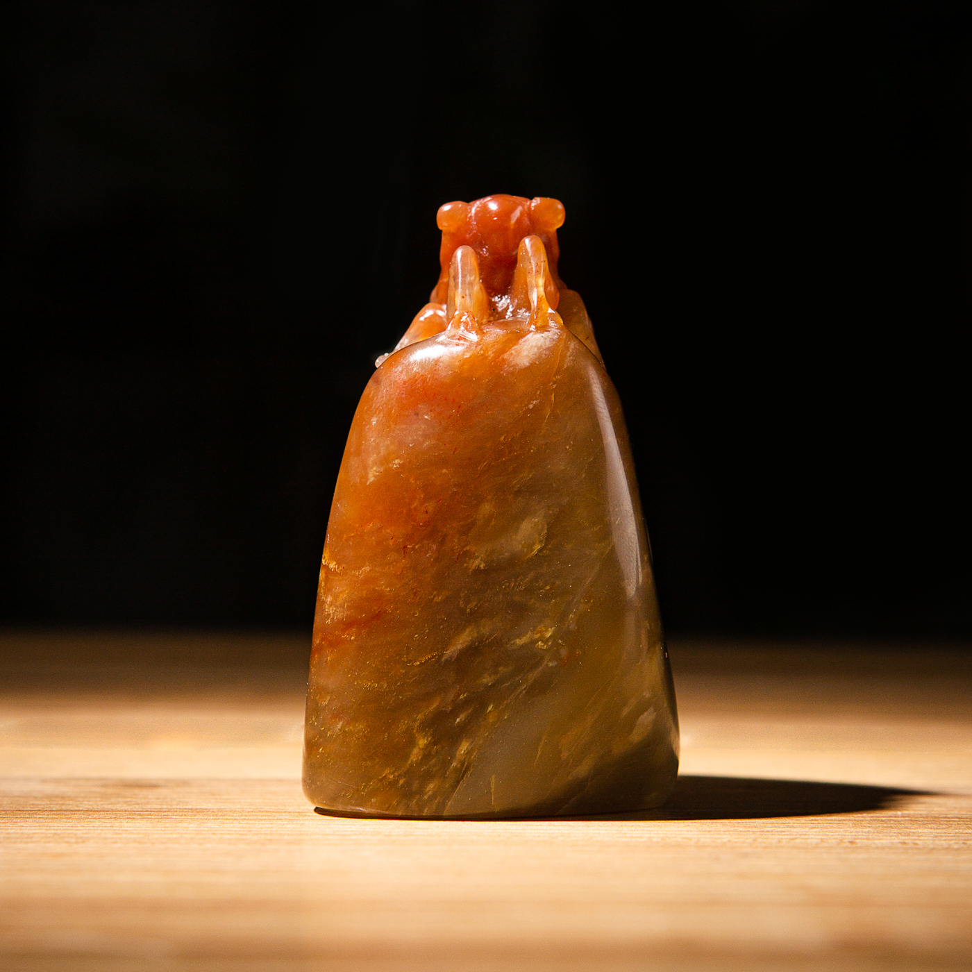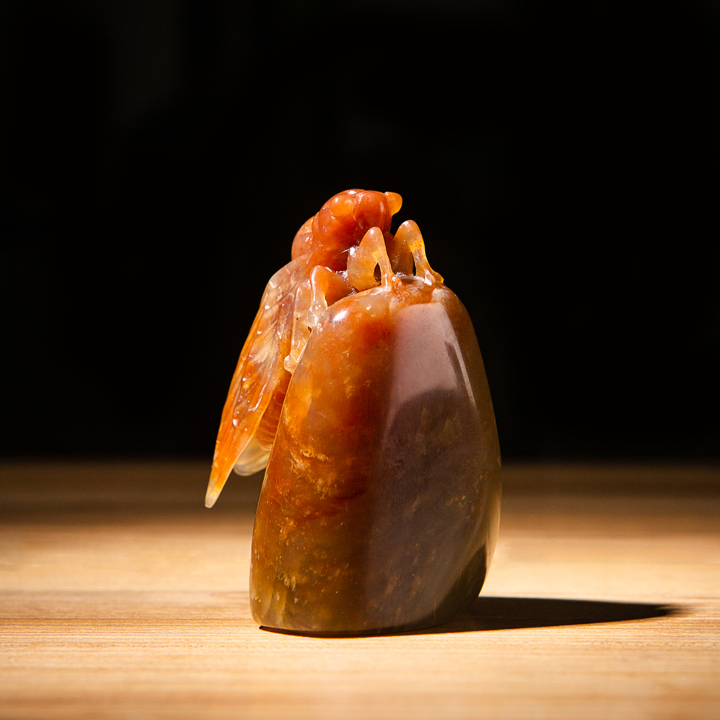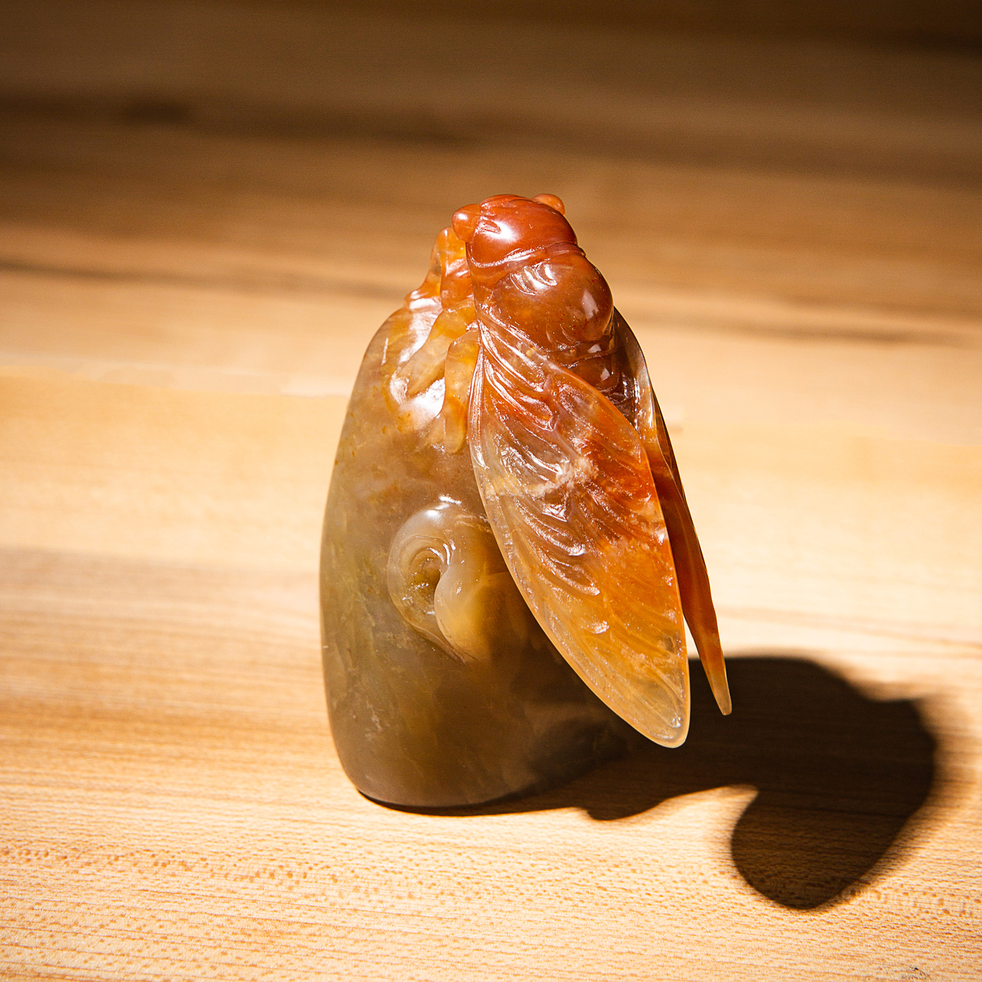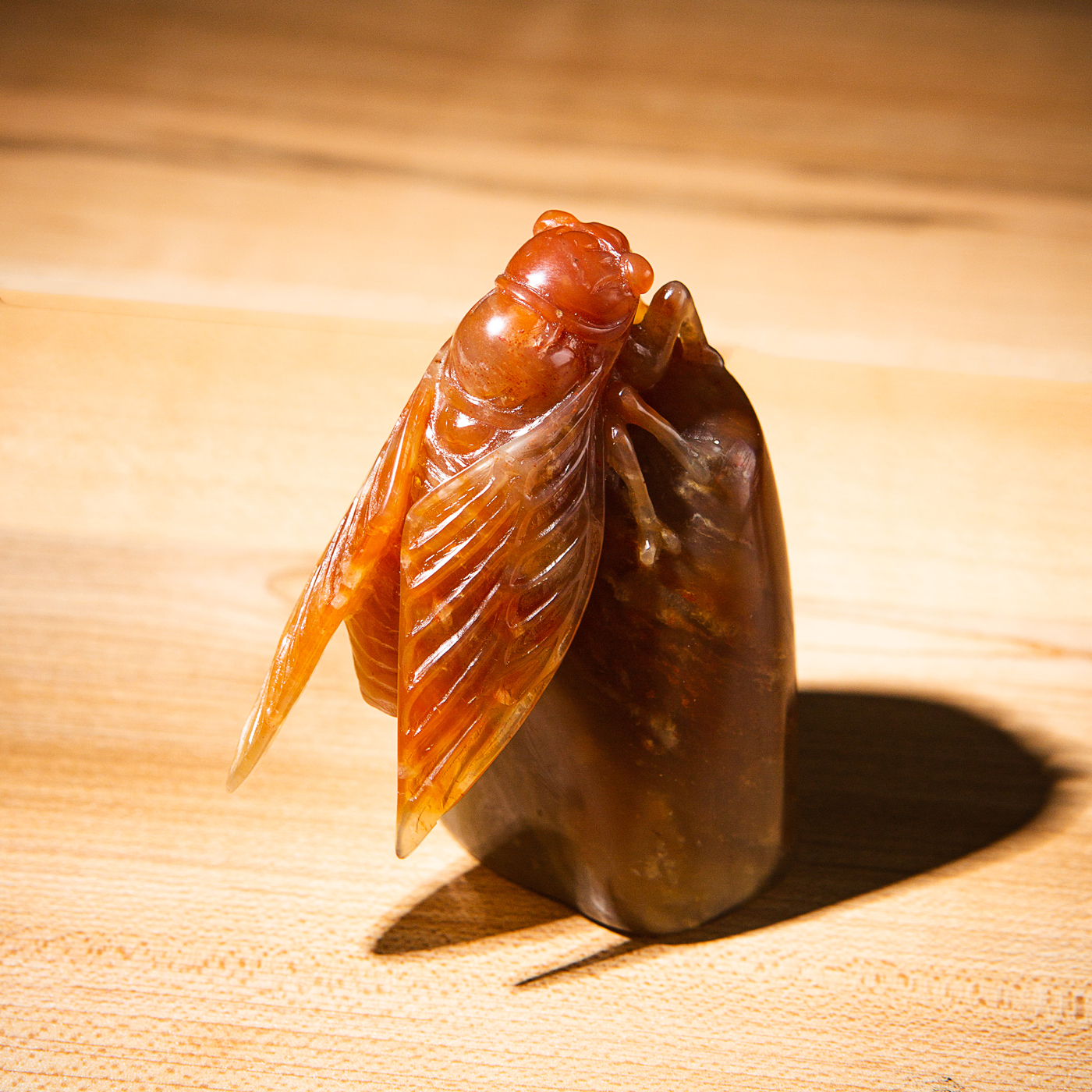寿山石老料手雕“金蝉”闲章,选料为存放几十年之老料,料质极佳。其雕工精细,题材刻画生动,极具艺术效果和实用性。