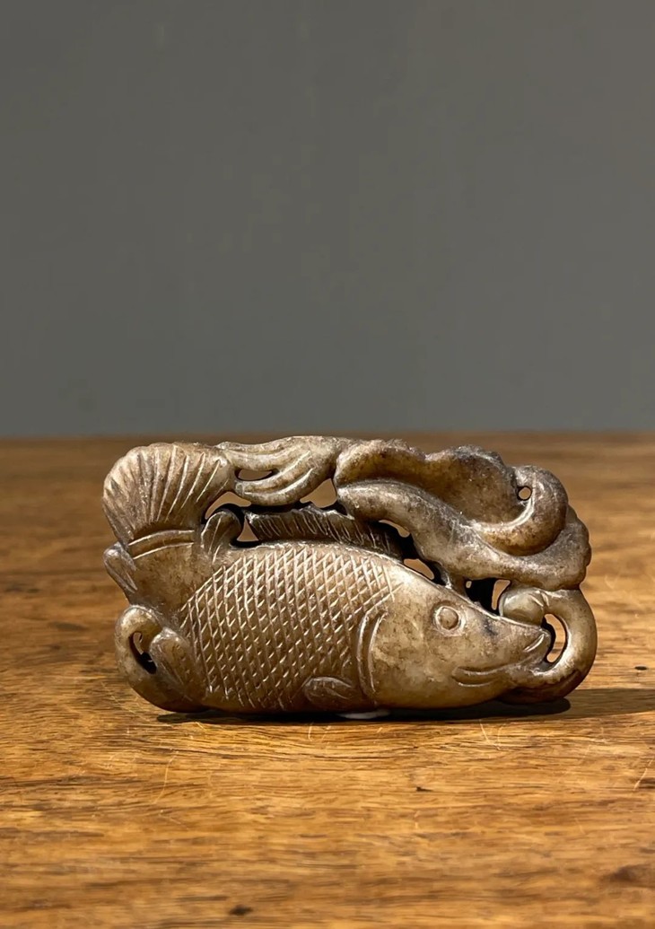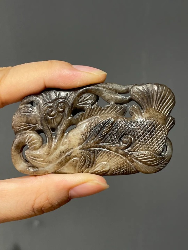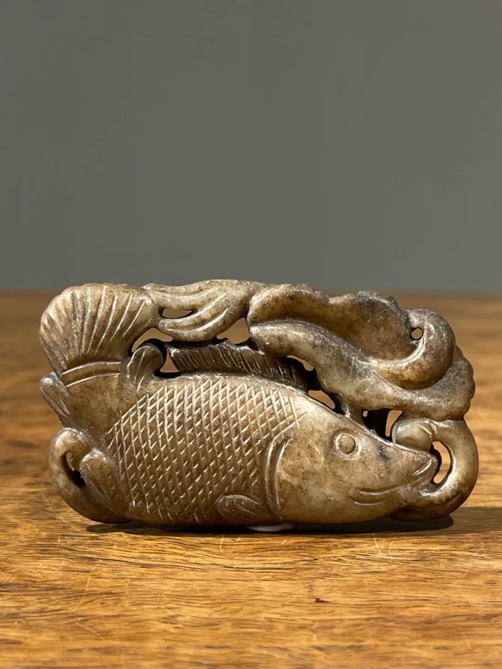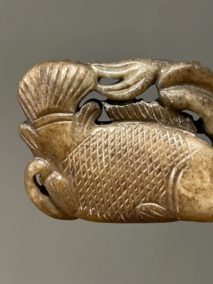 此玉质佳包浆皮壳温润的提油褐黑沁的镂雕鳜鱼把玩件,除了天然石纹浅裂痕与少数沁斑处具细微风化孔外,保存完好。
