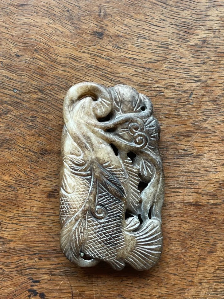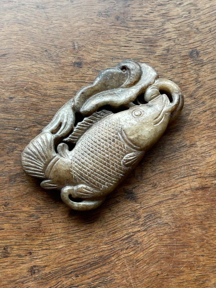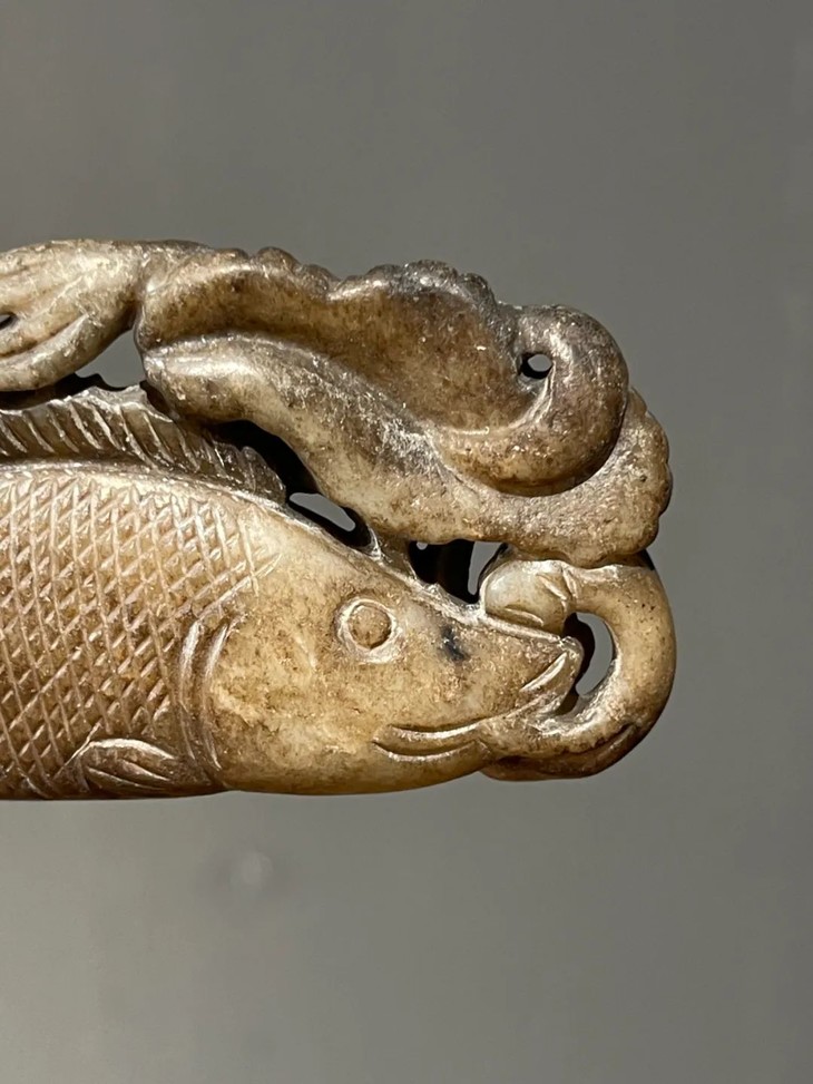 此老白玉镂雕鳜鱼把玩件,表面覆盖提油人工作色型成的褐黑斑,年代久远自然形成之包浆皮壳油润纯净,部份沁斑处具细微腐蚀细孔,包浆柔和靓丽,刻划细节层次分明,刀工细致老练不刻意藏刀锋,表面琢磨细腻,典型清代老式工具雕琢与打磨之痕迹处处可见。 手握尺寸,无论摆放案头慢慢细品或上手把玩近观,都可以深刻地感受到古代文人雅士们由这种优美把玩玉器中所得到的愉悦。