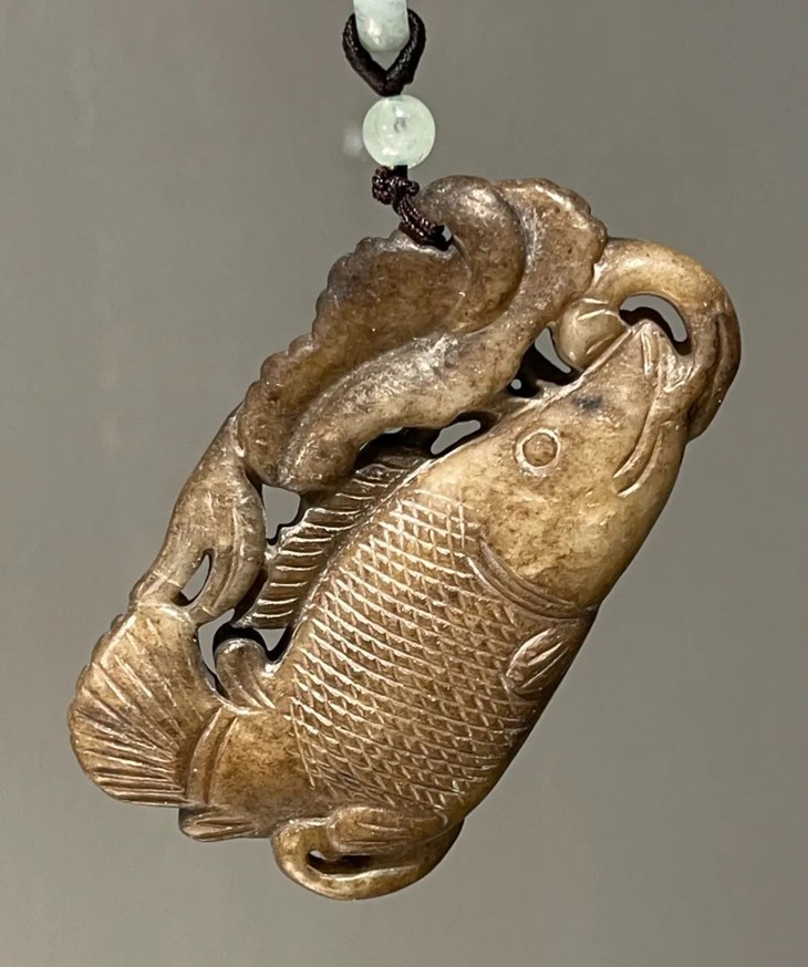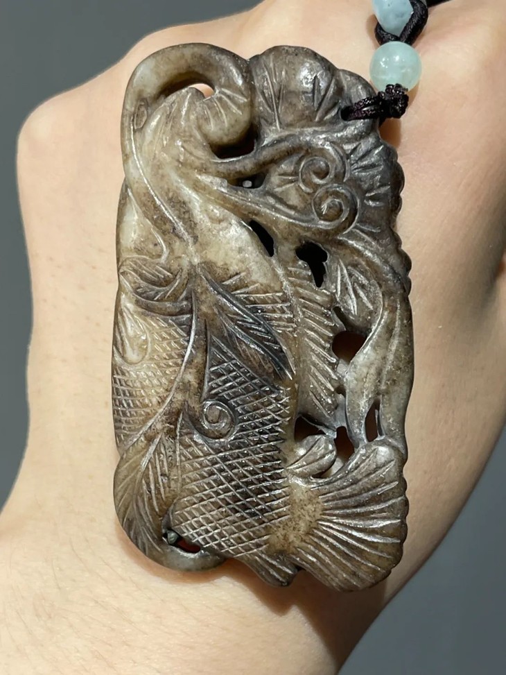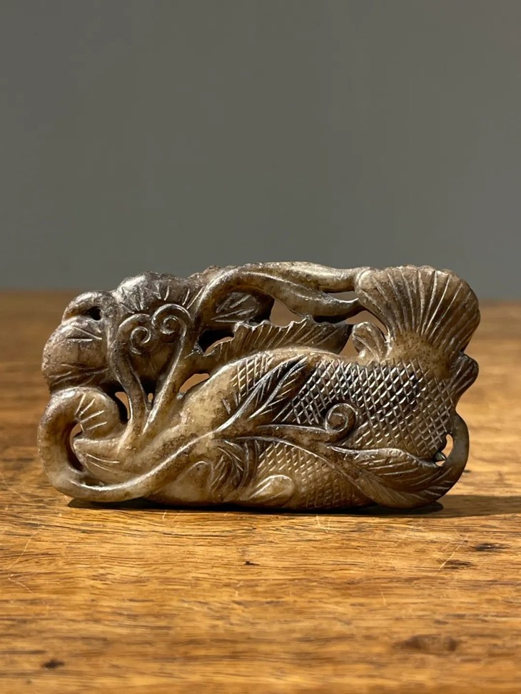 这是一件年代较久的文人随手把玩的玉雕,此件文人气特别浓厚的案头把玩镂雕寓意“连莲有鱼、年年有余”的莲叶鳜鱼鏤雕玉件,以四面全形鏤空透雕手法,呈现出一只啣莲叶的鳜鱼,仿生造型生动流畅,神韵非凡,无论是鳜鱼的体态,遨游动感,与莲叶型态,所有的线条弧度都可以感受到匠人投入的情感、优雅的造形、以及旧时代精细的玉雕线条与完美的表面琢磨,全器以明清玉雕提油作色工艺呈現仿古褐黑色沁斑,色泽自然,质地温润细腻。