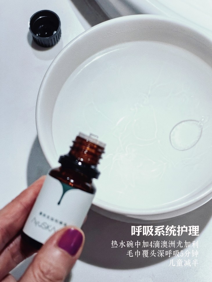 蒸汽吸入:4滴澳洲尤加利加入1盆热水中,毛巾覆头深呼吸5分钟,缓解急性鼻塞。