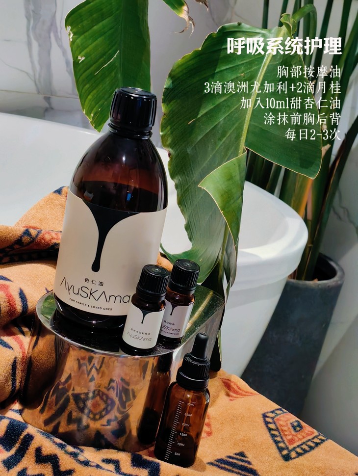 胸部按摩油:3滴澳洲尤加利+2滴月桂,加入10ml甜杏仁油或温润油等基础油中,涂抹前胸后背,每日2-3次。