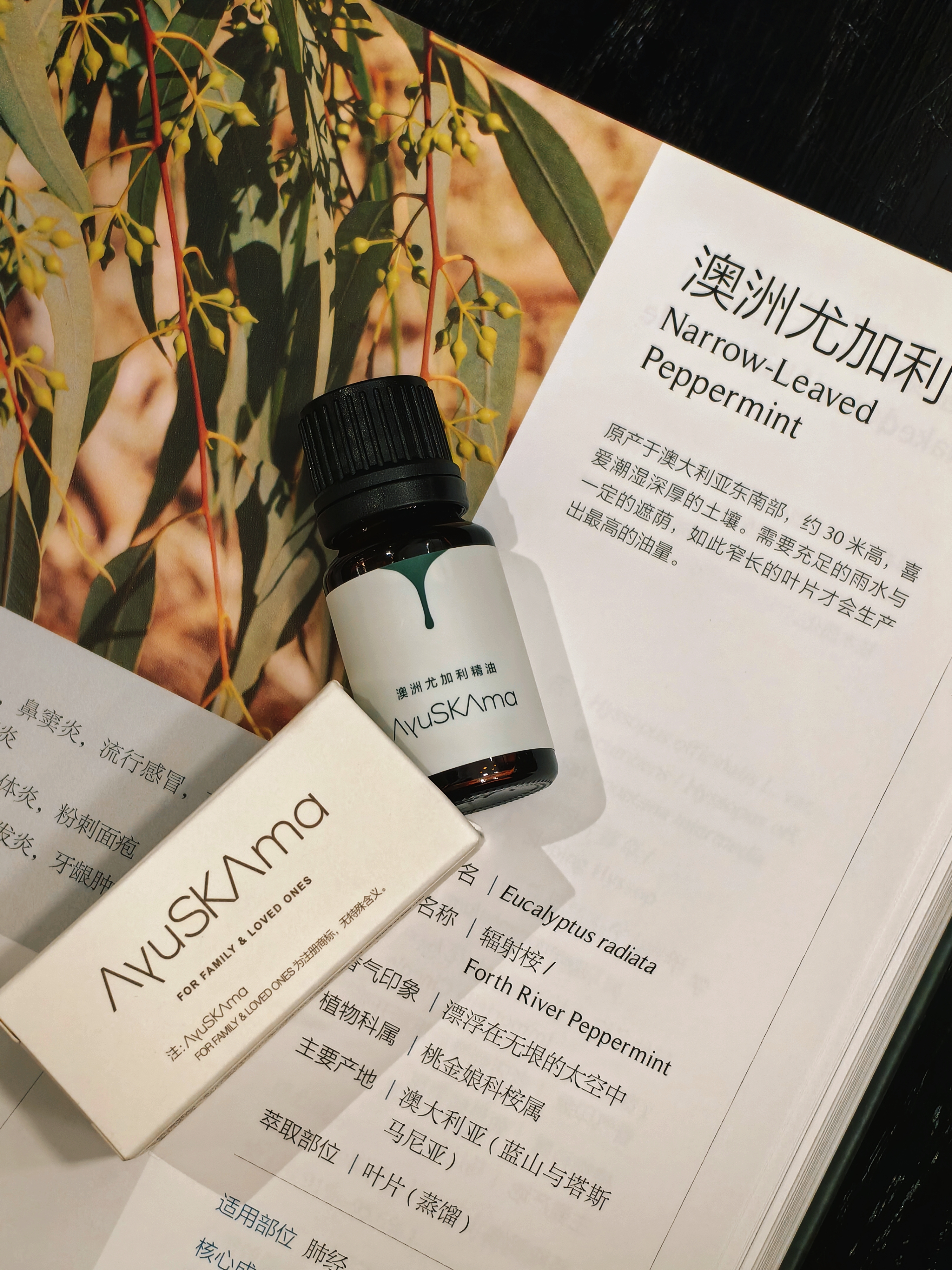 新精油!澳洲尤加利,是从桃金娘科桉属的常绿乔木枝叶中蒸馏而来的。它的叶片狭长,散发着清新而温和的樟脑香气,与蓝胶尤加利相比,气味更加甜润,桉油醇含量适中(62%-72%),儿童和敏感人群也可以用。澳洲原住民以前用来做伤口包扎和呼吸道感染的治疗,如今更是用法多多!