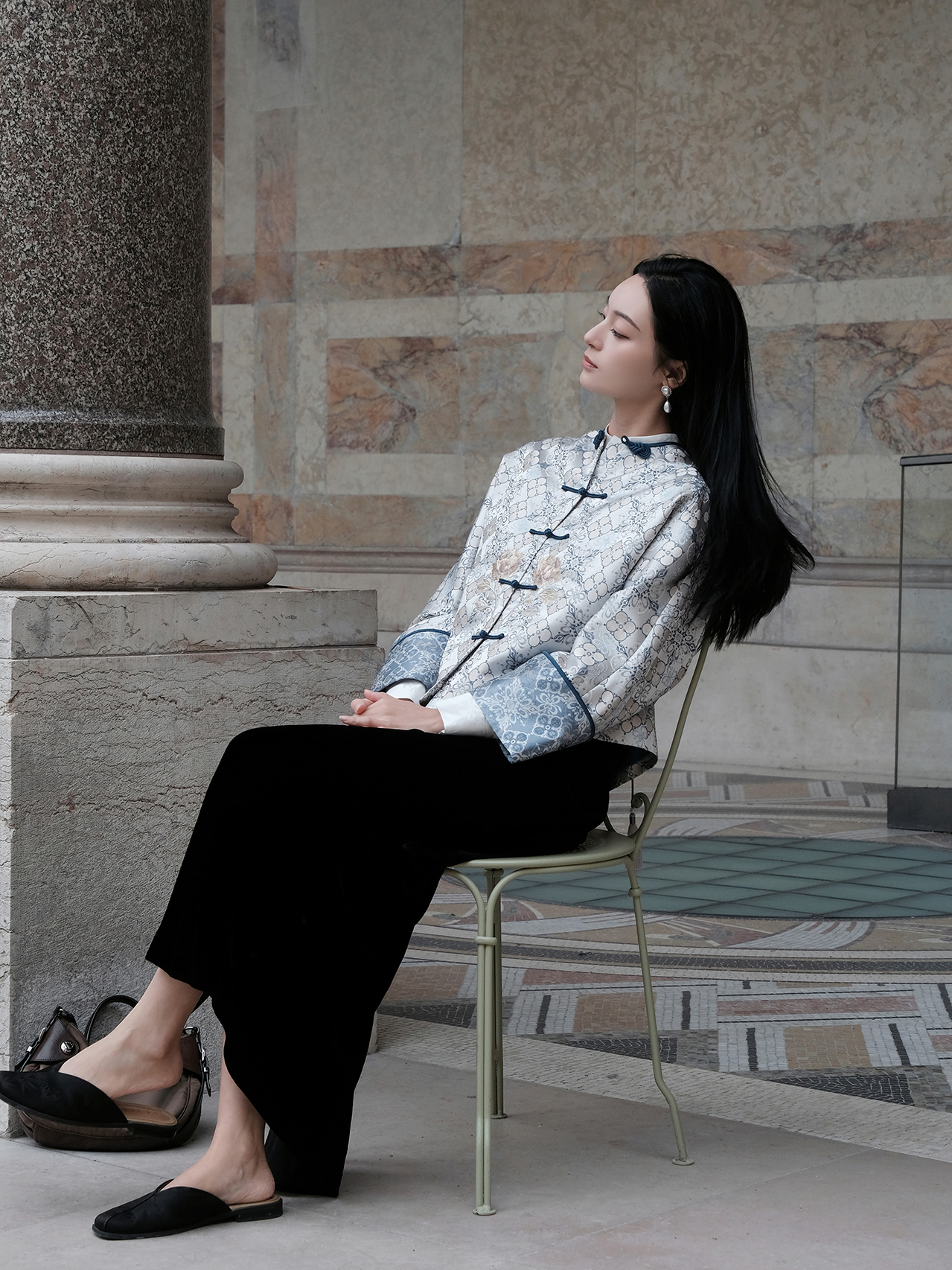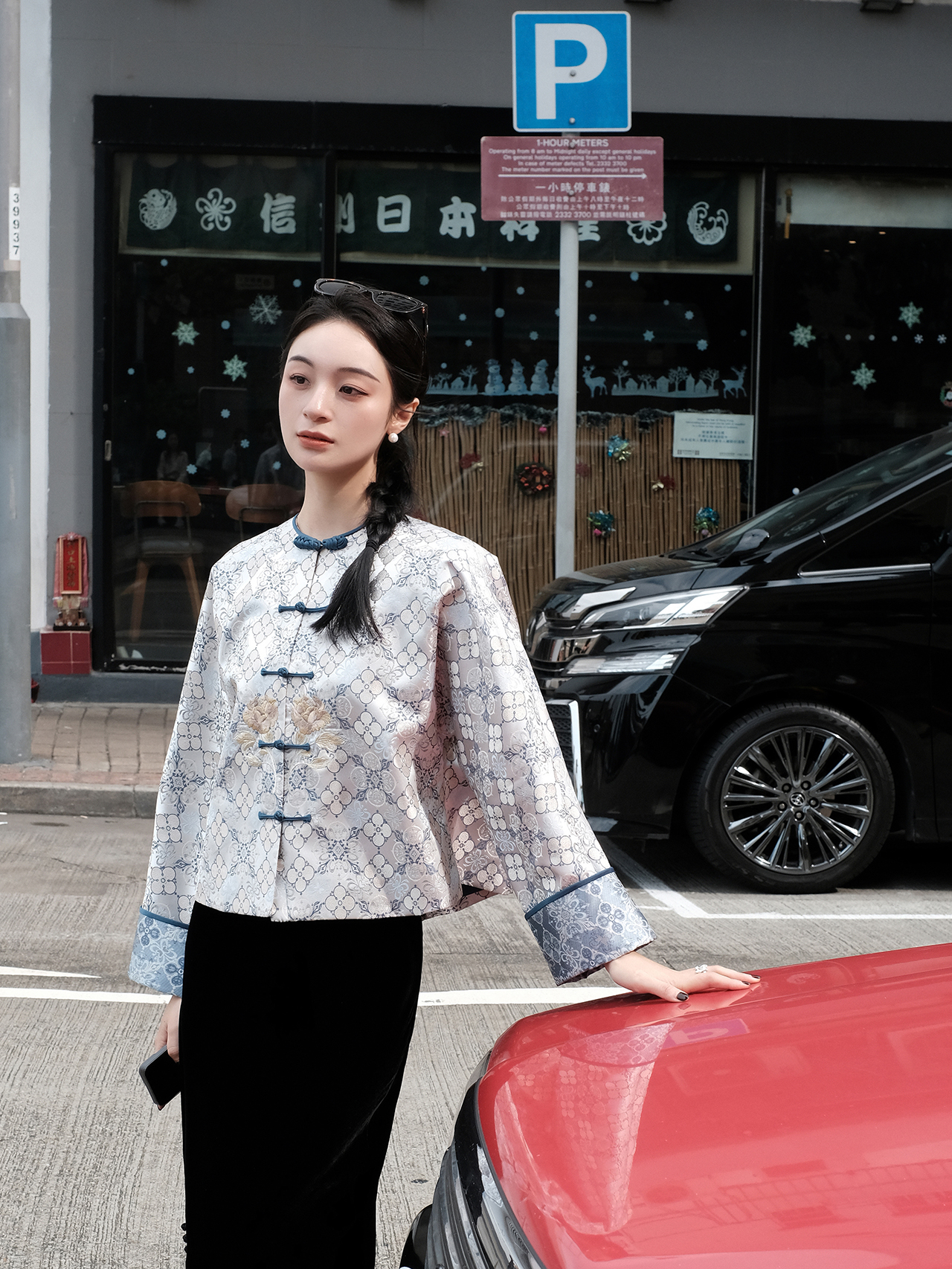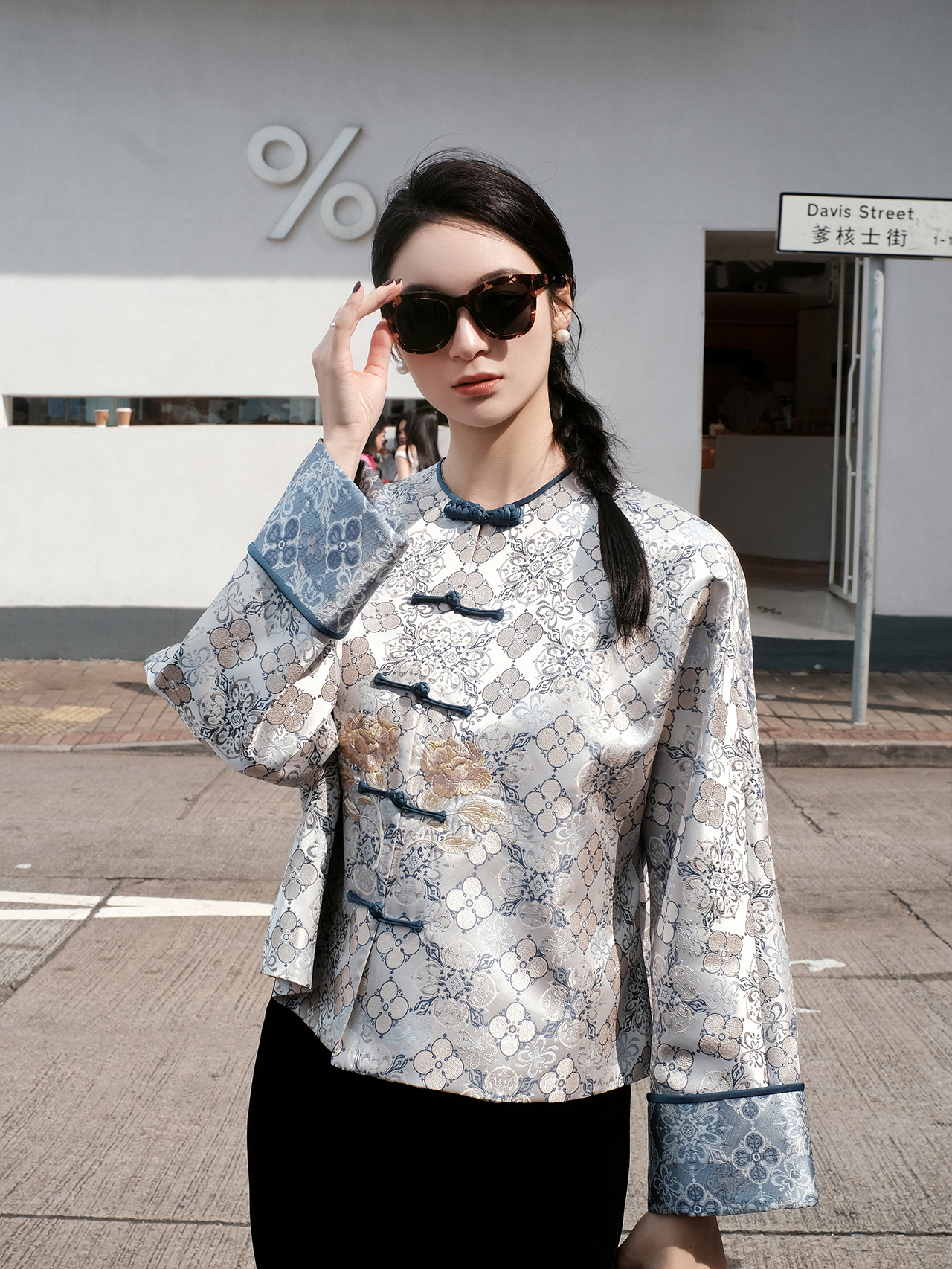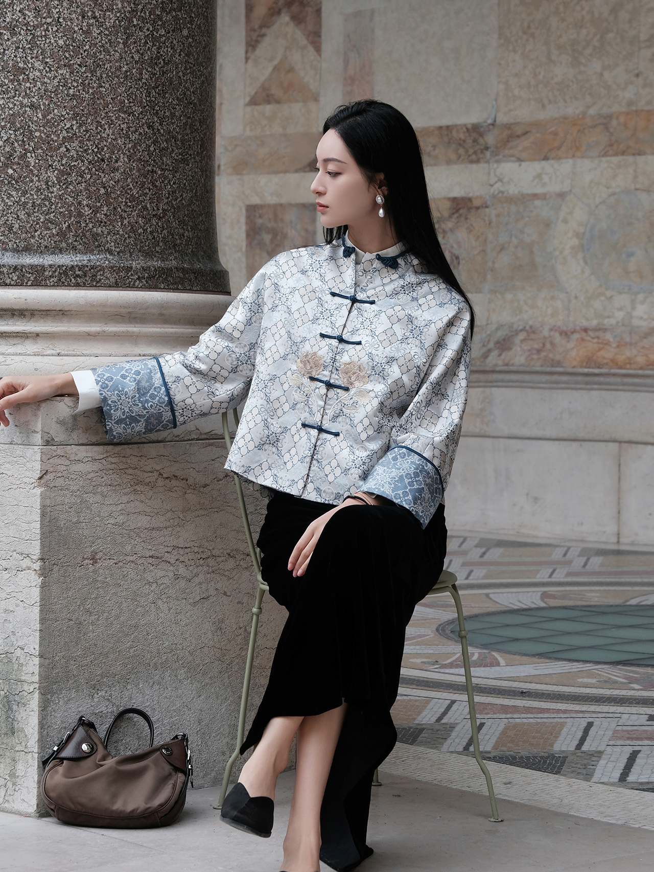 东方境X郭培| 牡丹刺绣提花新中式外套-灰蓝