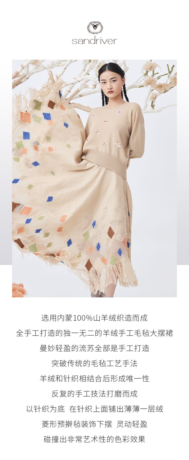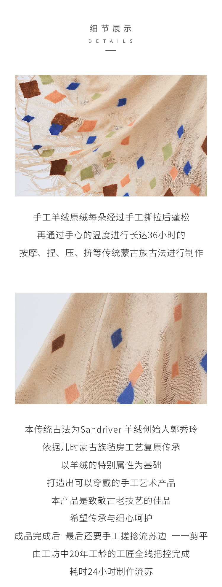 历年在巴黎时装周亮相,享誉世界的艺术羊绒品牌[Sandriver 沙涓]由羊绒布道者郭秀玲女士创立。阿拉善自有牧场纯种羔羊绒,日本国宝设计师小筱顺子,上海自有基地精工细作。承载羊绒情怀,坚持匠人品质。