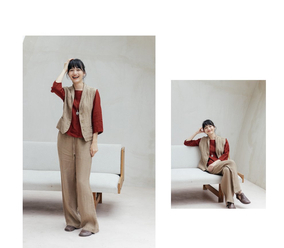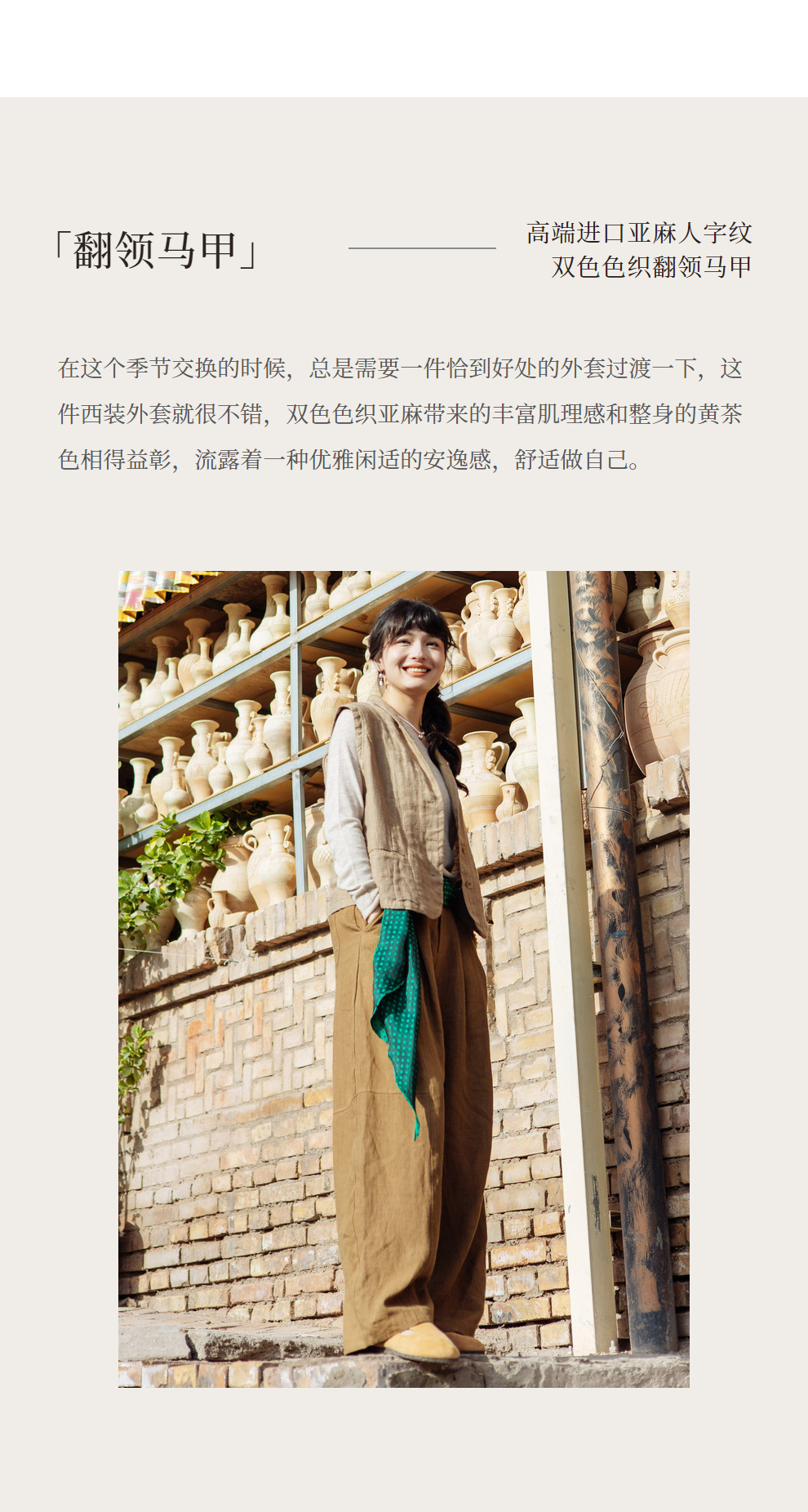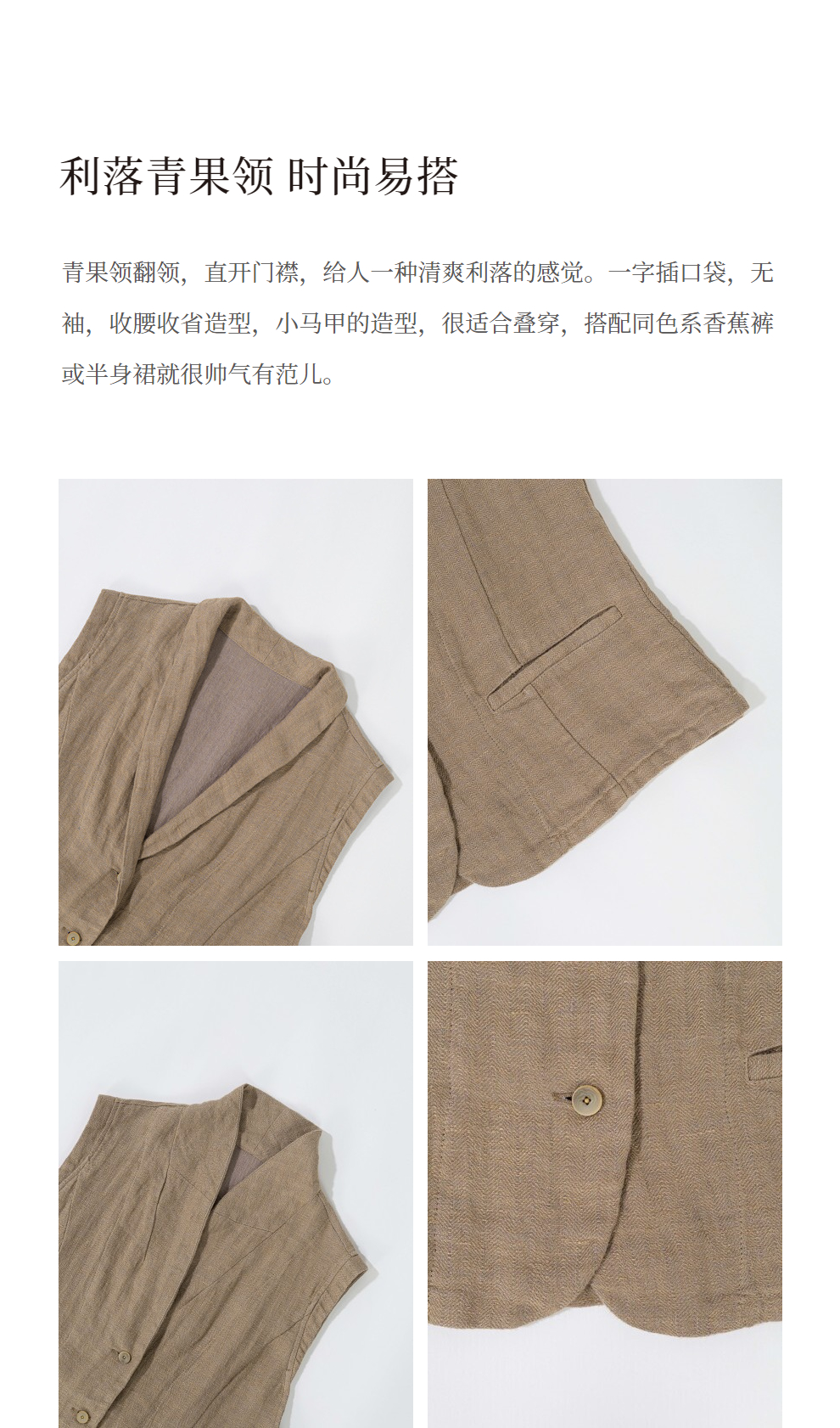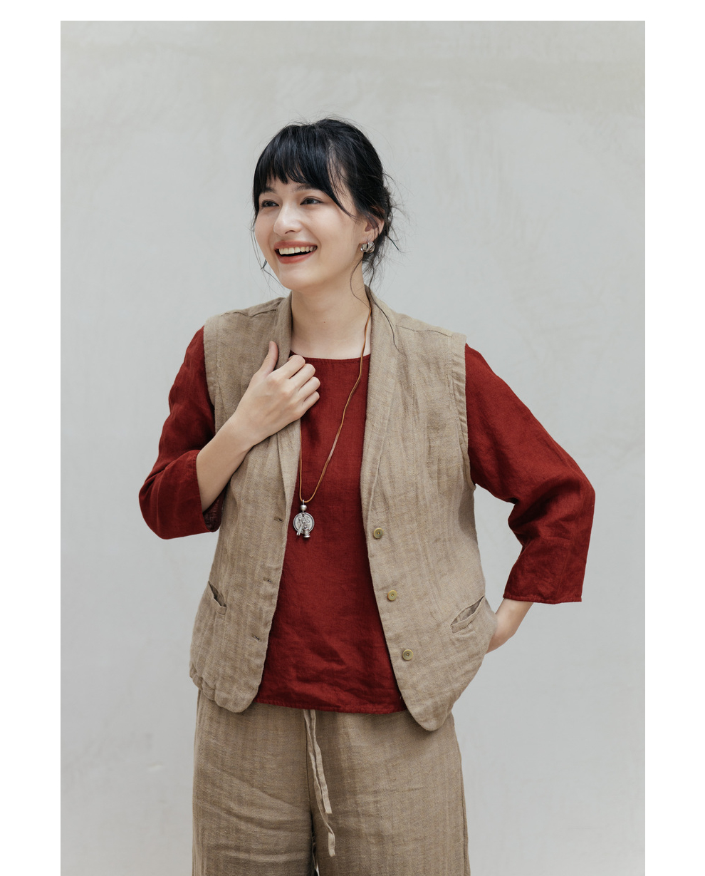 绽放旅行女装533朵/早秋高端进口亚麻人字纹双色色织翻领收腰马甲