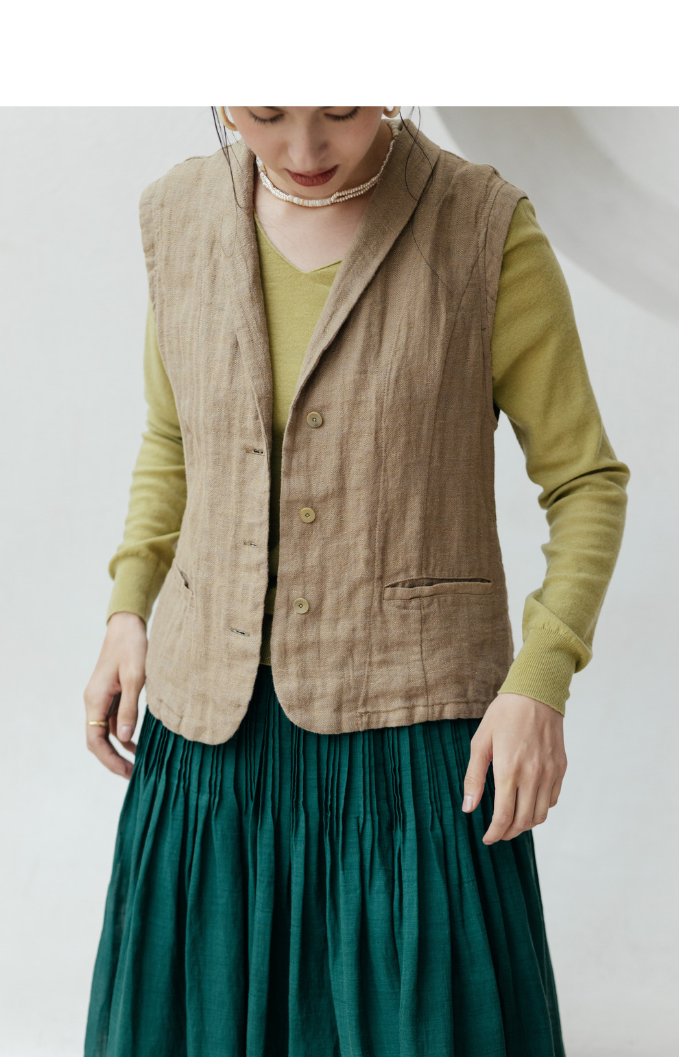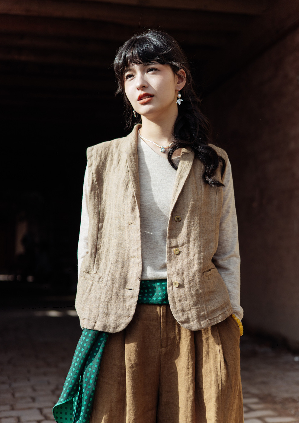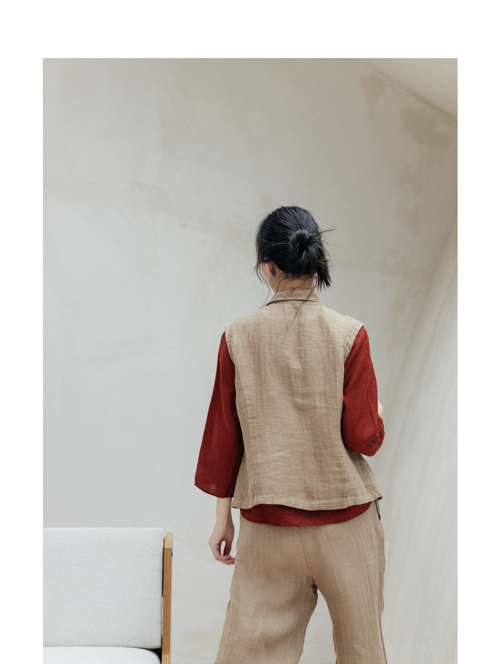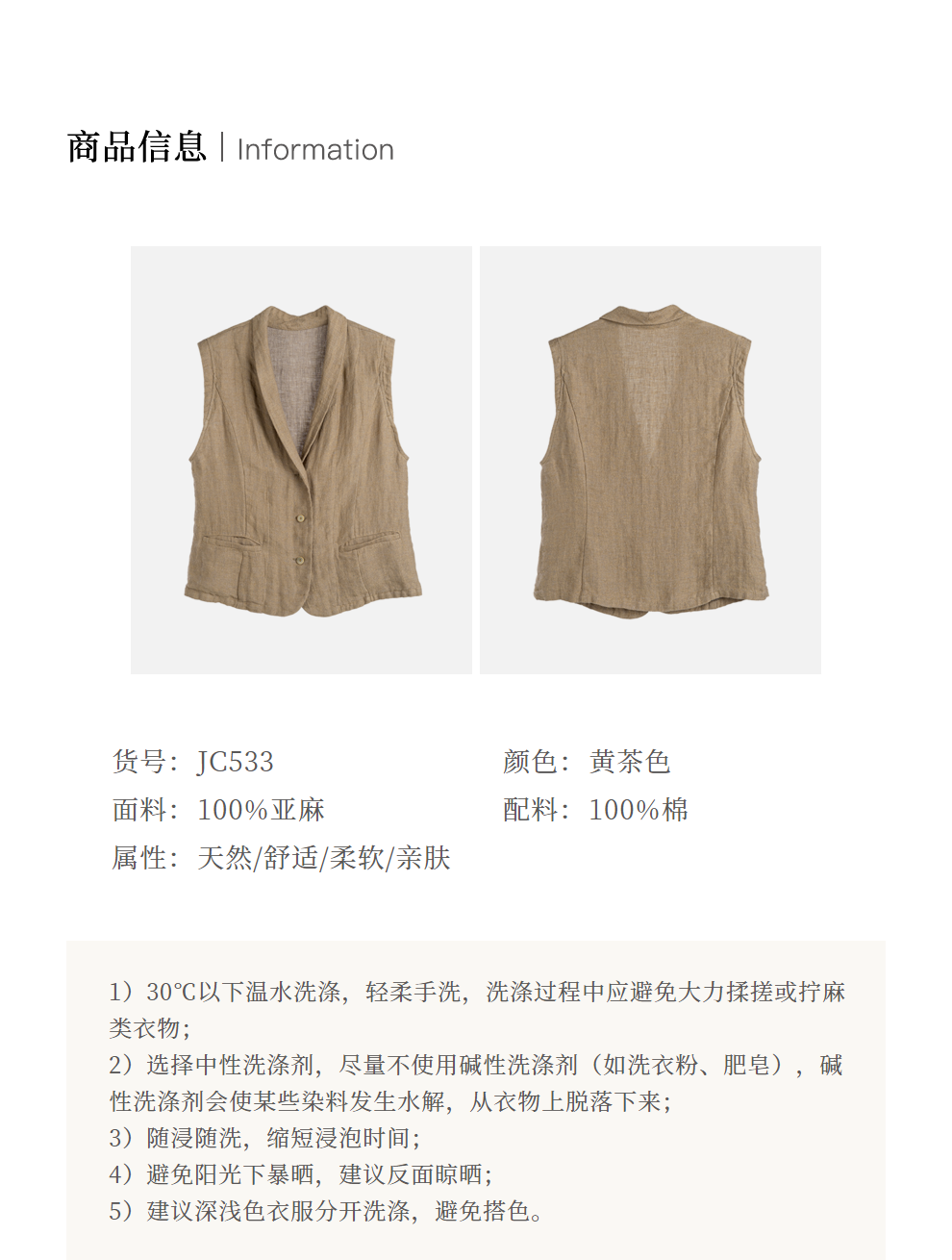绽放旅行女装533朵/早秋高端进口亚麻人字纹双色色织翻领收腰马甲