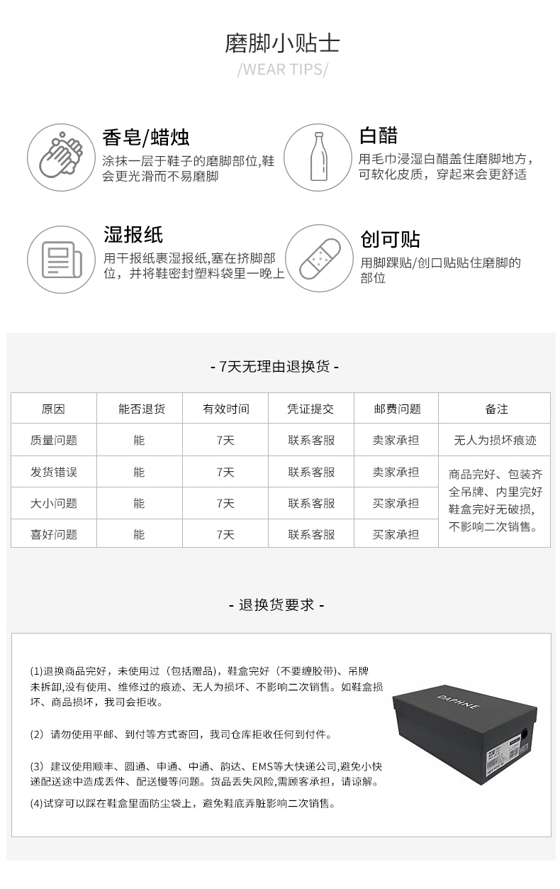 不影响二销的情况支持7天无理由退换货,无需任何图片。鞋子和鞋盒一套必须一起退回;没退鞋盒-15元