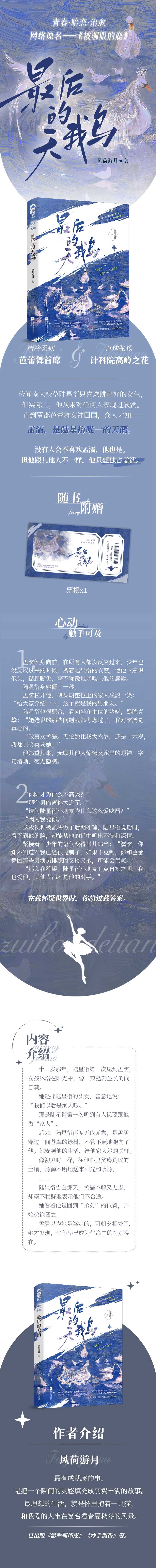 南大一食堂的一楼,人声鼎沸,窗口嘈杂。正值吃午饭的时间,陆星衍和舍友打完饭,找到一处干净的桌子坐下。刚吃没几口,对面的程麟睁大眼睛,岳白间看着他,疑惑地开口:;怎么了?程麟将口中包着的米饭咽下,伸手指向前方悬挂的大电视屏幕,惊喜说:;覃郡女神要回国了。南大为了方便莘莘学子关注时政,在每个食堂的每一层楼都安装了中央电视,平时主要用来播放新闻,今天却一反常态地报道了覃郡大剧院芭蕾舞团的消息。前不久,覃郡被评选为沿海最优美的城市之一,为了表达获奖的喜悦与感激,覃郡芭蕾舞团在上级要求下编排了一场舞剧,将在明年六月份进行汇报演出。剧院院长为了这次演出,特地邀请了目前在意大利;斯卡拉芭蕾舞团担任首席舞者的孟濡,带领本地芭蕾团排练。;院长原本不抱希望的,人家现在至少算是个国宝级的演员,每年要前往各大国际舞台演出,怎么可能有功夫回到小小的覃郡,而且一回就是大半年。没想到她真的答应了,可能看在故乡的面子上吧程麟科普道。陆星衍倏然抬头,盯着身前的荧屏。电视里正在播放女孩的舞蹈视频,那是孟濡19岁时出演的舞剧《天鹅湖》。灵秀美好的少女刚从英国芭蕾舞学院毕业,第一次登上国际大舞台,一组黑天鹅的32挥鞭转便惊艳了所有人。这场舞剧的成功演出,使孟濡从此被称为;东方第一白天鹅。画面中的女孩舞裙精美,秀发高盘,立于舞台中央,黑暗里唯一一盏灯光打在她身上,映出她雪白耀眼的皮肤。随着第三幕coda(乐章结尾部)响起,她踮起脚尖,引长脖颈,纤细柔韧的单腿支撑全身重量。黑天鹅展开羽翼,骄傲热烈地旋转。她平衡掌握得很好,这样高难度的弗韦泰转,足下几乎没有任何移动,甚至每一次留头时嘴角都挂着浅浅的笑意。如果凑近一些,还能看到她最后一次旋转时眼睛轻轻地眨了两下,浓长稠密的睫毛扑扇扑扇,那是女孩紧张时不自觉的表现。这样细微的变化,只有将这段视频看了无数遍的陆星衍才能察觉。三十二圈挥鞭转结束,台下掌声如雷。接着,电视里又播放了孟濡的其他舞剧表演片段,无论是《胡桃夹子》里轻盈活泼的克拉拉,还是《天鹅之死》中忧伤孤独的白天鹅,都令人回味无穷,赏心悦目。南大属于理工类院校,学生们对芭蕾鲜有研究,但此刻,大部分人的目光都落在了那个女孩身上。一是她太过出名,几乎每个覃郡人都听过她的名字;二是她长得太过漂亮。程麟如痴如醉地看着女孩完美的侧脸:;这是她六年前的视频,画质糊成这样还能这么美,颜值真是能打。岳白间好奇:;你怎么对一个芭蕾舞演员这么了解?你喜欢她?;我妹妹是学芭蕾的,对她喜欢得要命。我耳濡目染也知道一些。话落,程麟语气一转,;况且这么好看的女生谁不喜欢?可惜我晚生她五六年,不然一定死缠烂打去意大利追她。岳白间劝他清醒:;你就是比她早出生六年,人家也看不上你。程麟:;闭嘴,好么。陆星衍懒得听这两人打嘴炮,起身。电视机里,主持人在做最后总结词:;让我们期待这位年轻的芭蕾艺术家带给覃郡的惊喜陆星衍早已觉得餐盘中的饭菜变得索然无味,他将餐具放入回收处,回来拿起椅背上的外套便准备走。岳白间叫住他:;阿衍,你又要出校门么?陆星衍冷淡地点点头,好看的脸孔上看不出情绪。岳白间问:;那下午的数学分析你还上不上?;不上了,老大帮我答个到吧。老大是他们宿舍的秦献,刚才一直在和女朋友发微信。秦献答应。程麟趁机问:;晚上黄冬玥邀请我们去覃大看表演,你也不去了?陆星衍:;不去。;不是吧?程麟难以置信,夸张道,;人家就是为了邀请你,才顺便邀请我们的。你不去,我们怎么好意思去啊。;关我屁事。留下这句话,陆星衍便绝情地出了南大。与南大这个男女比例极其悬殊的理工院校不同,覃郡大学有很多学艺术的女生。黄冬玥是舞蹈专业的,如果能够通过她认识更多的女生,那他们这些;工科狗脱离单身的行列指日可待。然而,宿舍的希望陆星衍并不打算管他们,他心情烦躁,在学校大门口拦了一辆出租,向司机报上地址,一路疾驰。