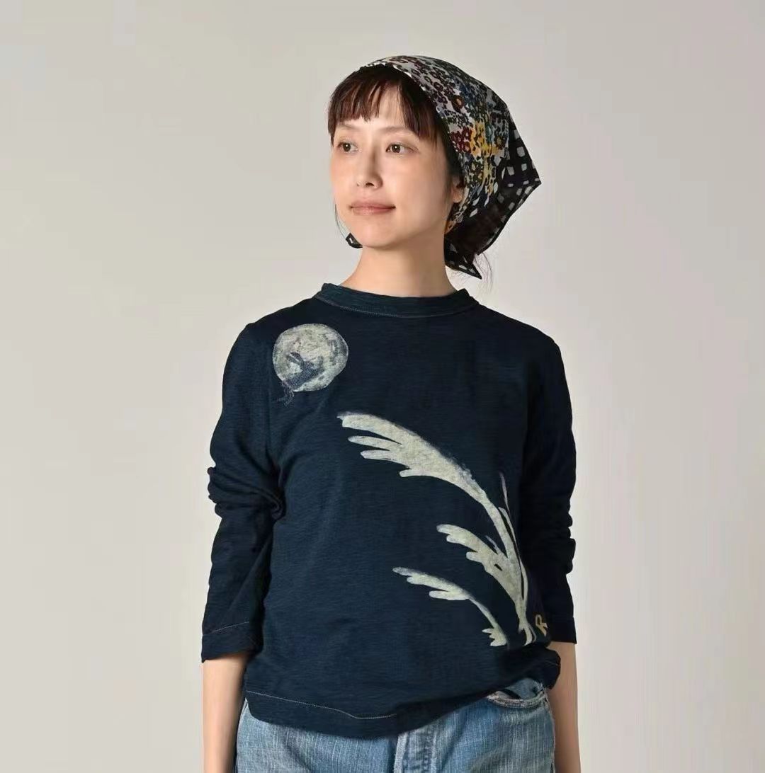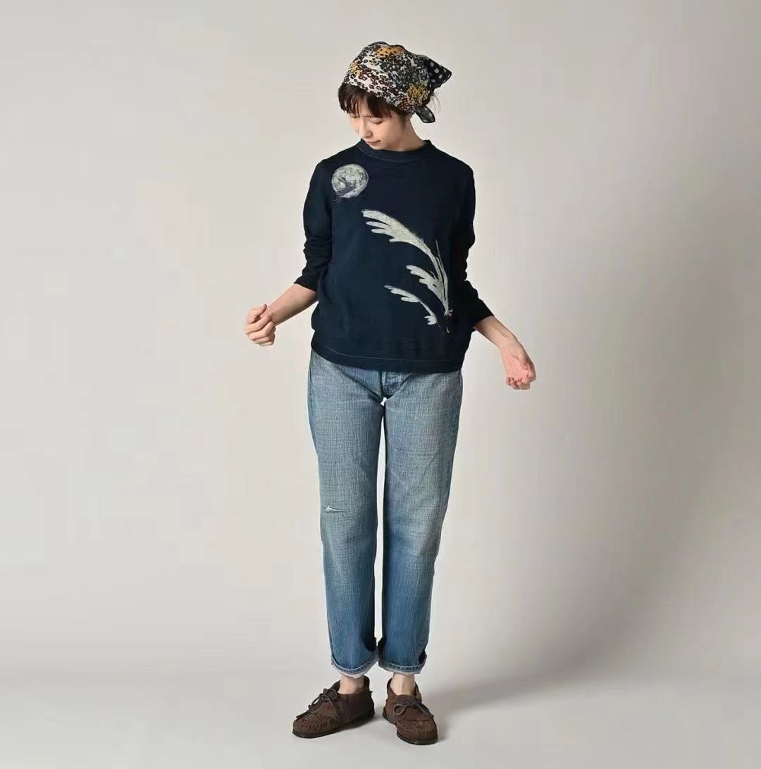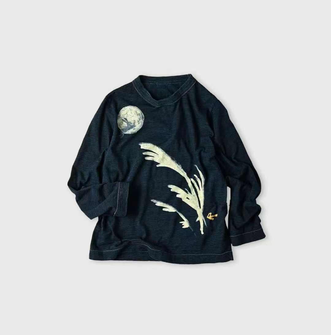 玉兔前后刺绣长袖T 麻蓝色 原版原厂货麻蓝靛蓝竹节混纺面料 精梳竹节混纺棉 前后刺绣印花+后内侧印花刺绣 正面是一轮巨大的圆月和一只兔子。 背面是一头牛拿着饺子凝视着月亮。 这款方形女孩T恤短款紧凑。