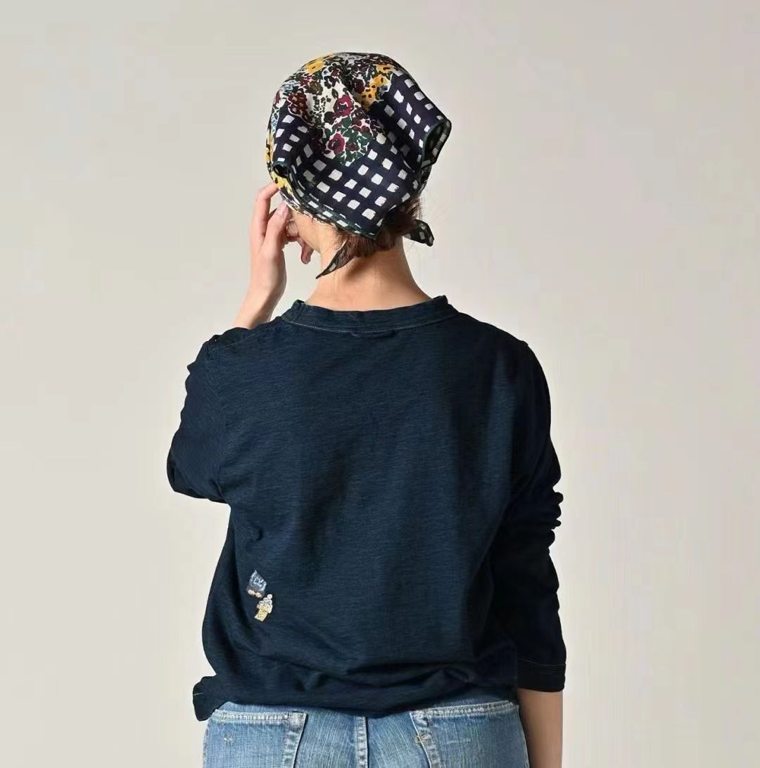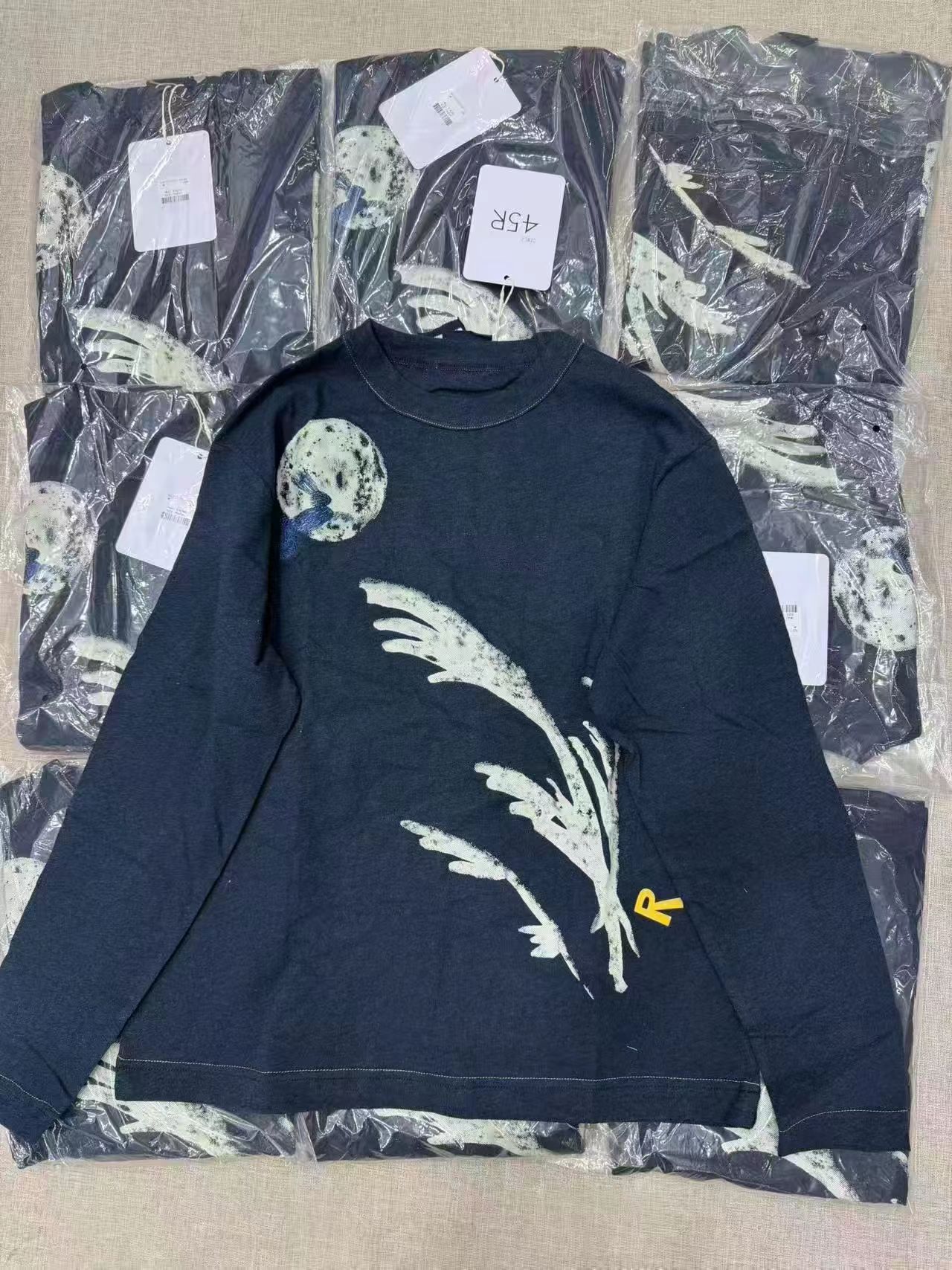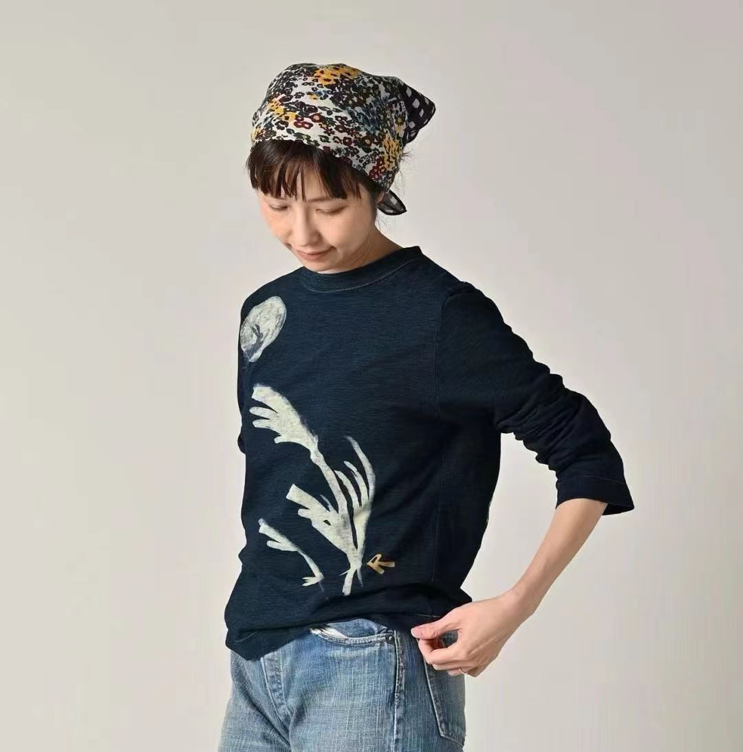玉兔前后刺绣长袖T 麻蓝色 原版原厂货麻蓝靛蓝竹节混纺面料 精梳竹节混纺棉 前后刺绣印花+后内侧印花刺绣 正面是一轮巨大的圆月和一只兔子。 背面是一头牛拿着饺子凝视着月亮。 这款方形女孩T恤短款紧凑。