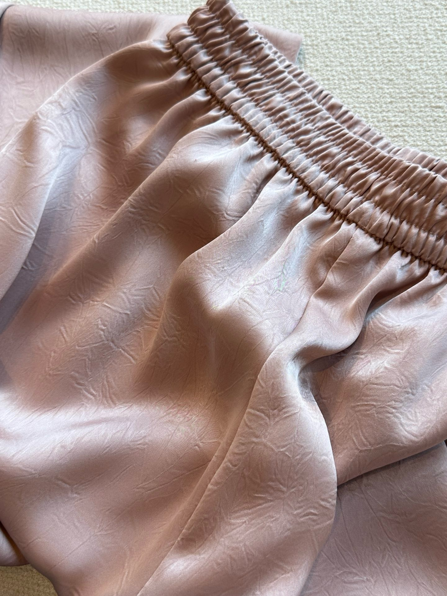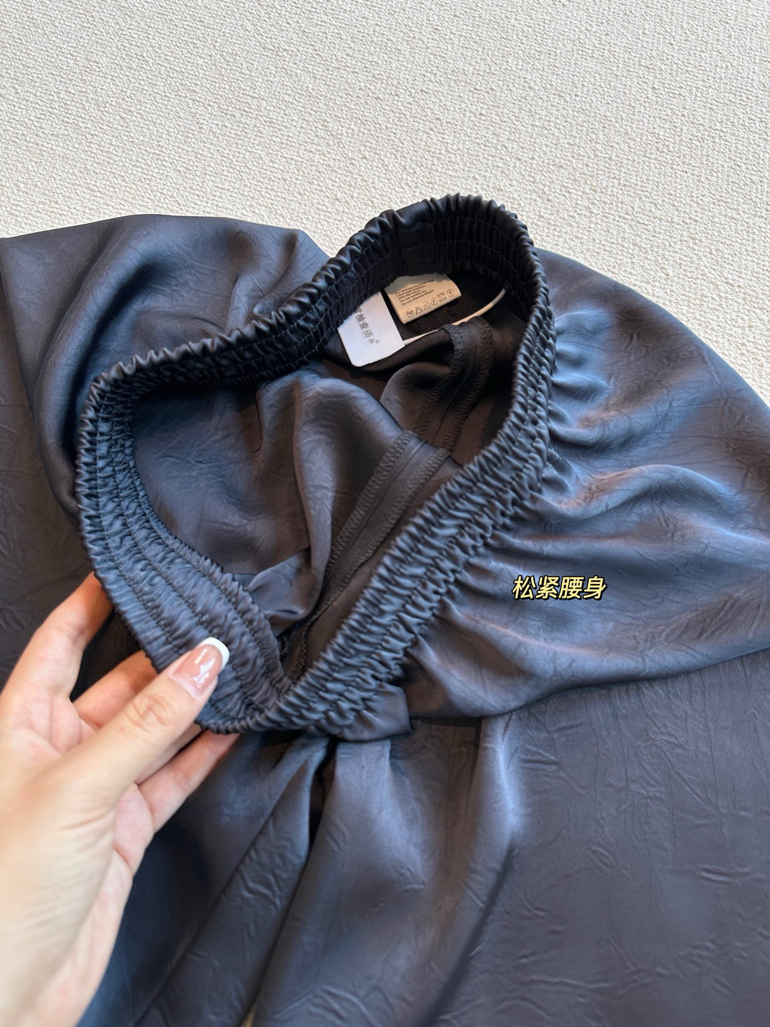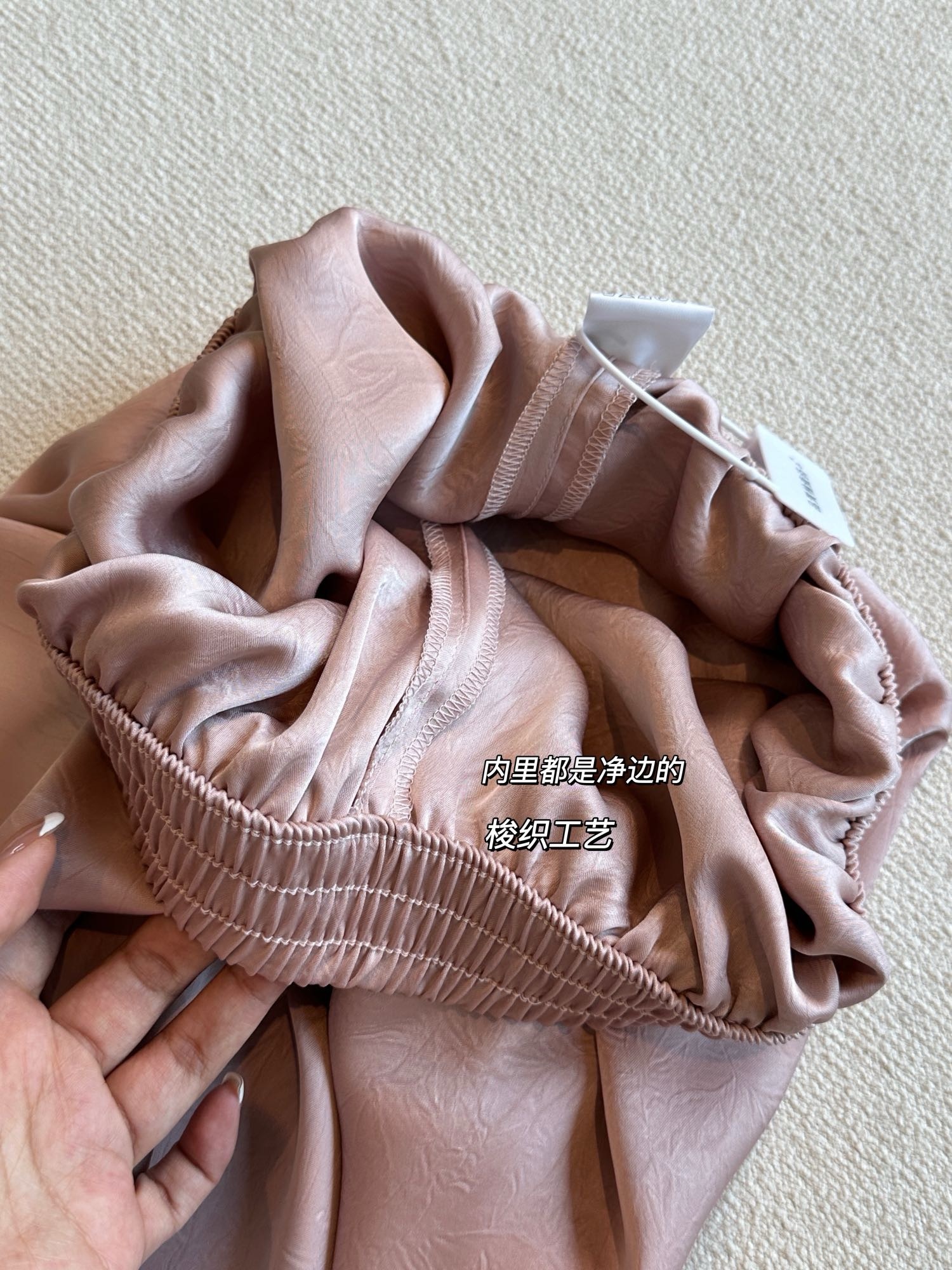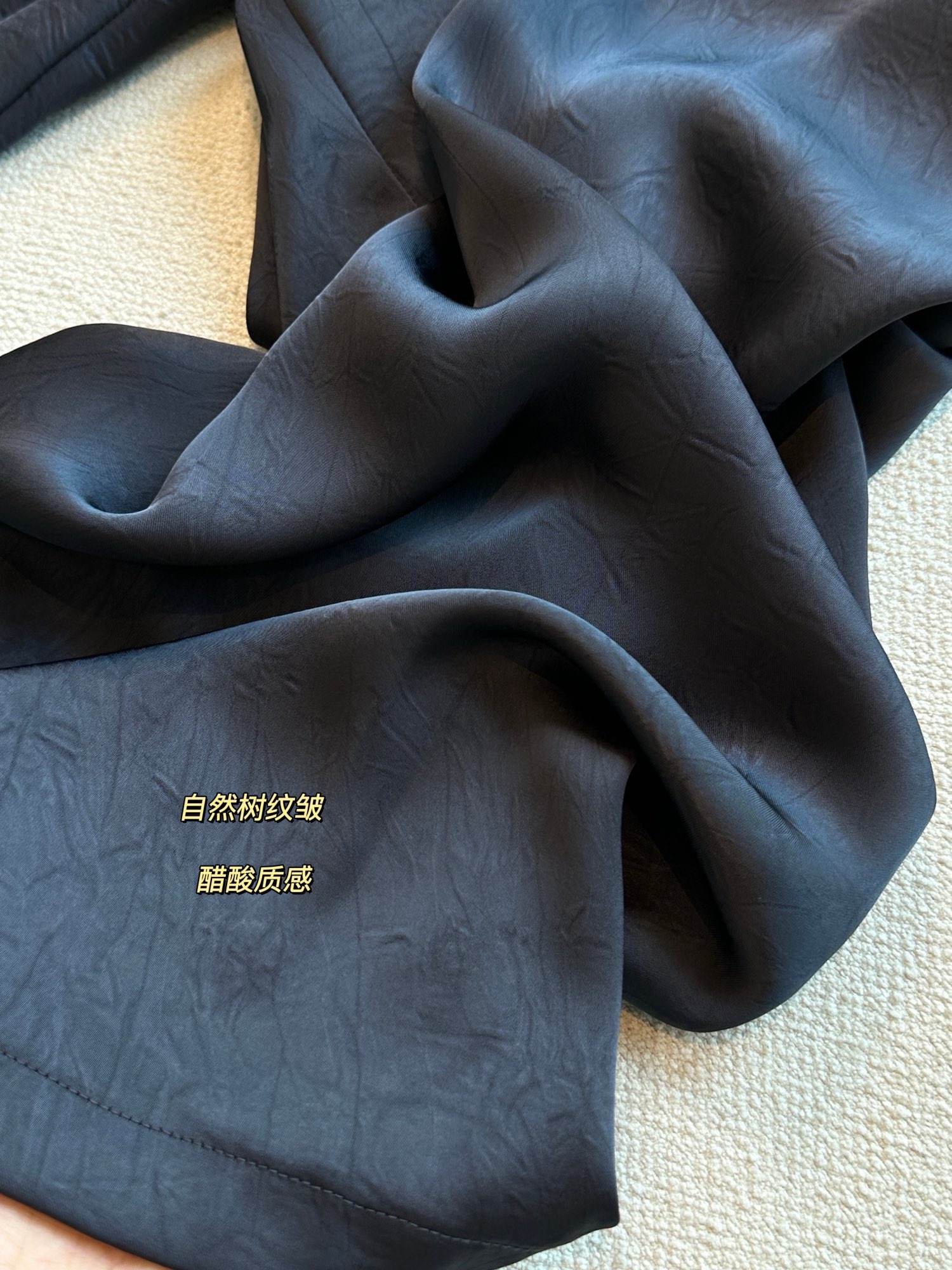 品牌同面料,进口客供,上身有光泽抓皱的灵动有点像树纹皱~特殊工艺处理。如果不说醋酸会以为真丝材质。超级重工。