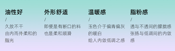 甜白似乳 : 如油脂那样的奶白色,带有滋润柔和的视觉享受。