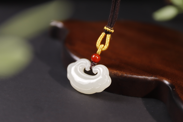 和田白玉质地如凝脂般细腻,带一点点晴水底,光泽温润似水,福锁上雕刻精美纹饰,更显精致典雅。