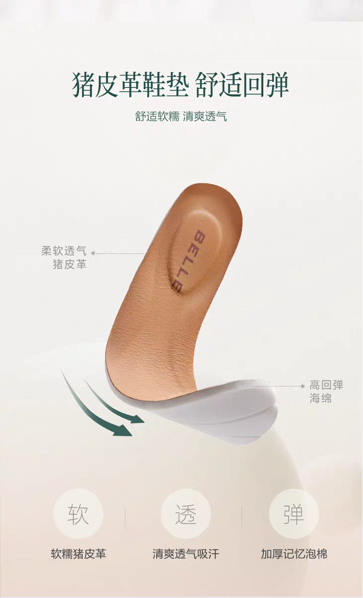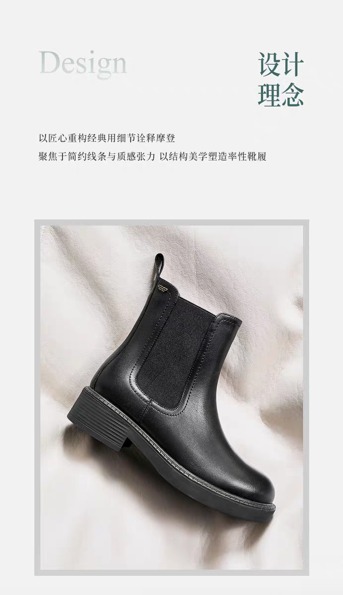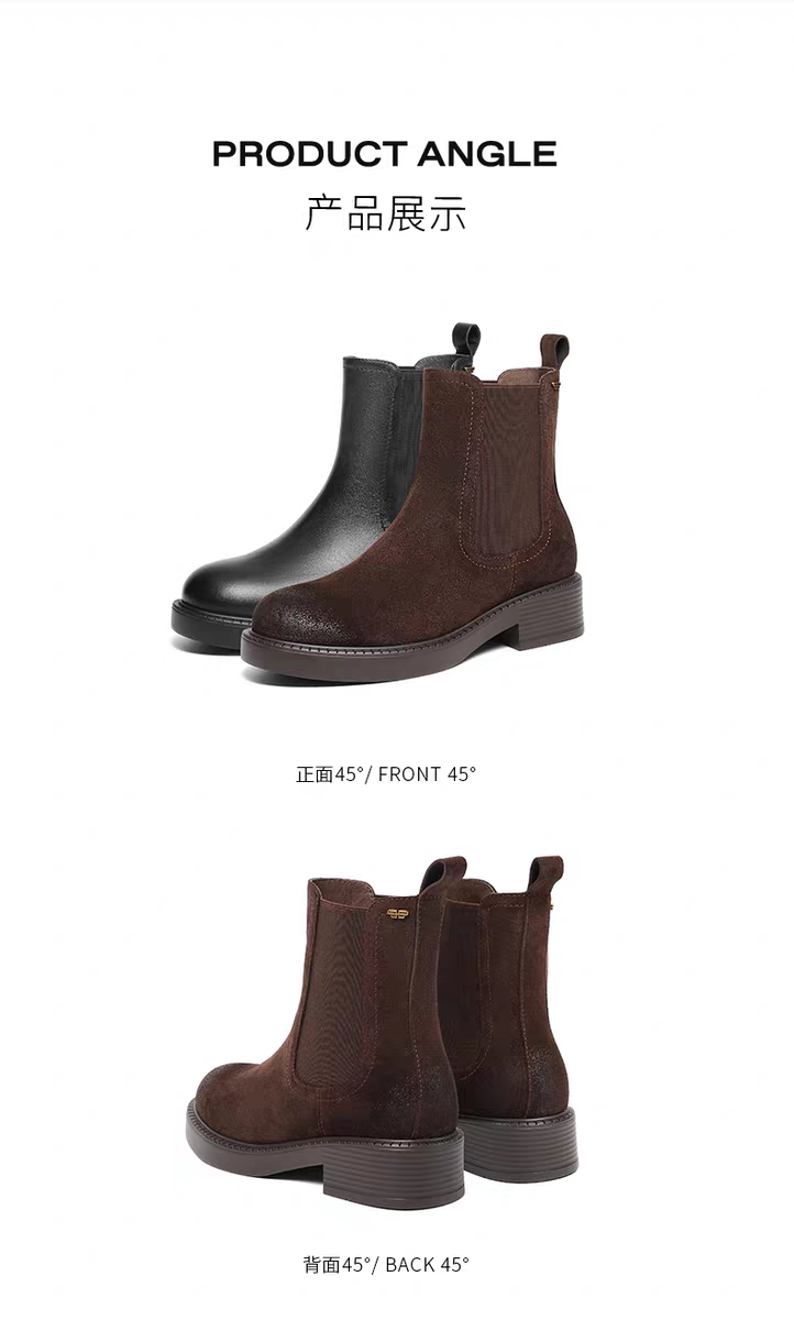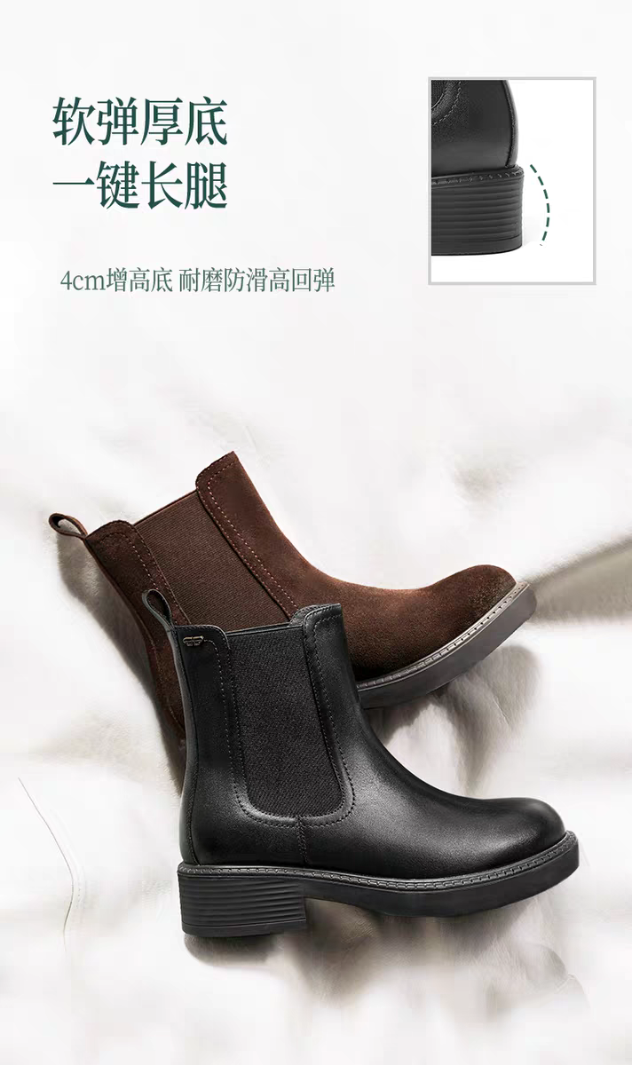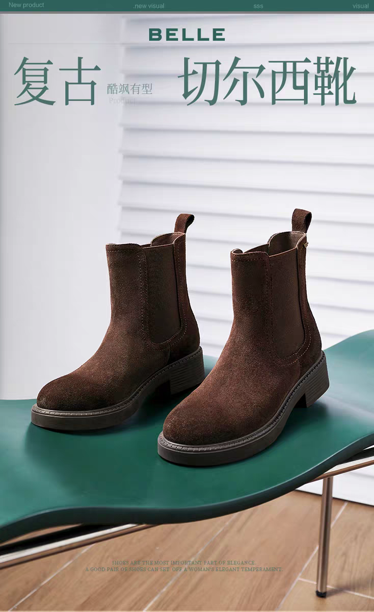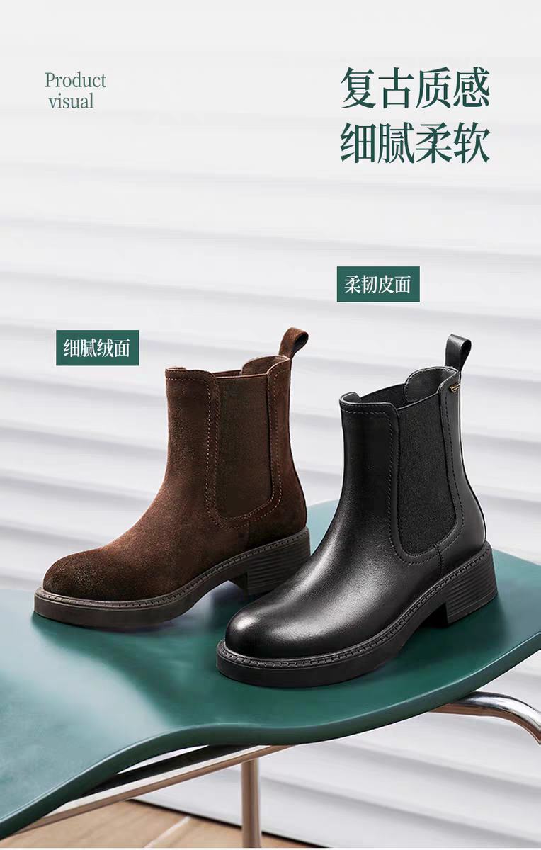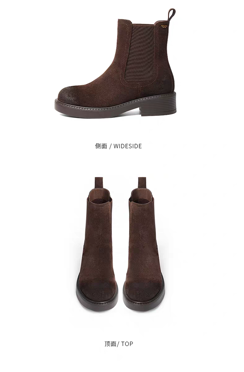 BF楼百丽复古真皮加绒保暖切尔西靴子女25冬新粗跟休闲短靴E8M1DDZ5