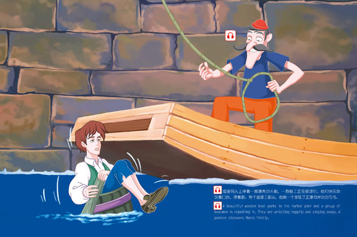 海港码头上停着一艘漂亮的木船,一群船工正在修理它。他们快乐地吹着口哨、哼着歌。有个油漆工眼尖,他第一个发现了正漂向岸边的马可。