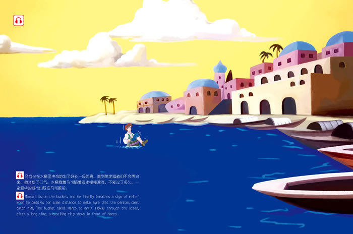 Marco sits on the bucket, and he finally breathes a sign of relief when he paddles for some distance to make sure that the pirates can't catch him. The bucket takes Marco to drift slowly through the ocean, after a long time, a bustling city shows in front of Marco.