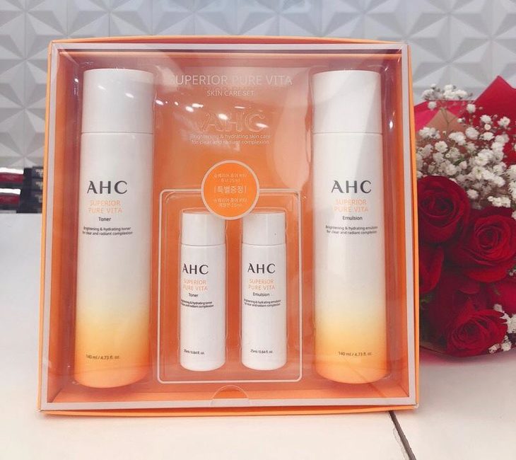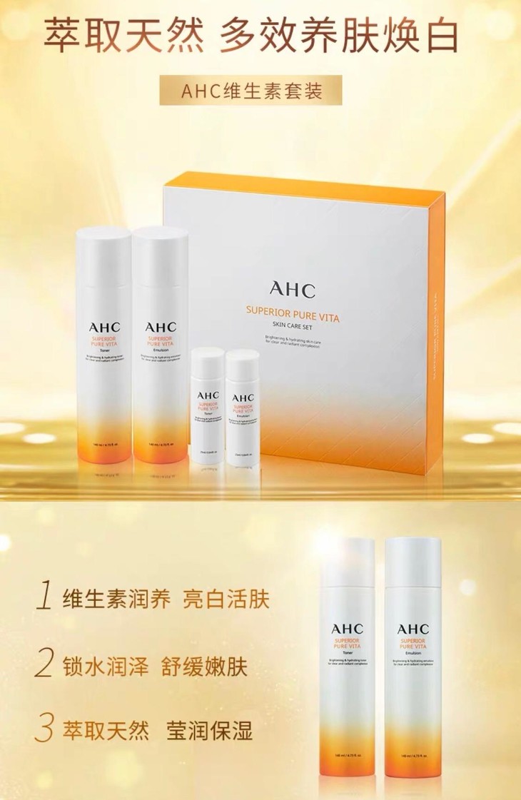 AHC高级纯淨Vita护肤套装👍基础护肤重要的一步——补水💦, 这款富含玻尿酸和含有多种维生素C萃取精华🙆,因其能帮助肌肤抵御紫外线☀侵害,❌避免黑斑、雀斑产生,而被认为很有美白功效。☑能预防肌肤受损,☑促进新陈代谢,让已形成的黑色素排出,☑淡化斑点。到了秋冬🍂,它☑能改变肌肤因血液循环变差而出现的暗沉现象。还可以☑帮助肌肤锁住必要的水分💧,避免因过多蒸发而引起的脱皮及紧绷,加强肌肤抵抗外来污染侵害的能力⬆,避免皮肤疲倦、蜡黄难看🙁。如果你的精神压力很大,肌肤就在无形中显得很较弱,但如果能持续使用AHC维C能量套盒,☑会有助于真皮层的胶原蛋白增生,☑使肌肤看起来有弹性不松弛~