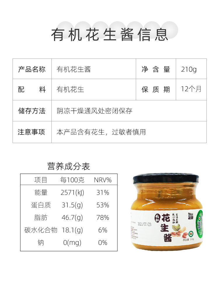 【 品名 】正耕有机黑芝麻酱、正耕有机花生酱 【 规格 】210g/瓶 【 配料 】有机黑芝麻、有机花生、有机白芝麻 【 快递 】随机不指定 【保质期】12个月(常温未开封) 【发货地】广东深圳 【储存方式】阴凉干燥通风处密闭保存 【发货区域】新疆和西藏不发货 【发货时效】48-72小时内发货,正常都是当天下单,隔天发货,但不敢说一定。特殊情况发货时间将会顺延(包括但不限于下雨、天灾,快递暴仓,法定节日休假,以及一切无法预料的突发情况等) 【售后理赔标准】 1.收到产品后,24小时内把严重破损照片即(无法食用产品+快递面单合照),联系我们客服,我们会按比例闪电赔付,购物无忧! 2.由于快递运输,产品难免在运输过程中出现挤压的情况,在不影响食用的情况下不予售后,介意勿拍! 【温馨提示】 1.我们专注于提供高品质食材,直邮到家。收到产品后拆封开盖即食,芝麻富含自身的油脂,长期静置后,油脂会上浮,固体颗粒会下沉,将瓶子倒过来半小时以上,就可以使其重新整合均匀。感谢您的支持与信任,购物愉快~ 2.本产品含有花生和黑芝麻,过敏者慎用