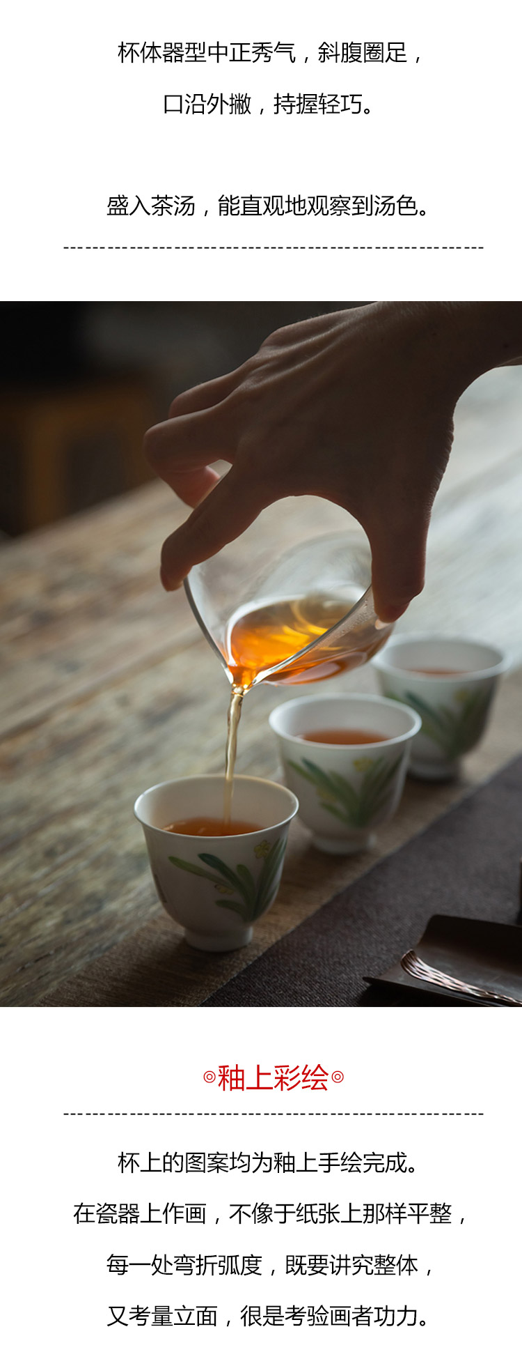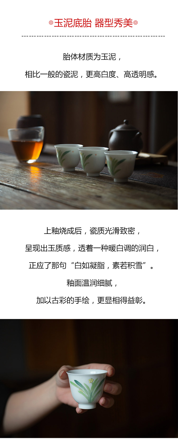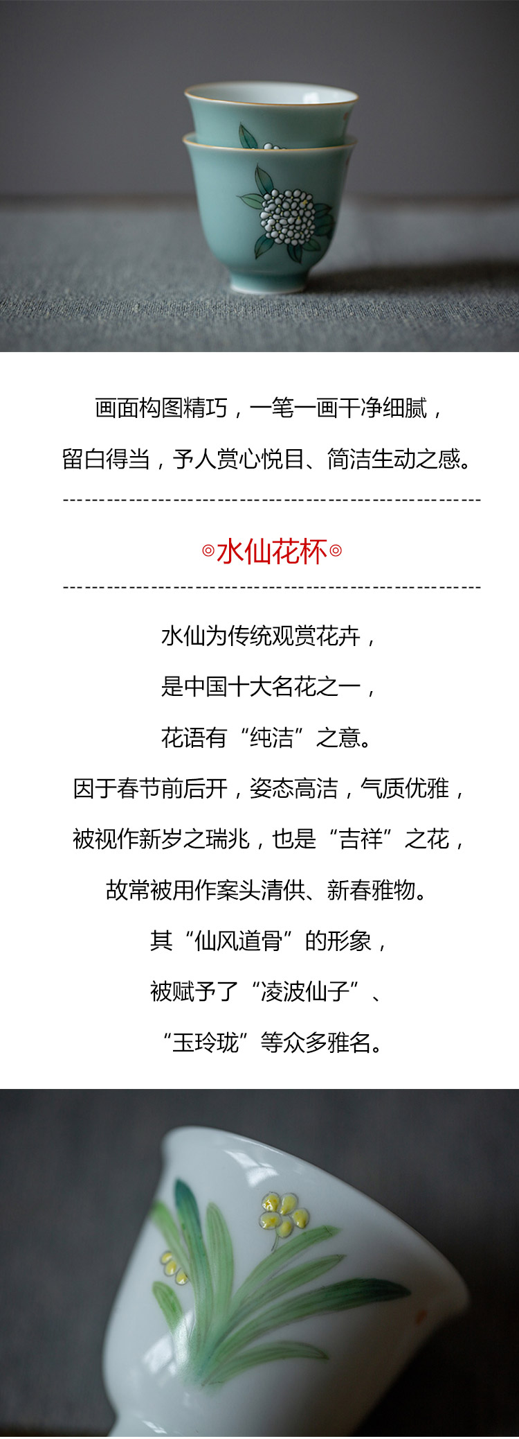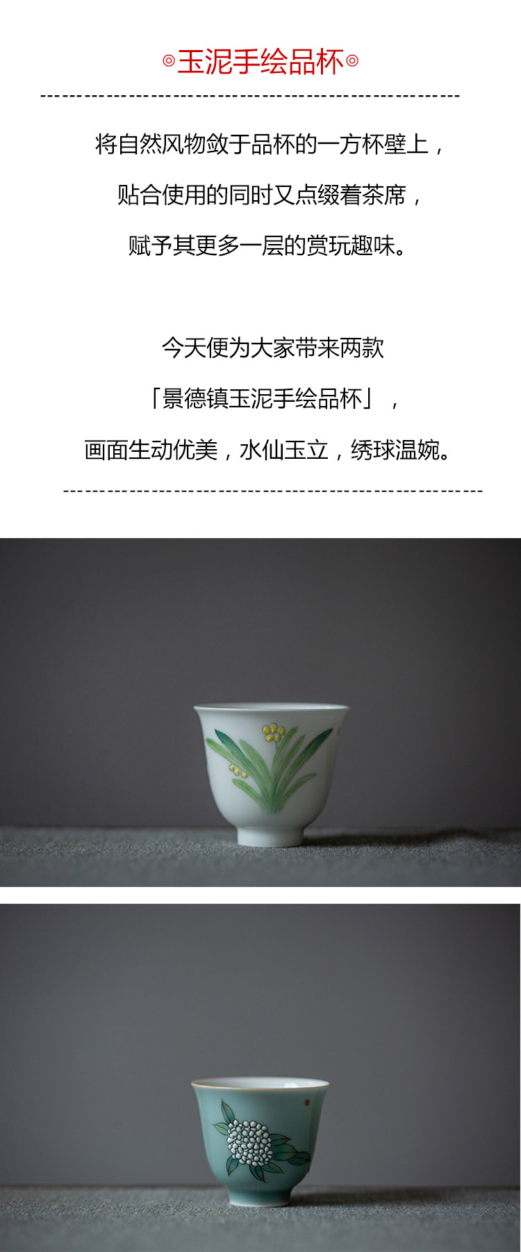 茶香记 景德镇玉泥手绘品杯水仙杯60ml手工陶瓷茶杯清新秀丽茶具