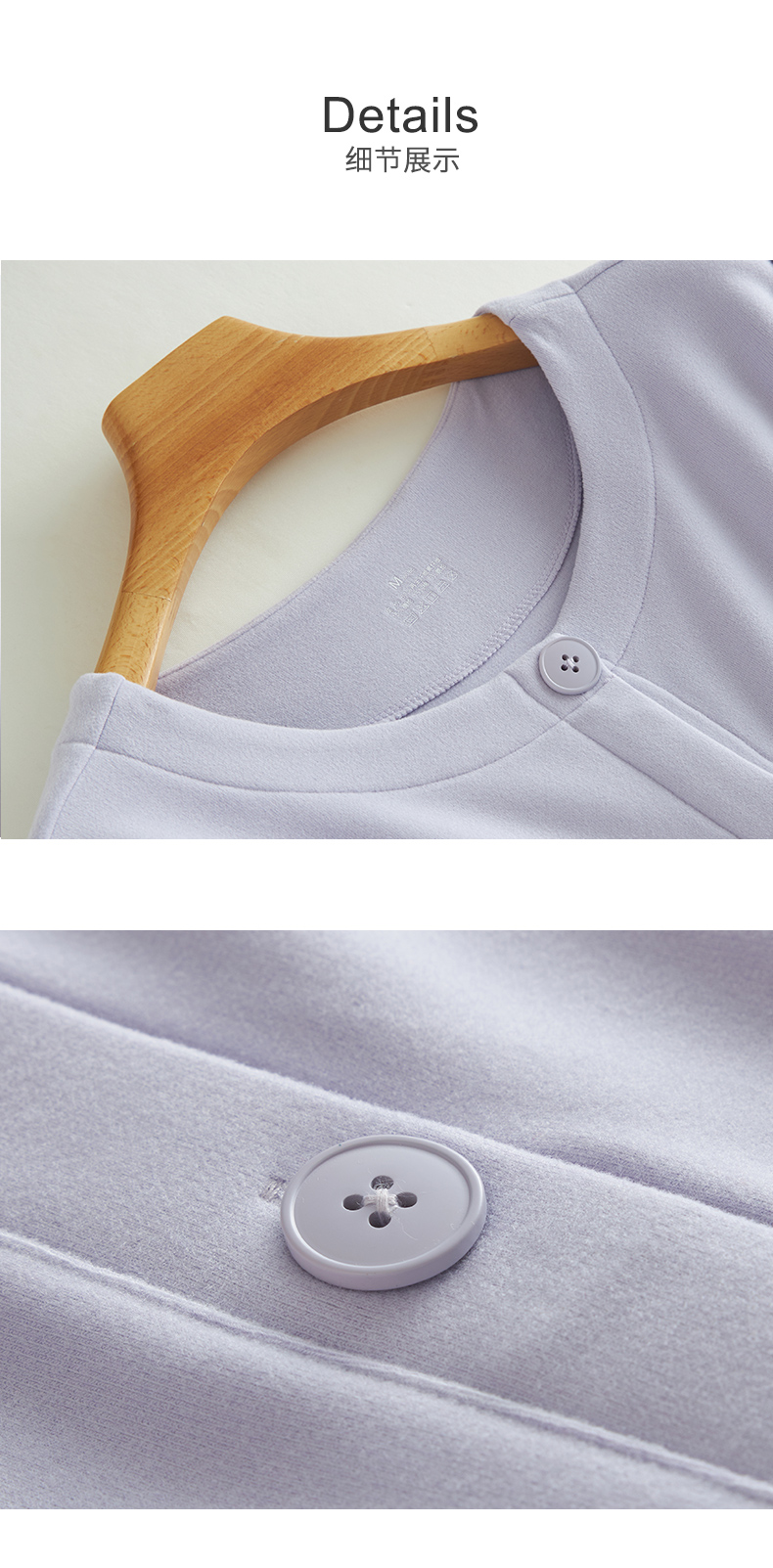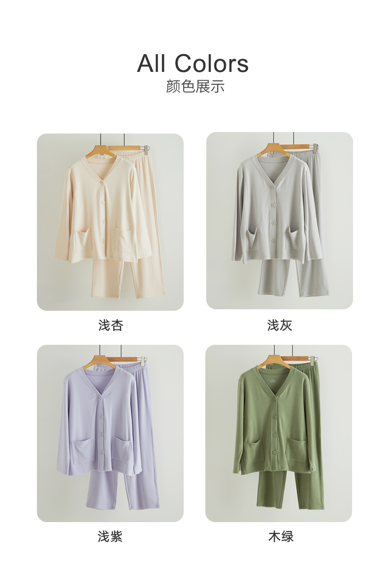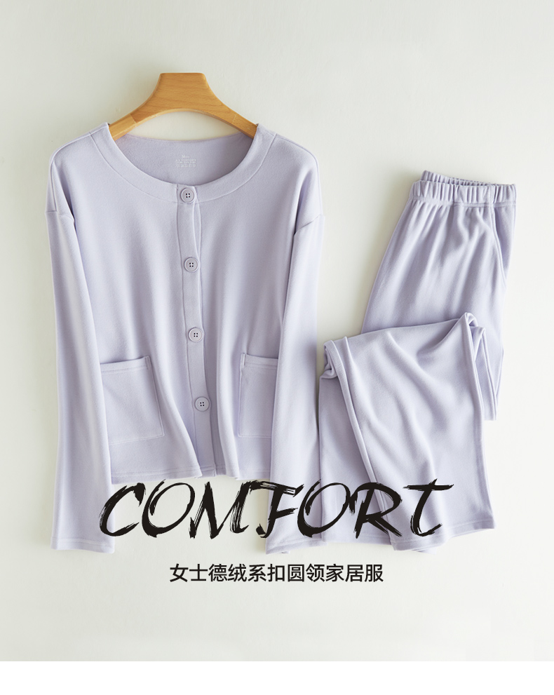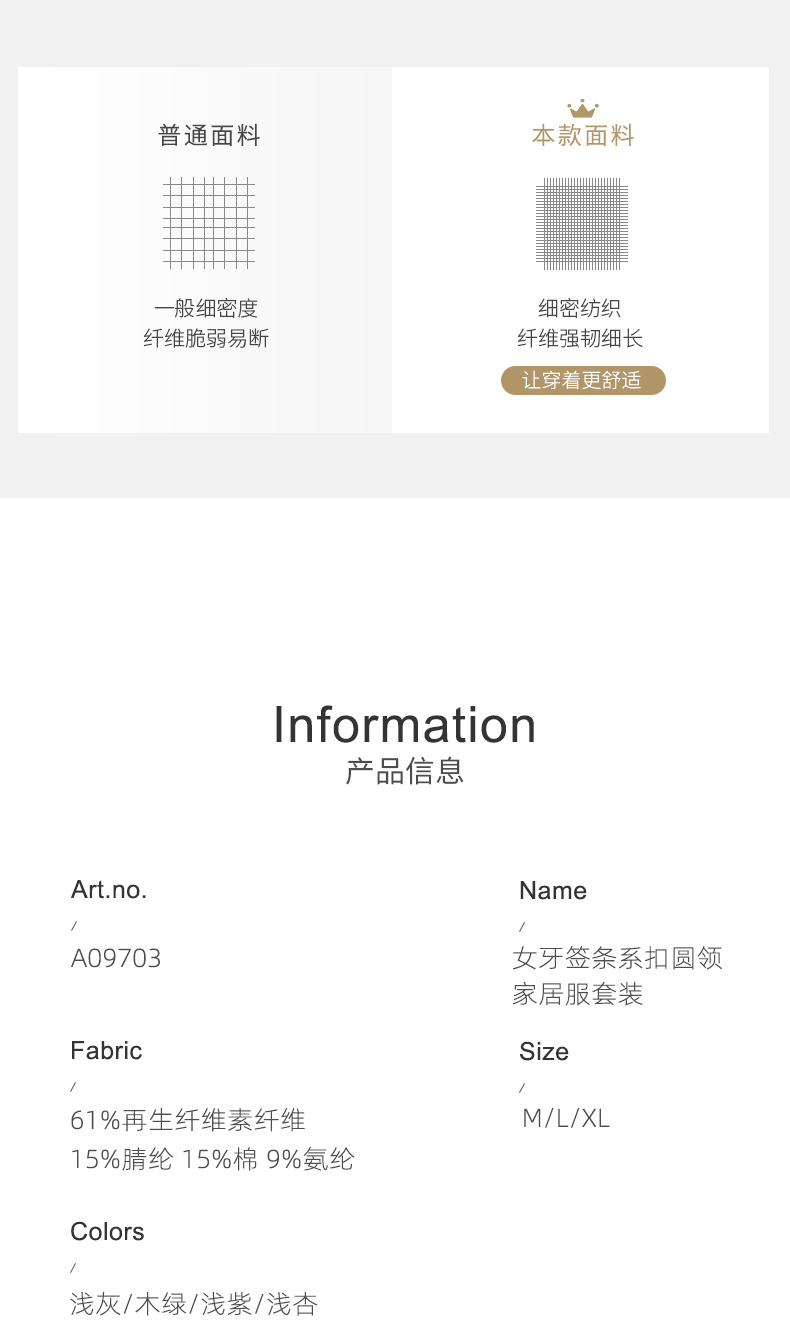 【宅家自由感】米馨悦 女牙签条系扣V领家居服套装-A09701 女牙签条系扣圆领家居服套装-A09703 高密纺织工艺 330g加厚弹力面料 无束缚好打理