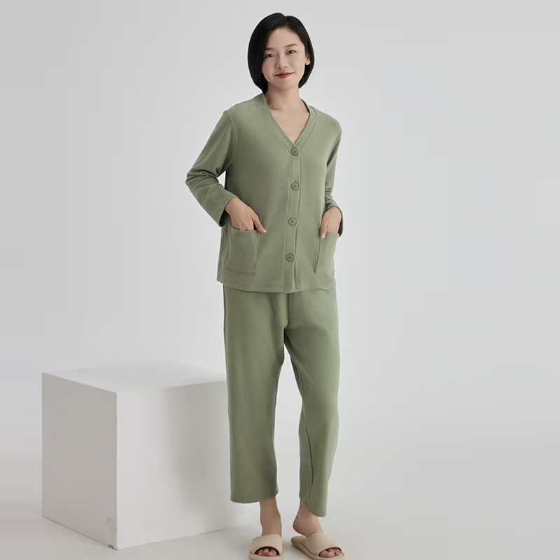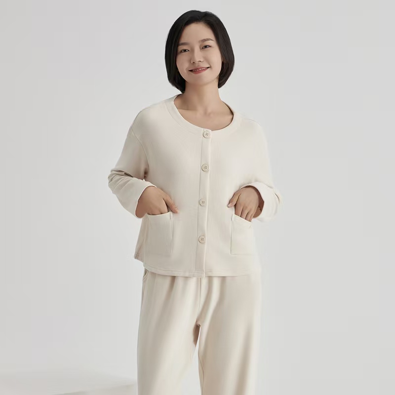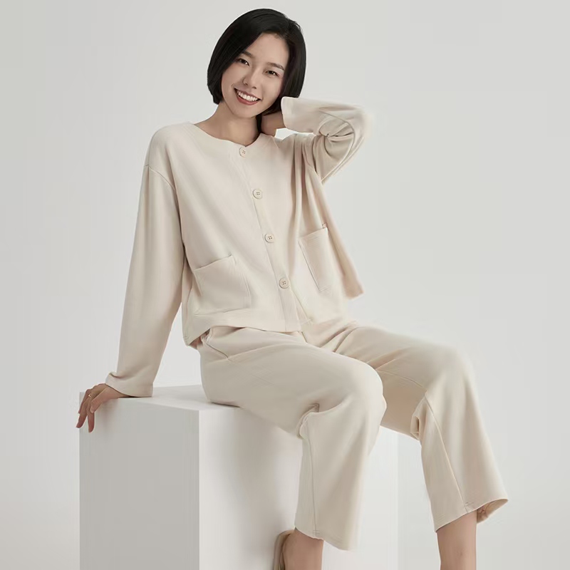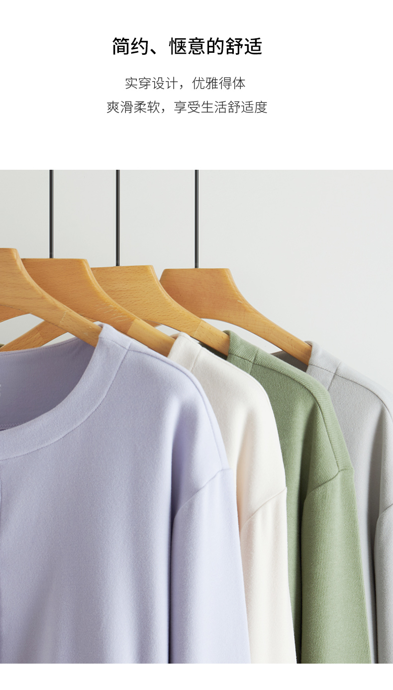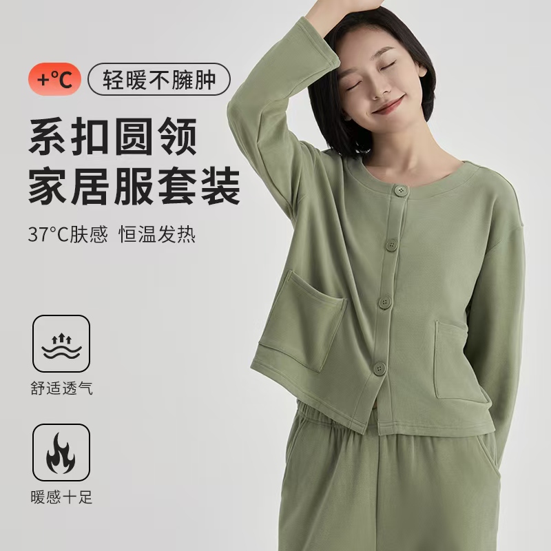 【宅家自由感】米馨悦 女牙签条系扣V领家居服套装-A09701 女牙签条系扣圆领家居服套装-A09703 高密纺织工艺 330g加厚弹力面料 无束缚好打理