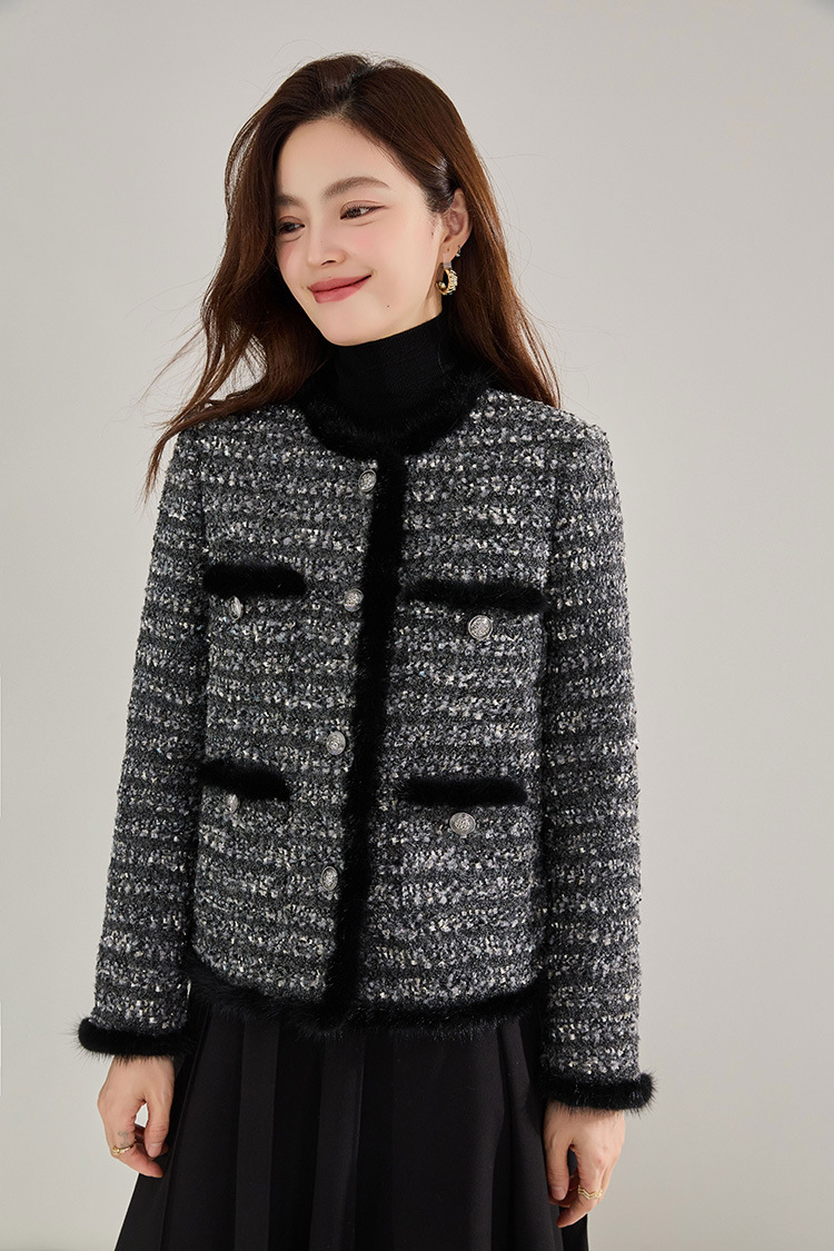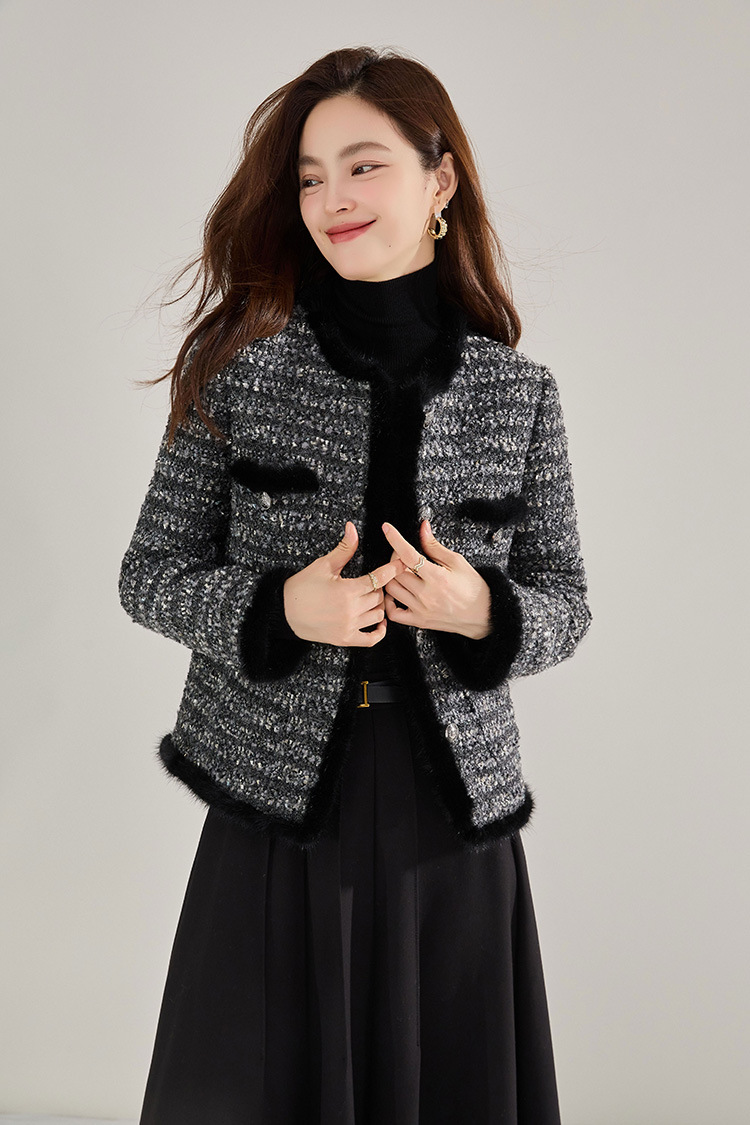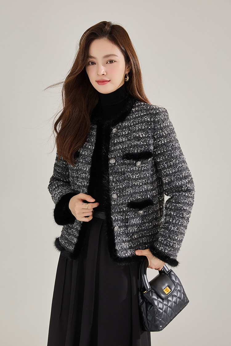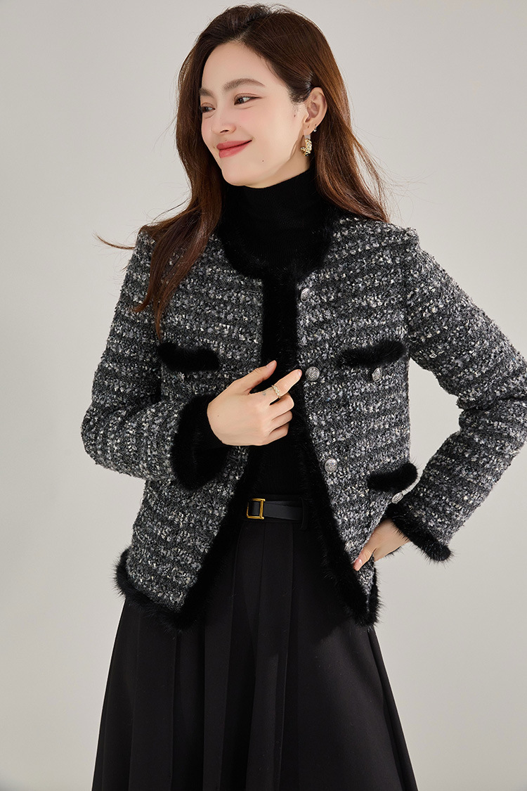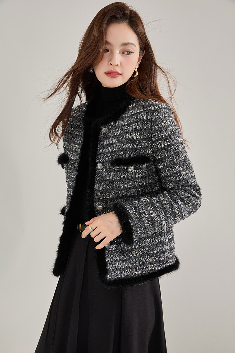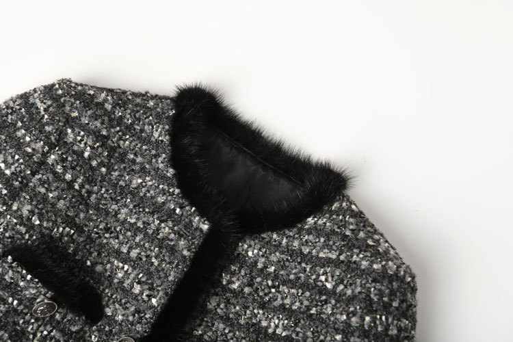 【高货sh】全新升级【铂金会员367/天猫489/差价122】(41808)洛诗琳秋冬小香风羊毛粗花呢水貂毛拼接白鸭绒羽绒服外套
