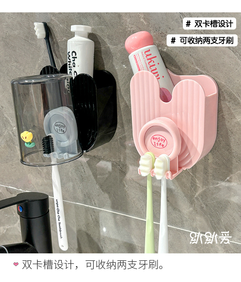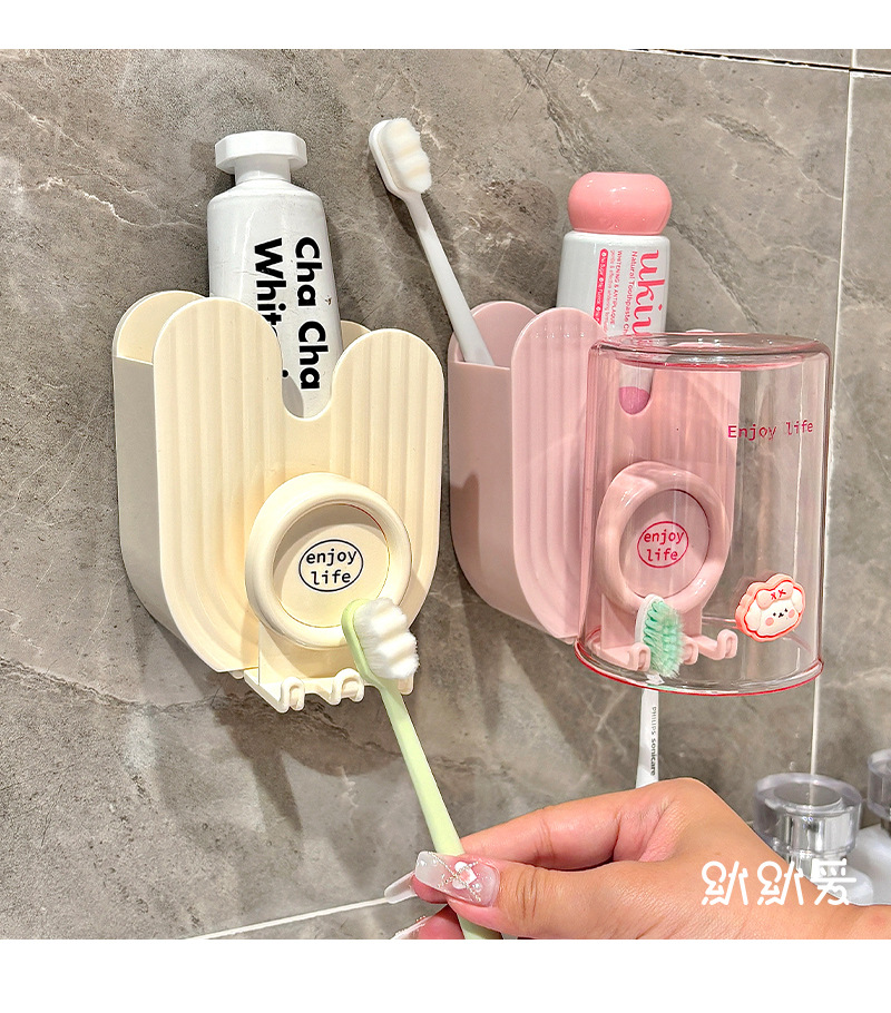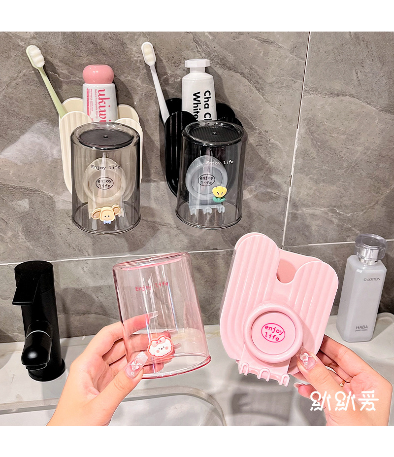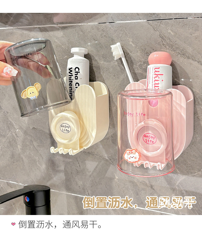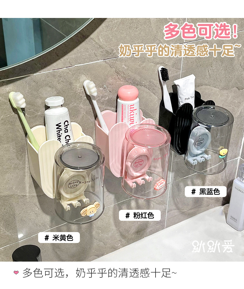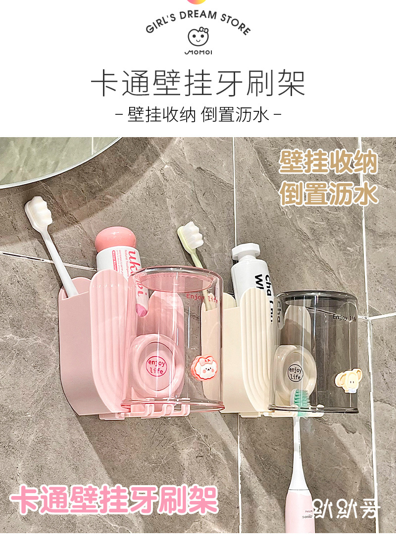 【卡通壁挂牙刷架,壁挂收纳,倒置沥水】电动牙刷漱口杯置物架 免打孔壁挂式 卫生间浴室牙膏刷牙杯收纳架子-QQ