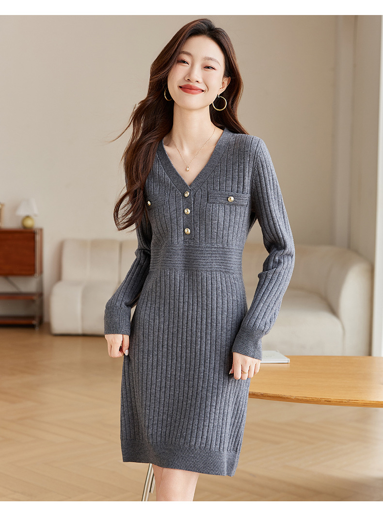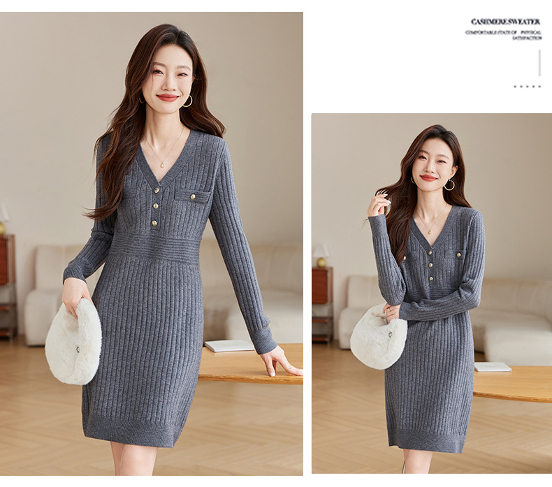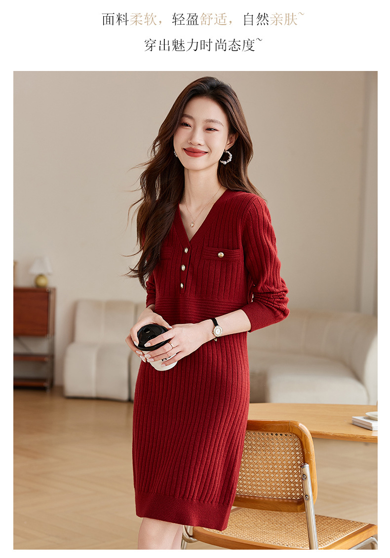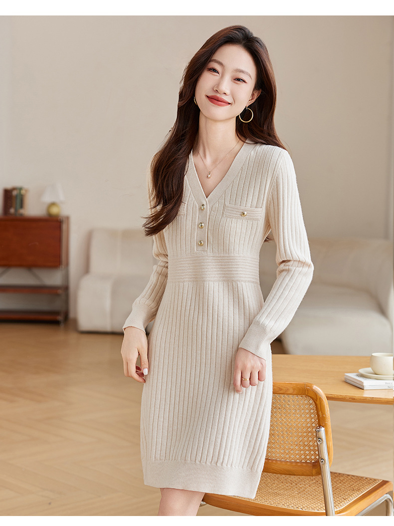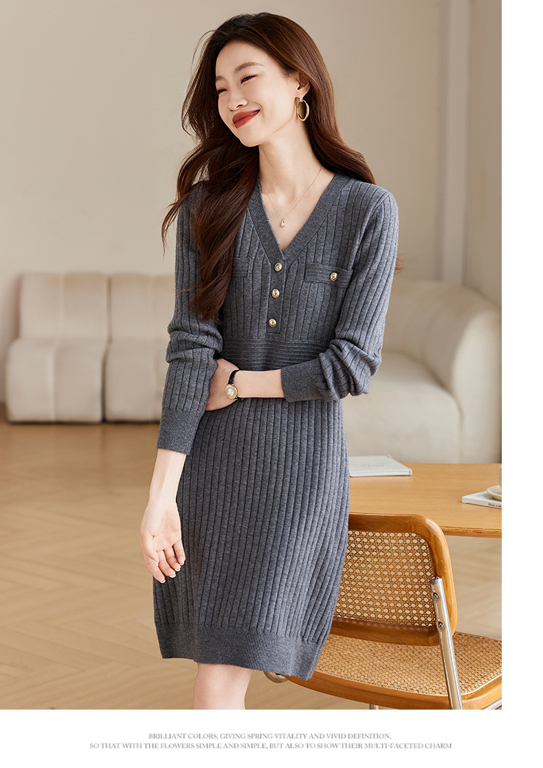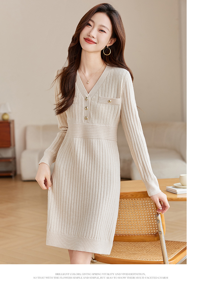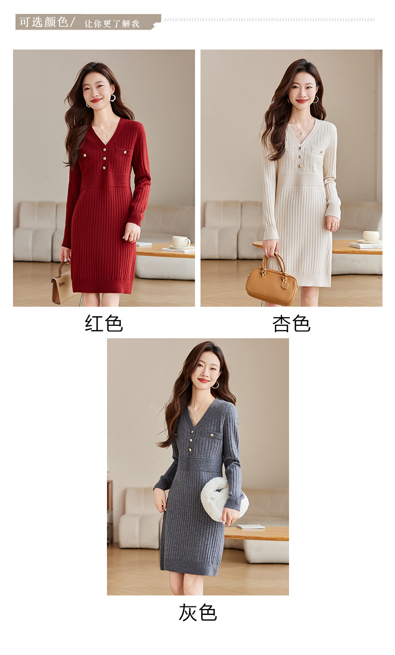 小香风气质V领针织连衣裙,纯色法式打底裙CC-J980