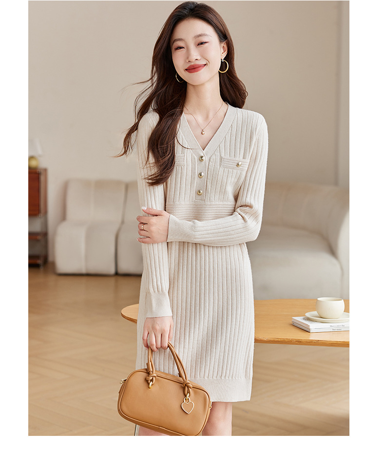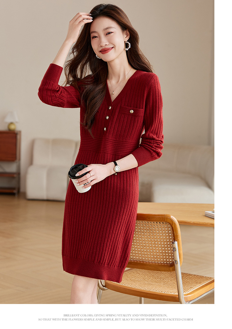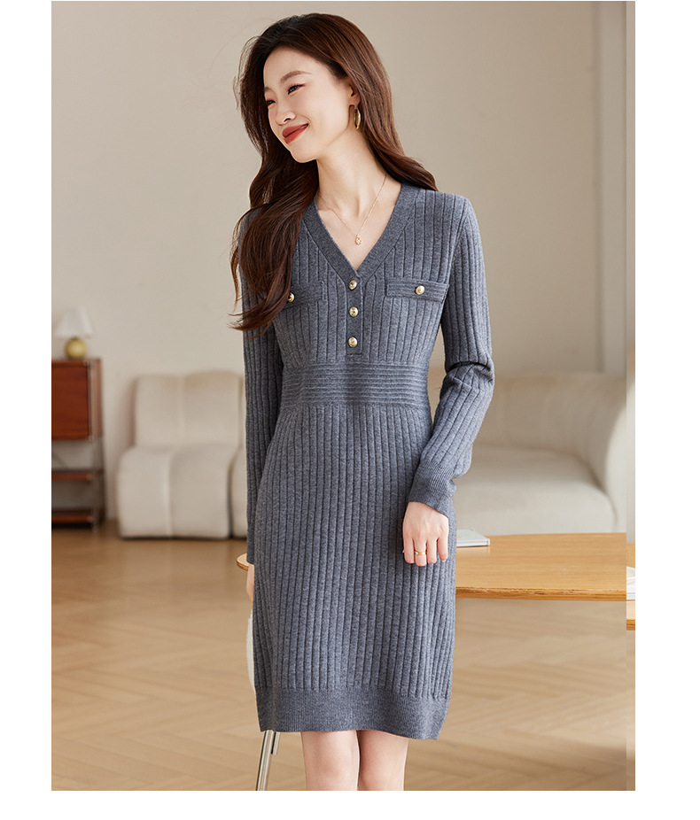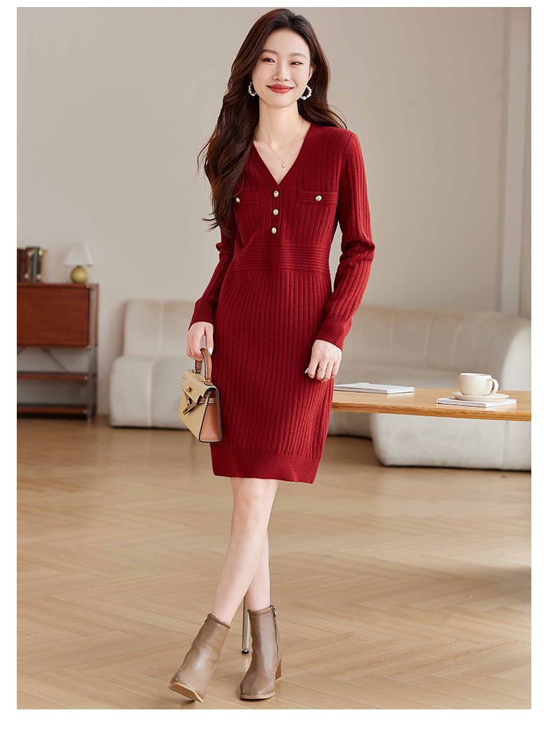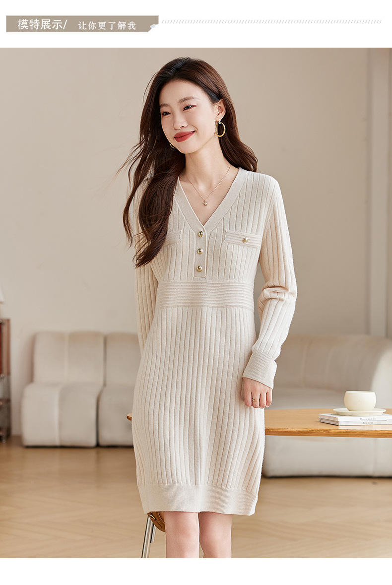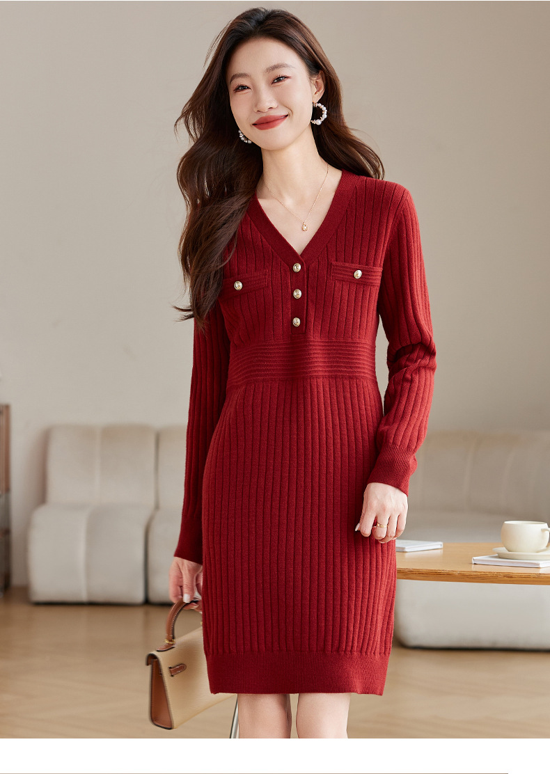 小香风气质V领针织连衣裙,纯色法式打底裙CC-J980