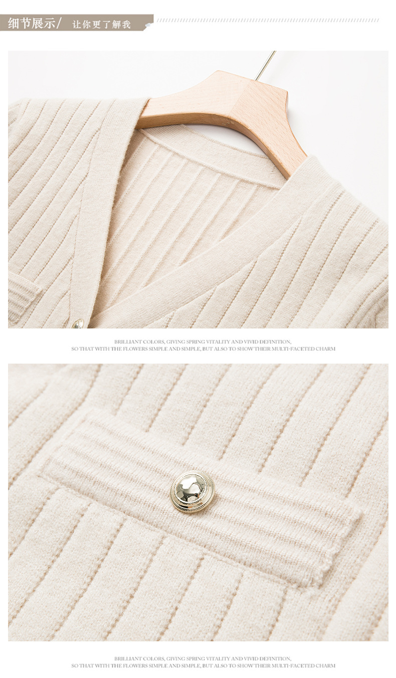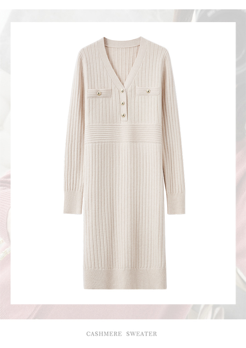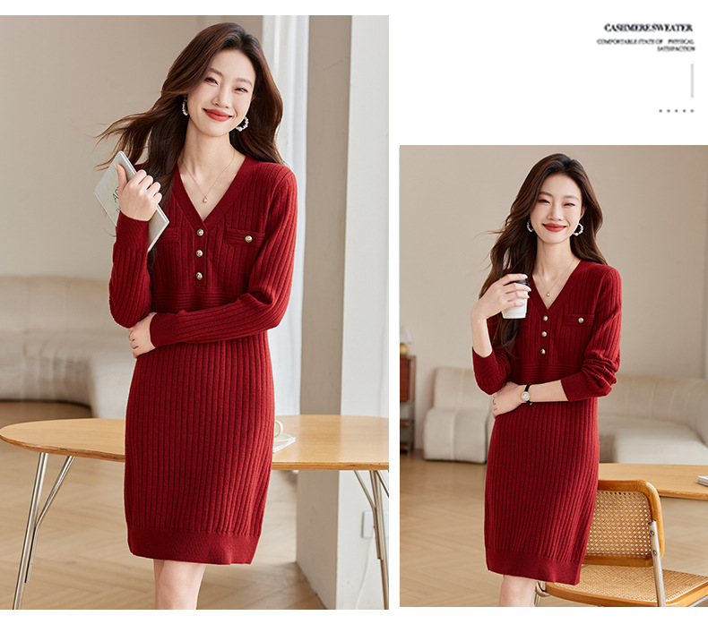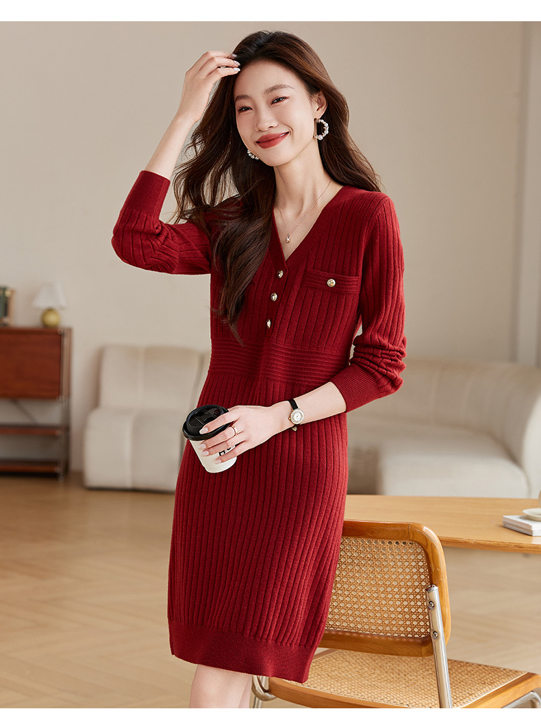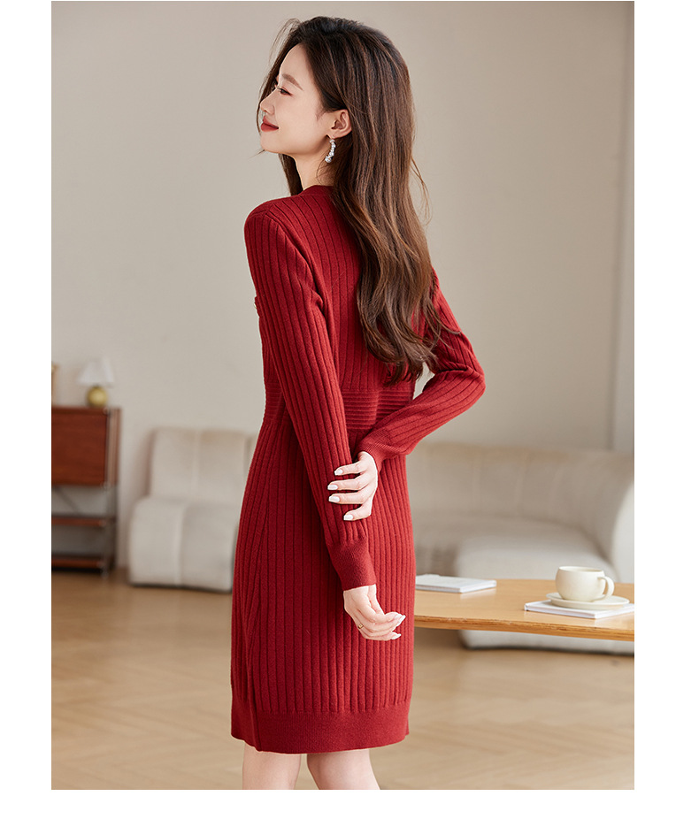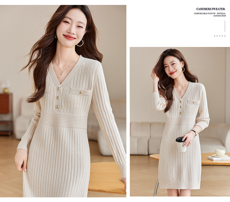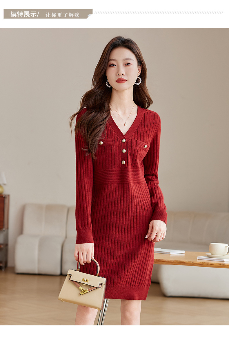 小香风气质V领针织连衣裙,纯色法式打底裙CC-J980