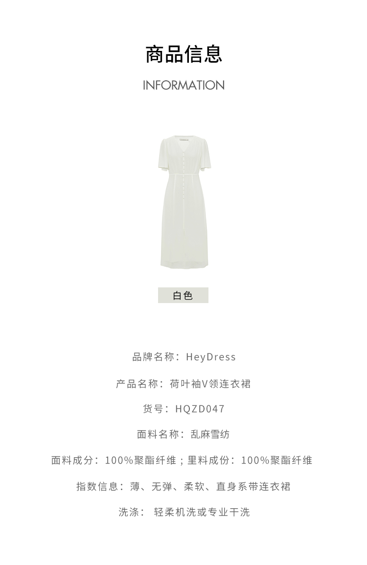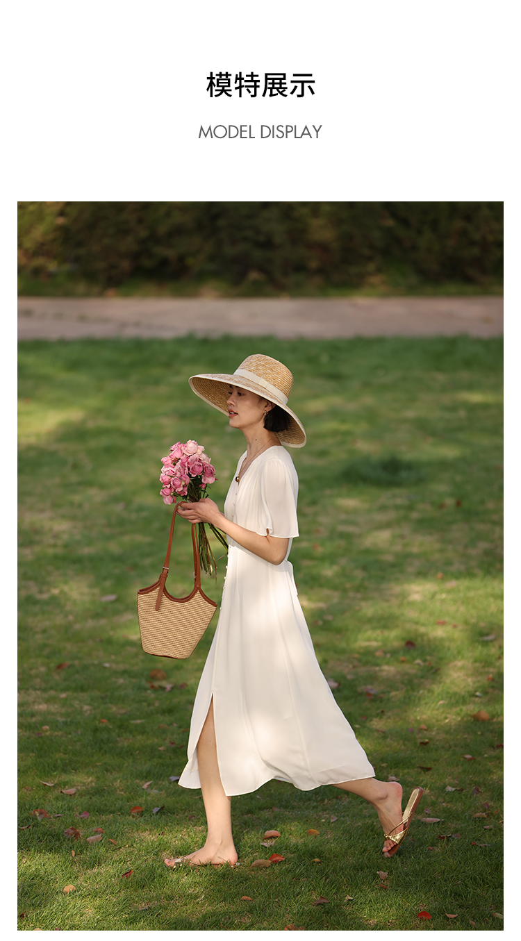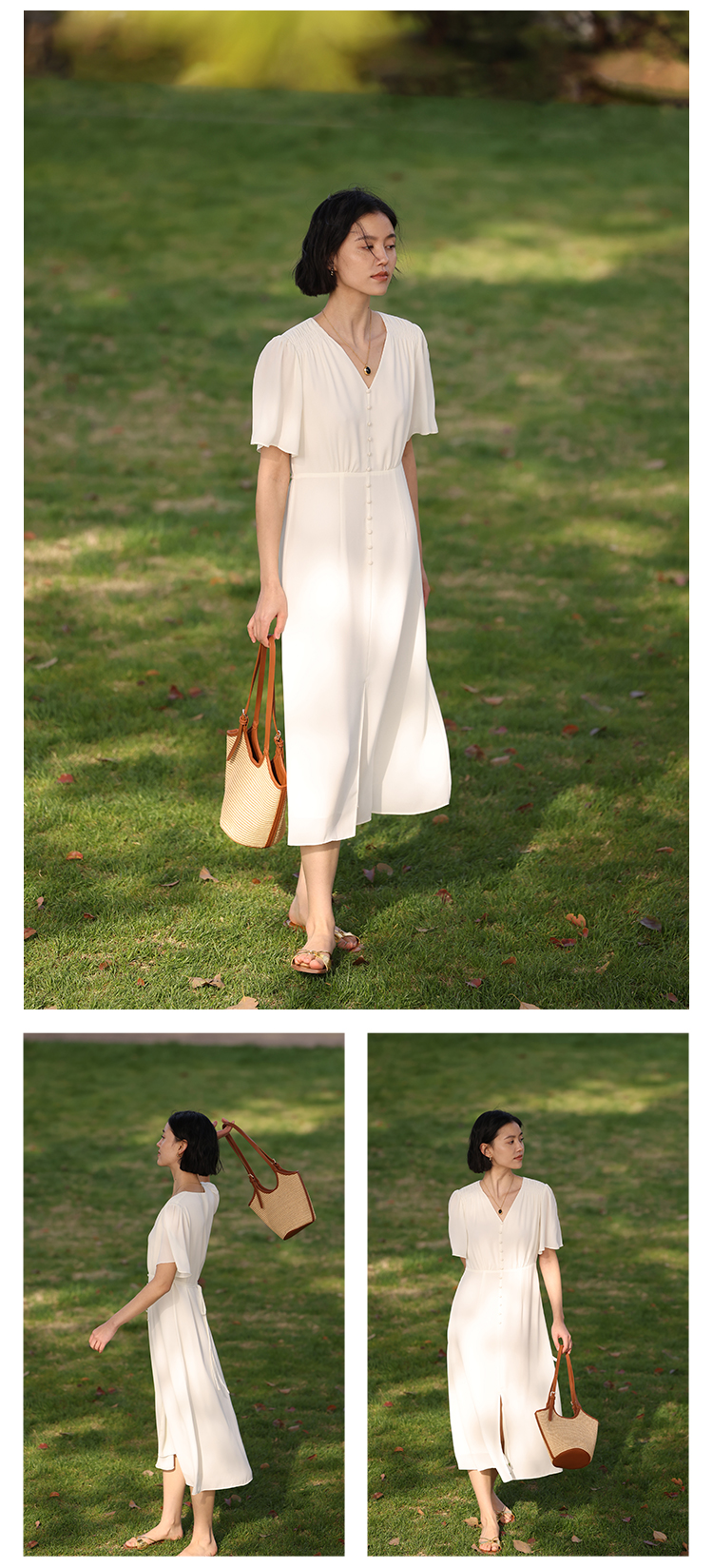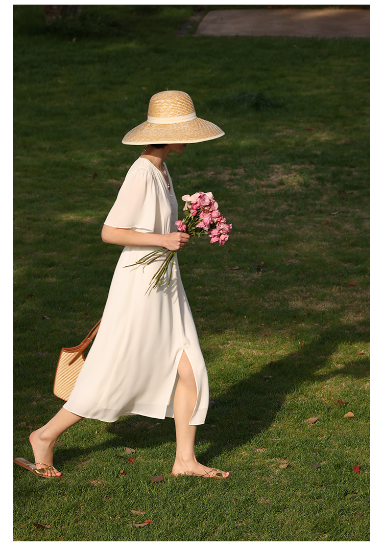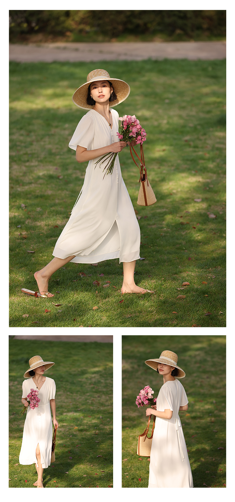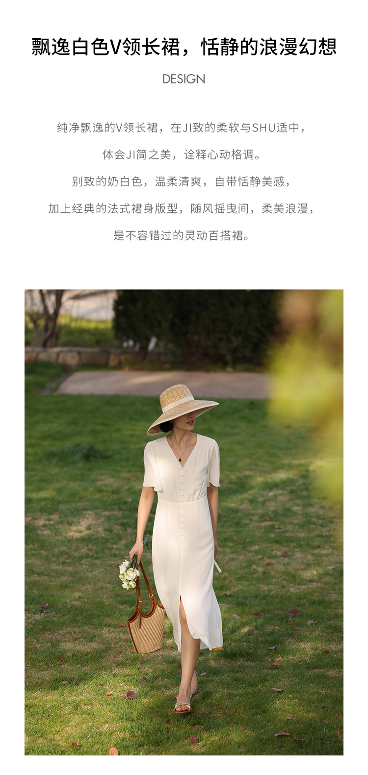 HeyDress法式V领连衣裙女夏季复古收腰开叉垂感白色气质初恋裙子