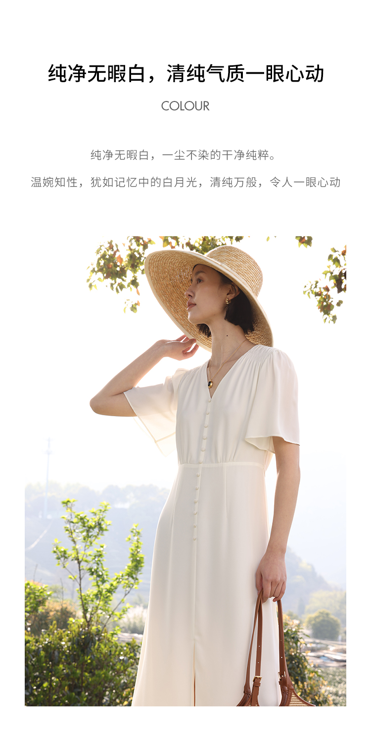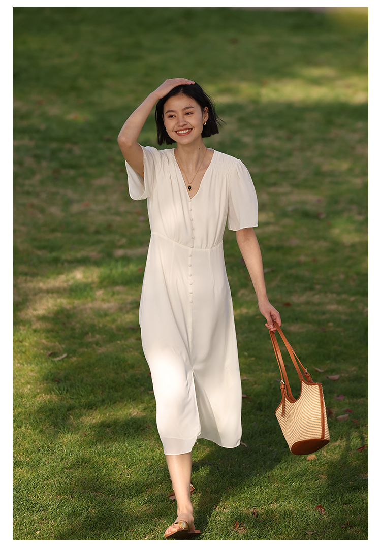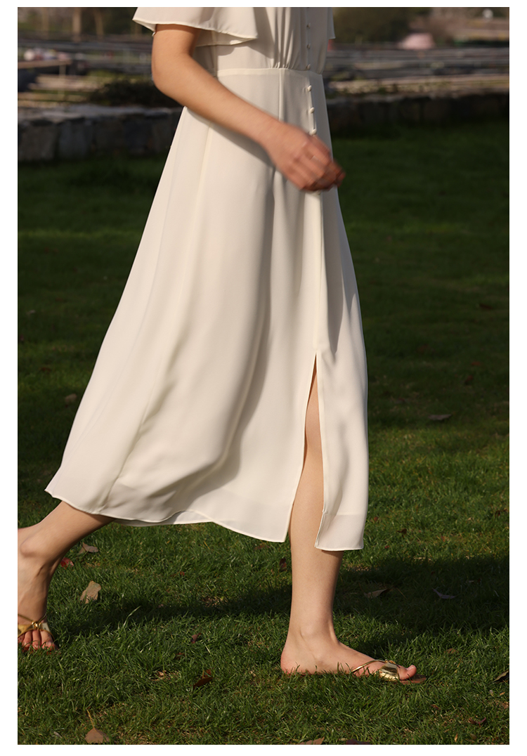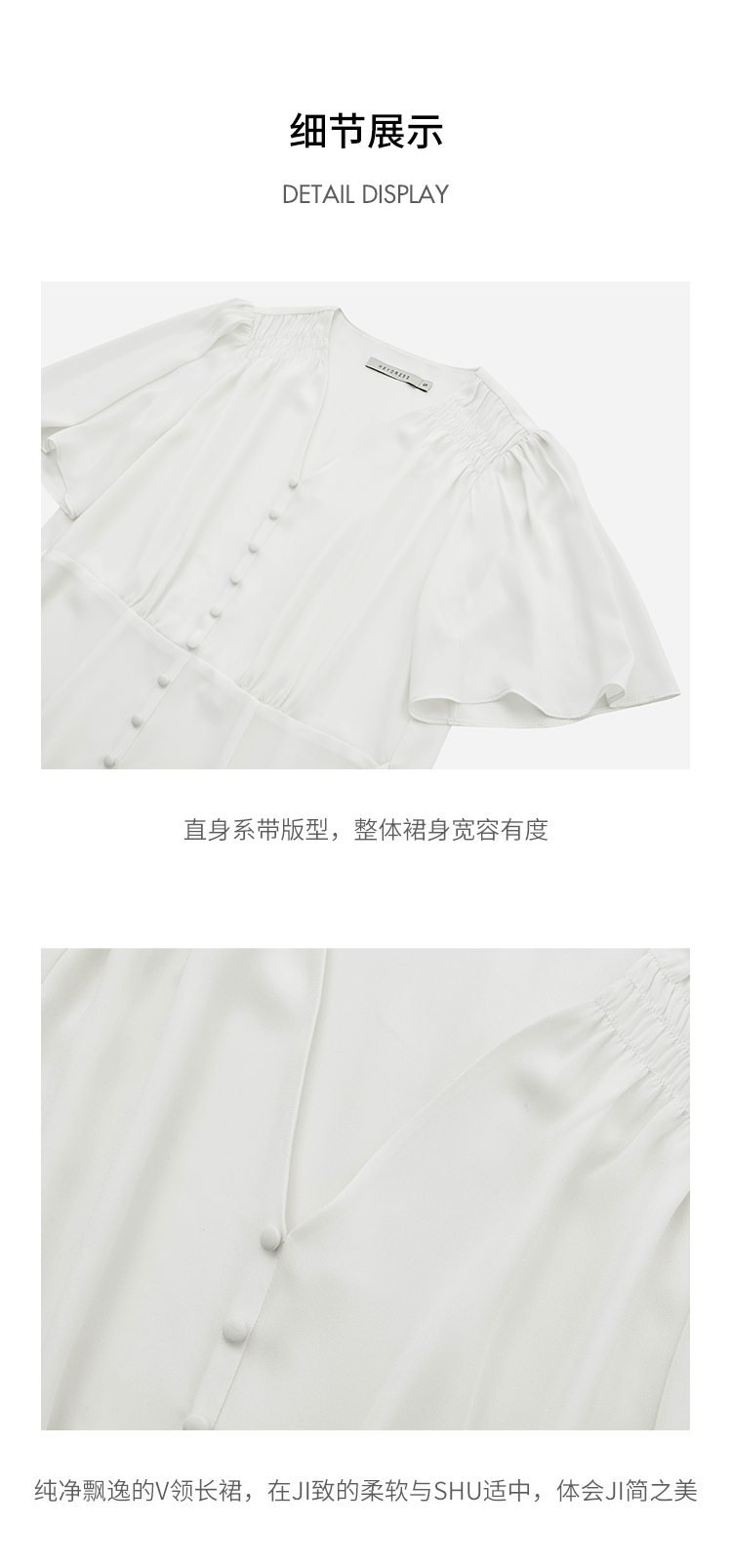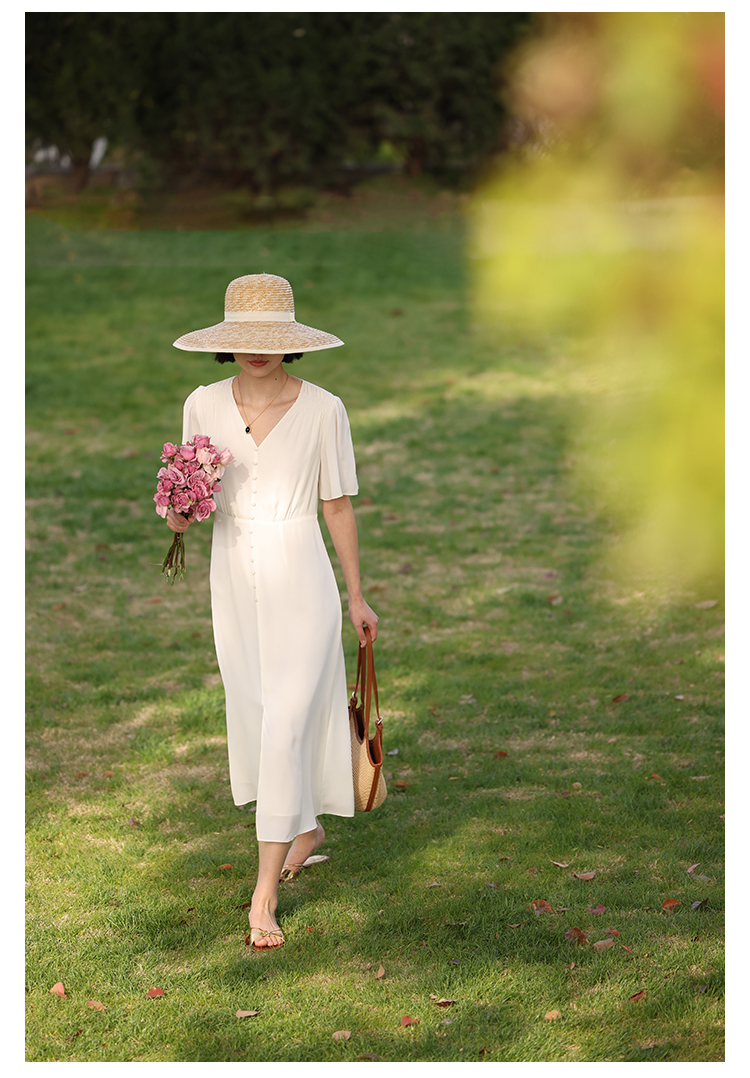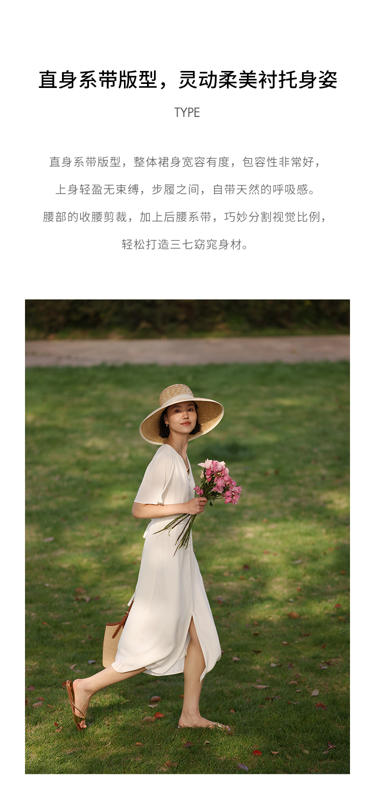 HeyDress法式V领连衣裙女夏季复古收腰开叉垂感白色气质初恋裙子
