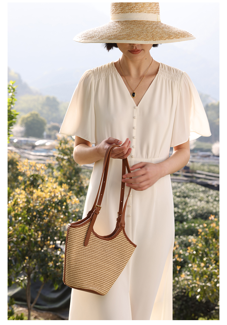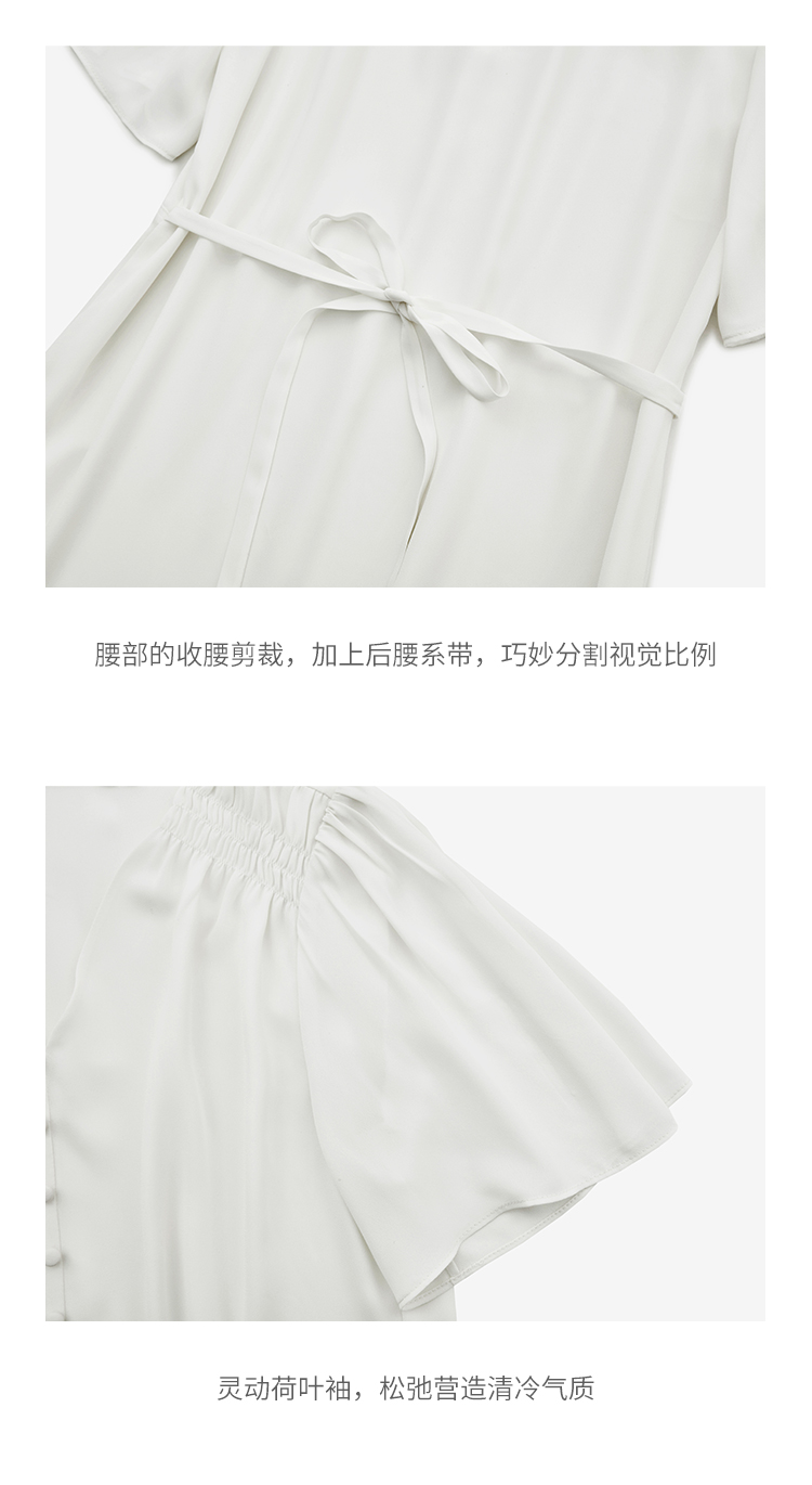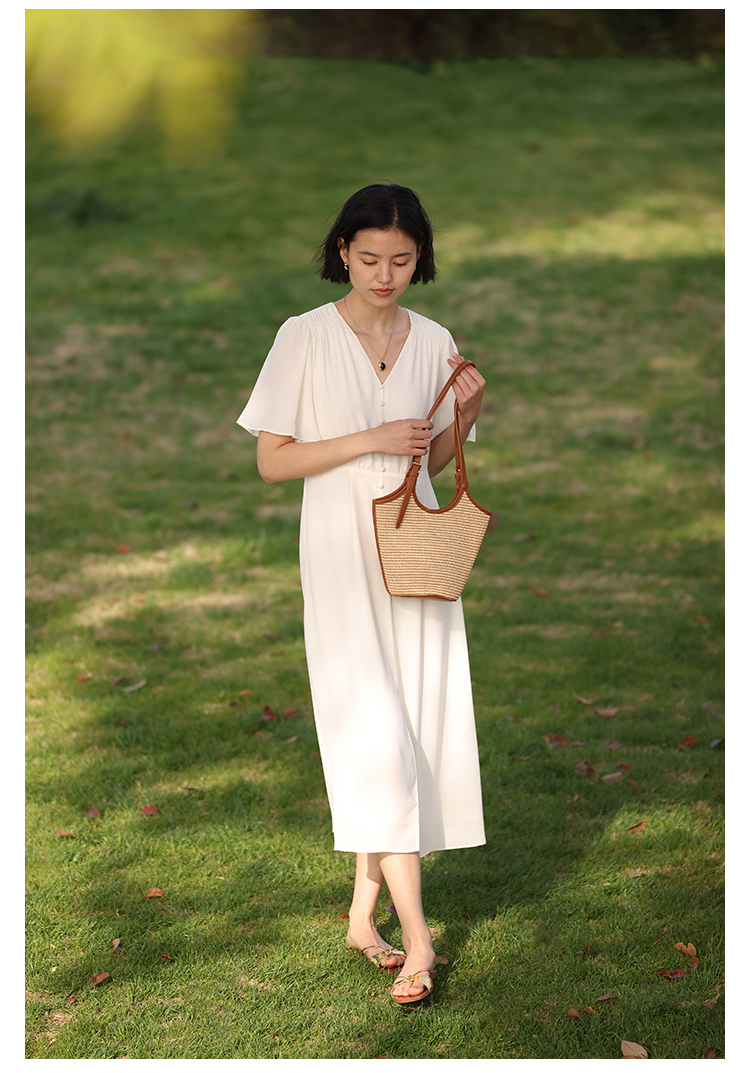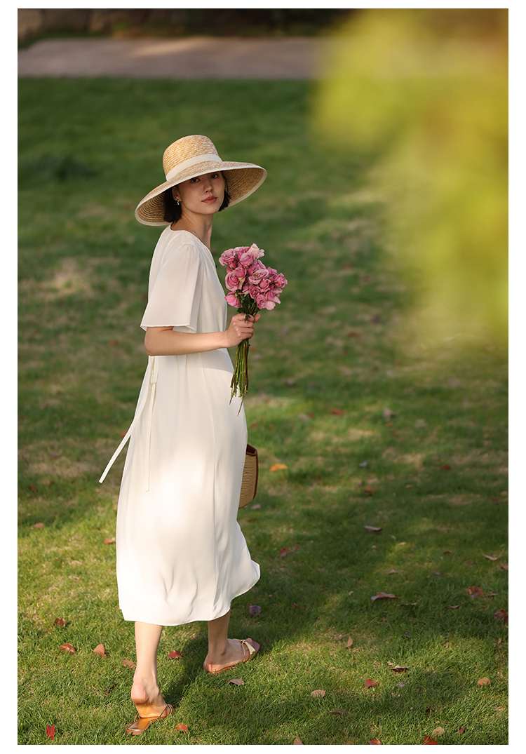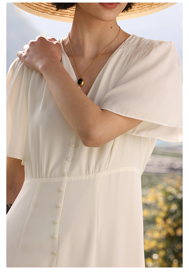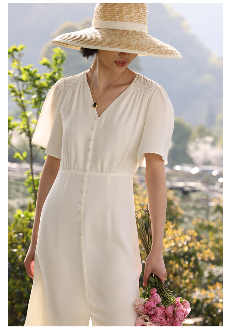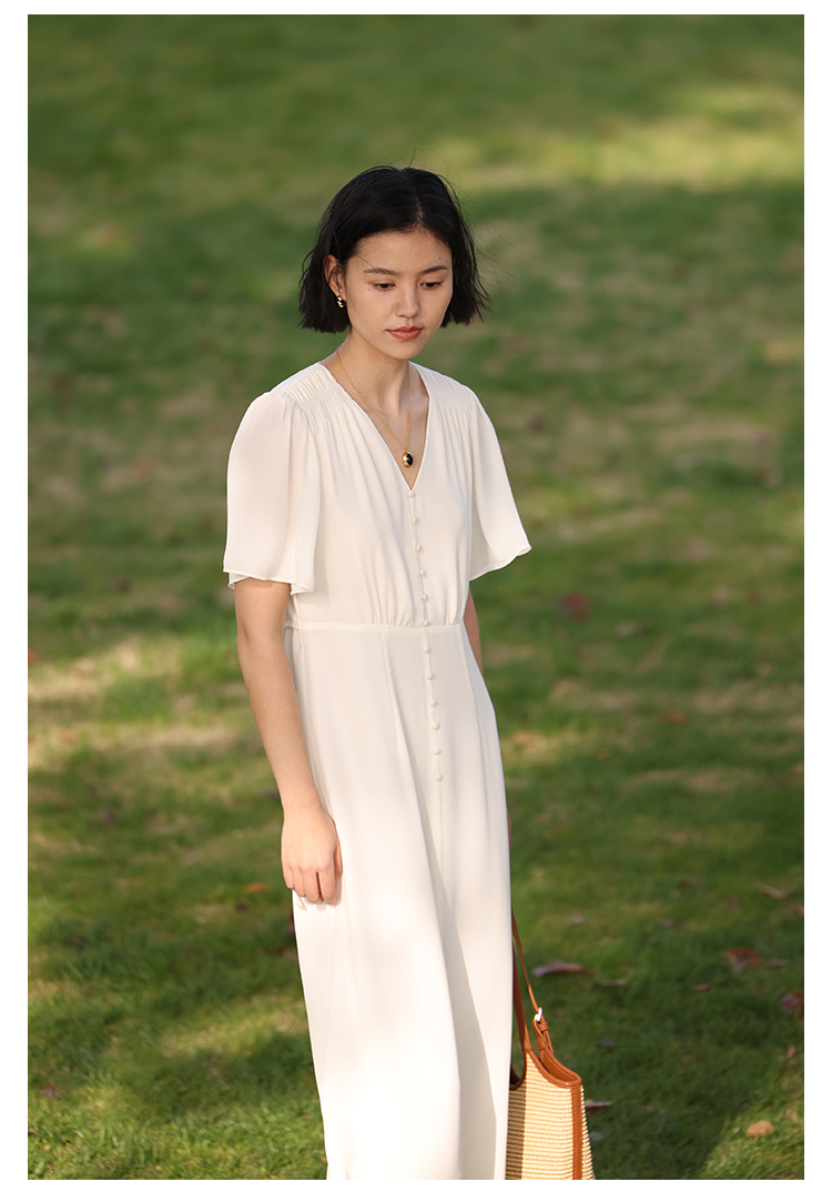 HeyDress法式V领连衣裙女夏季复古收腰开叉垂感白色气质初恋裙子