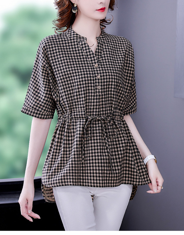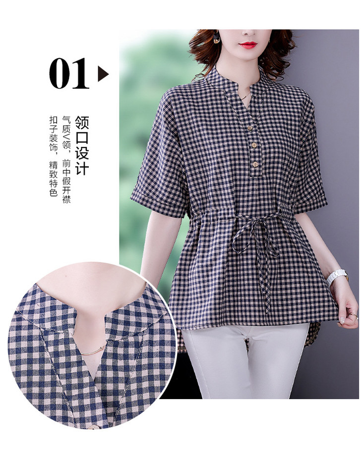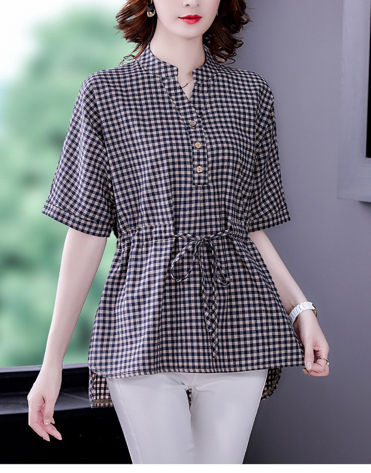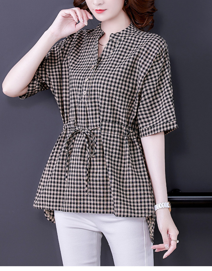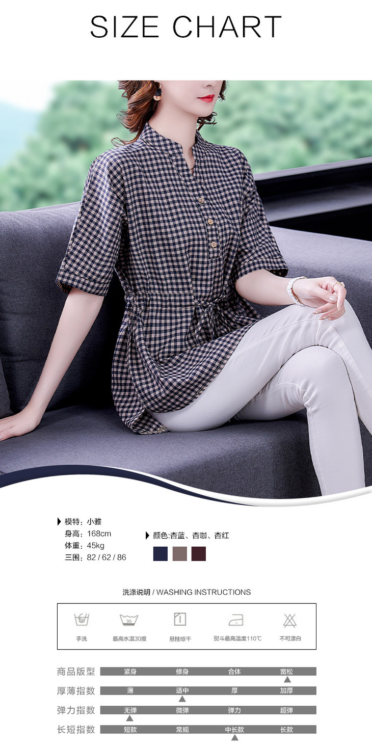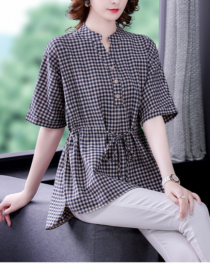 GYH 918时尚中长V领收腰显瘦系带棉麻格子衬衣