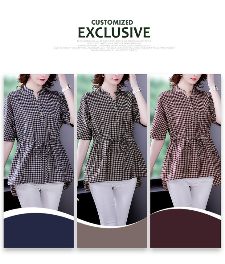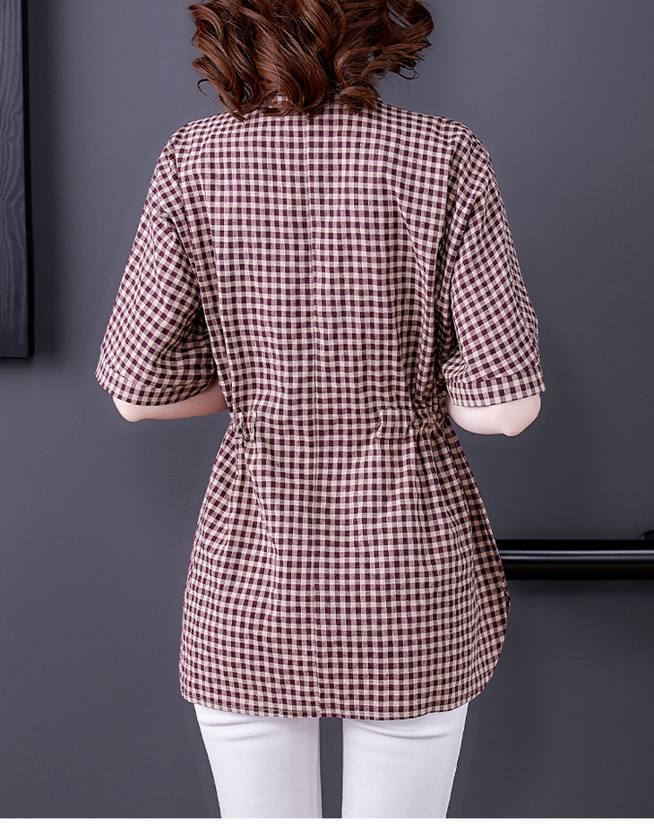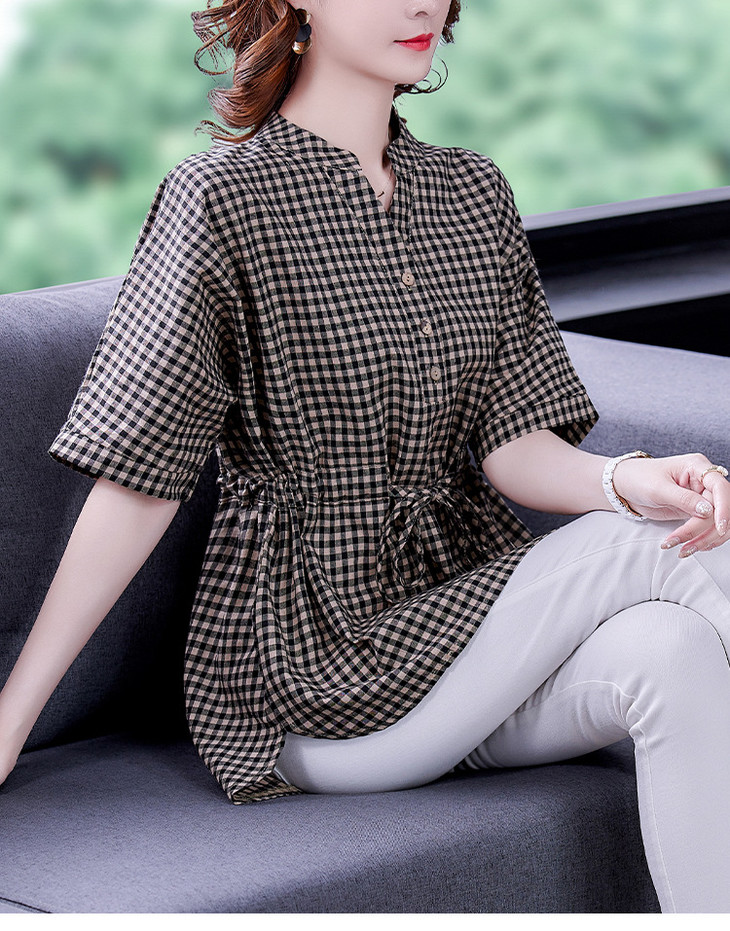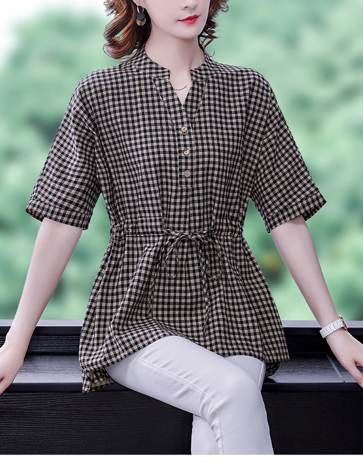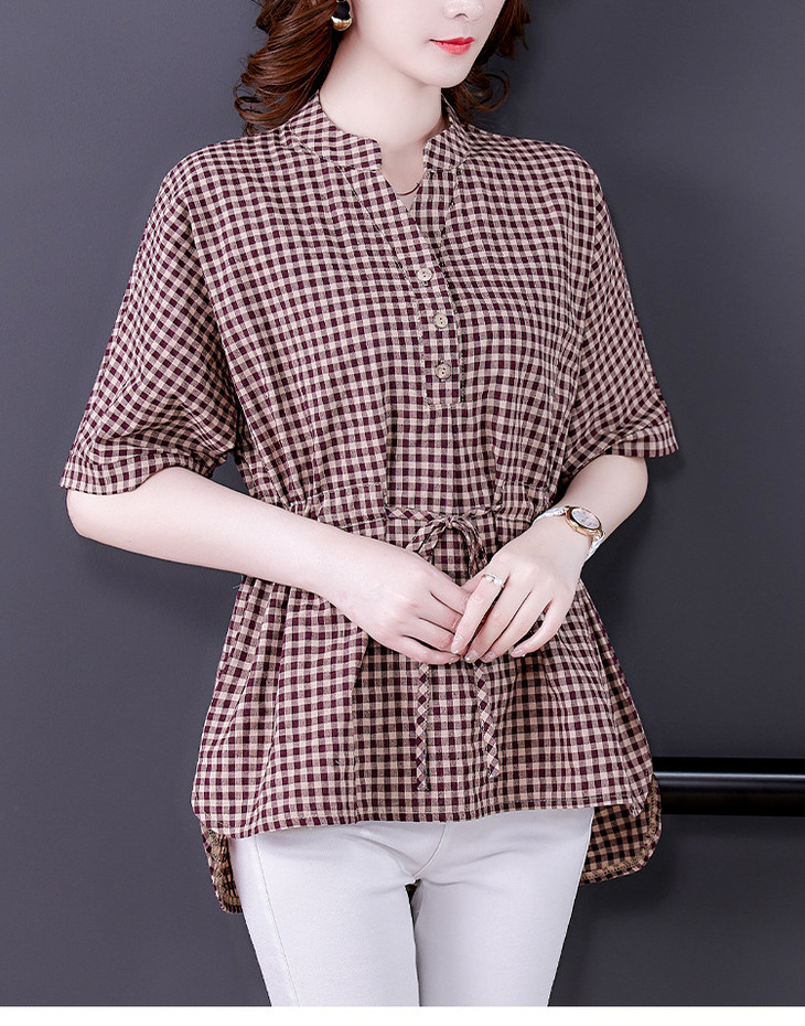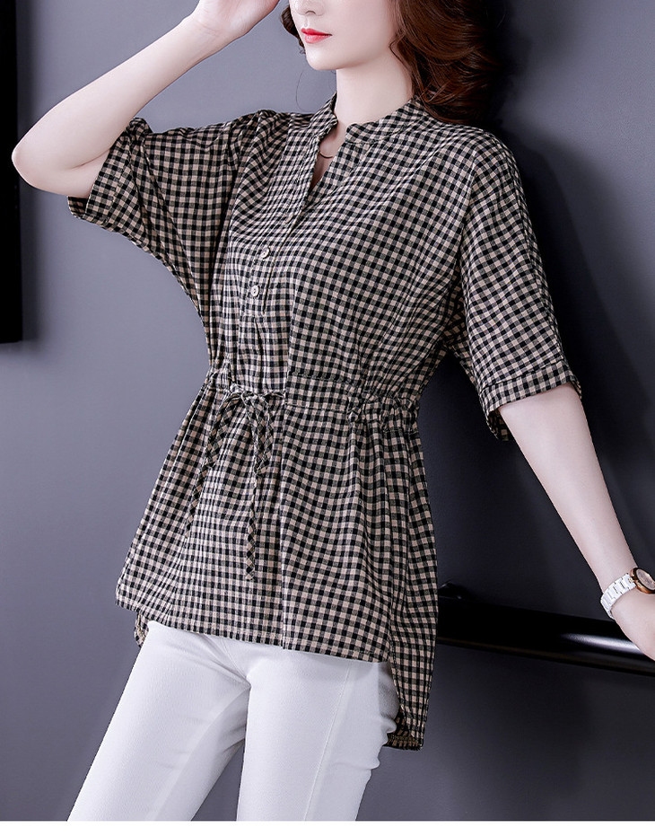 GYH 918时尚中长V领收腰显瘦系带棉麻格子衬衣