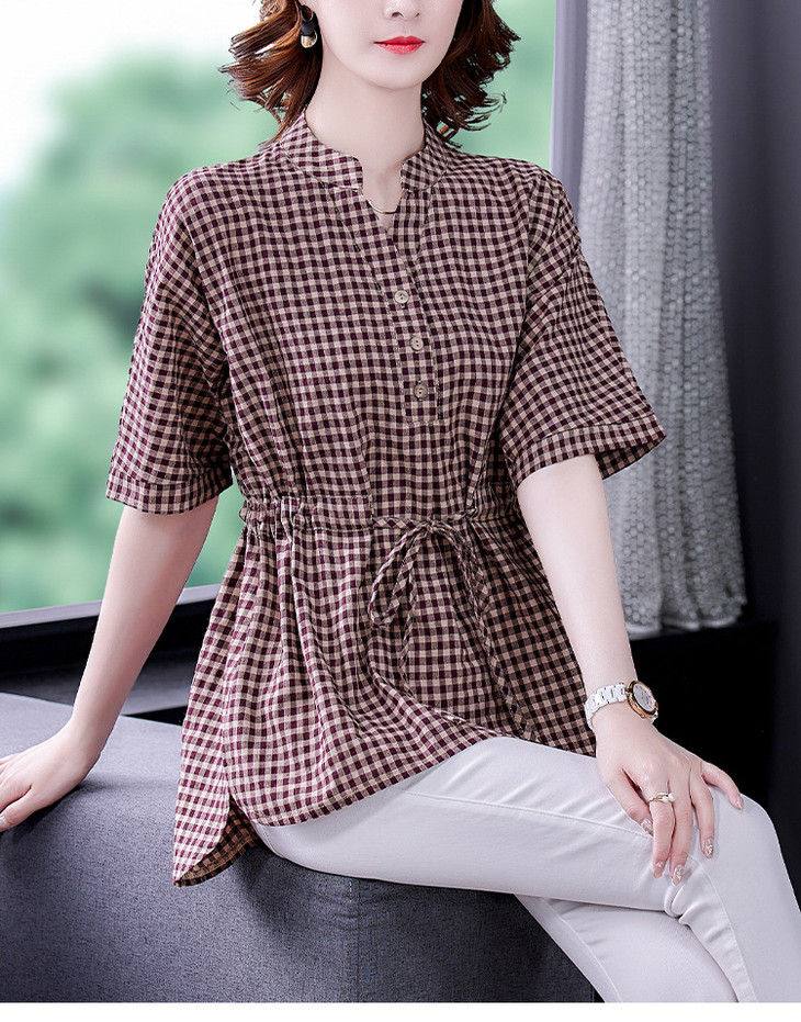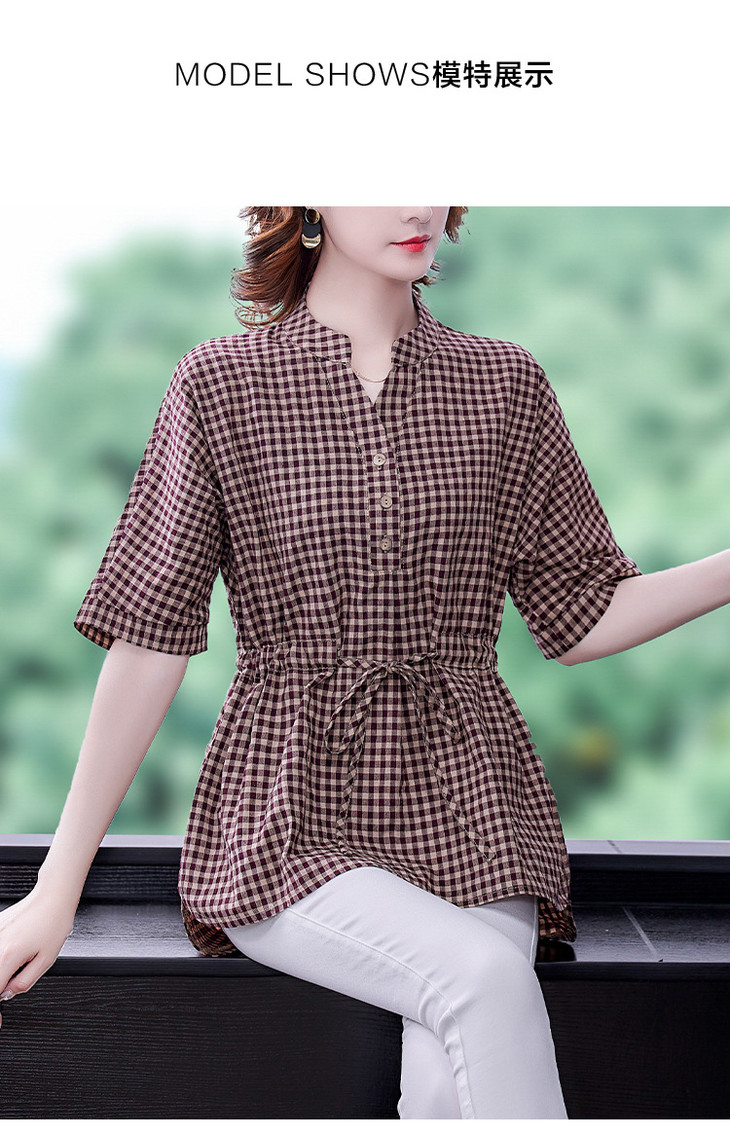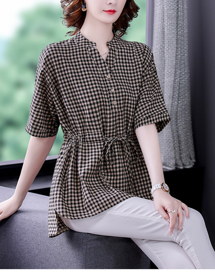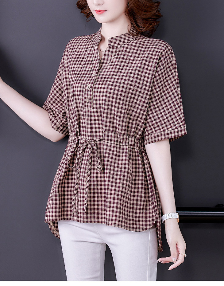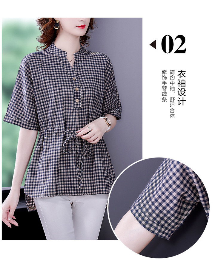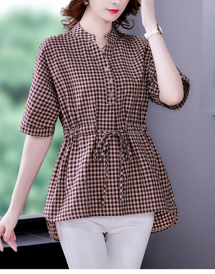 GYH 918时尚中长V领收腰显瘦系带棉麻格子衬衣