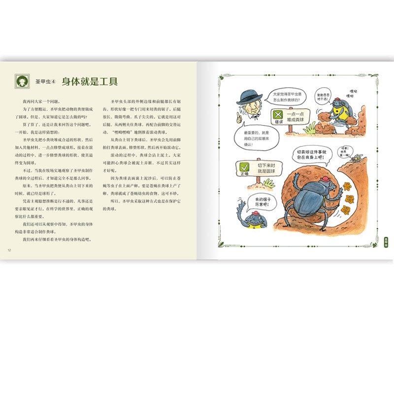 “如果把圣甲虫的粪球固定住,它会怎么做?”“对着鸣蝉放大炮,它会听见吗?”“雌蛾吸引雄蛾靠的是气味?”“蚂蚁认路靠的又是什么?”对于这些问题,很多人都会想当然给出答案,但法布尔却进行了一个个实验去接近真相。他还告诉我们:对待科学要采取“慎之又慎”的态度,从观察、提问、到设计实验,每一步都要独立思考、自主探索、亲眼见证,才能获得自然界真正的知识。