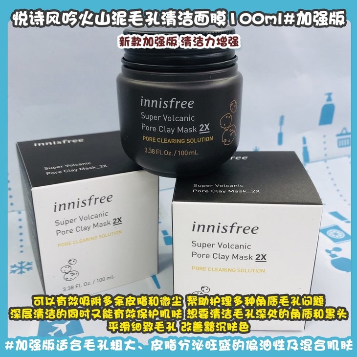 悦诗风吟火山泥毛孔清洁面膜100ml#加强版 👍新款加强版⬆,清洁力增强,改善了旧款质地干不好推的现象哦‼富含有济州岛火山泥成分🌋,可以有效吸附多余皮脂和微尘,帮助护理多种角质毛孔问题✔,深层清洁的同时又能有效保护肌肤。想要清洁毛孔深处的角质和黑头♻,平滑细致毛孔,改善黯沉肤色✨,都可以用它。#加强版适合毛孔粗大、皮脂分泌旺盛的偏油性及混合肌肤💪。